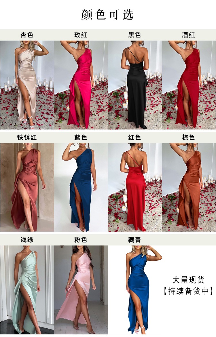 2025 유럽과 미국 아마존 여름 새로운 디자인 감각 기질 섹시한 슬림 비스듬한 어깨 스플릿 새틴 원피스 여성스토어 가기