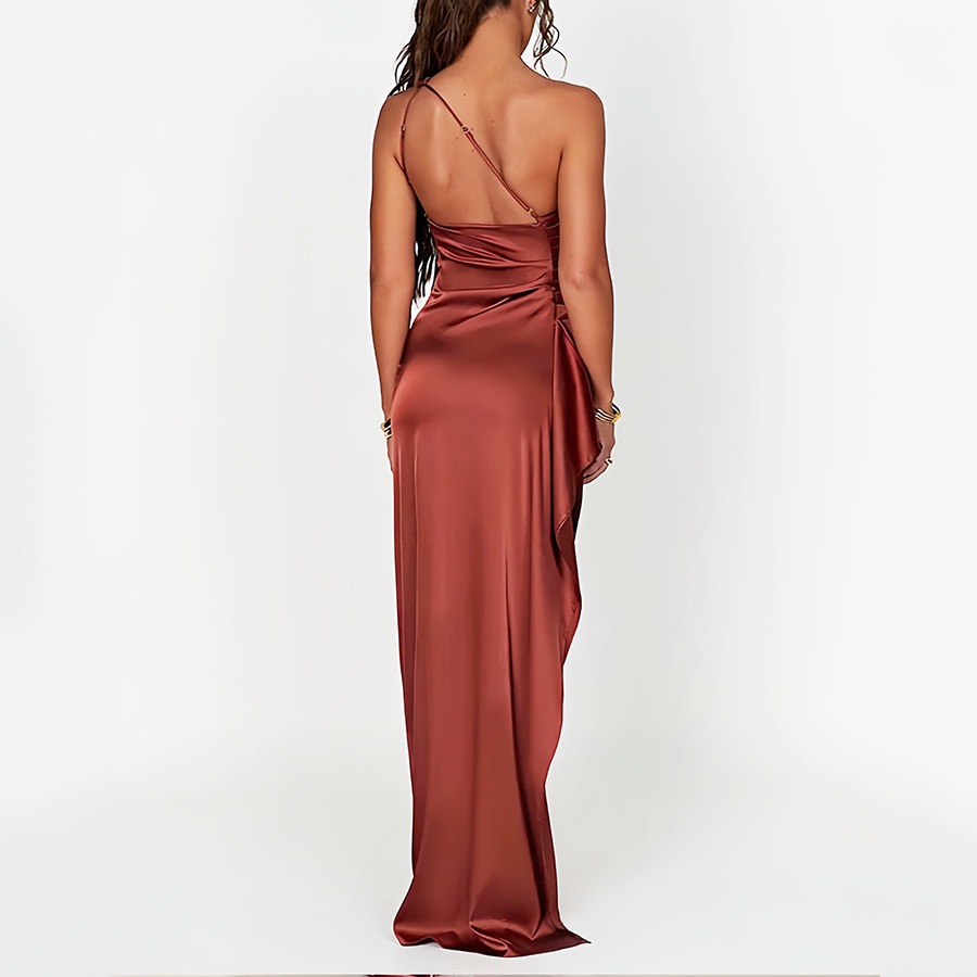 2025 유럽과 미국 아마존 여름 새로운 디자인 감각 기질 섹시한 슬림 비스듬한 어깨 스플릿 새틴 원피스 여성