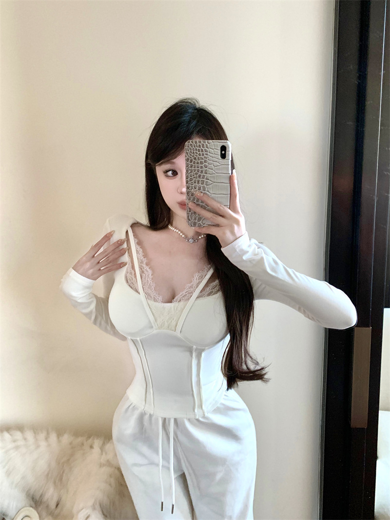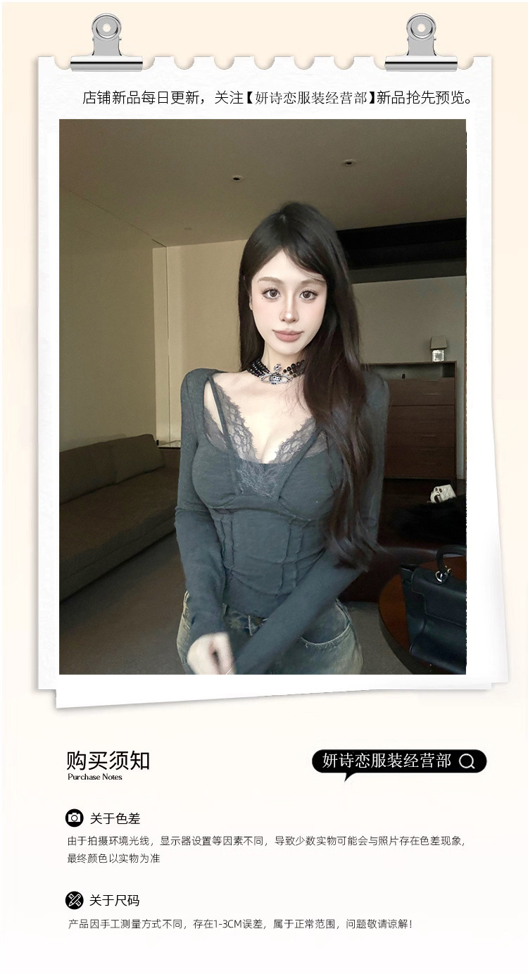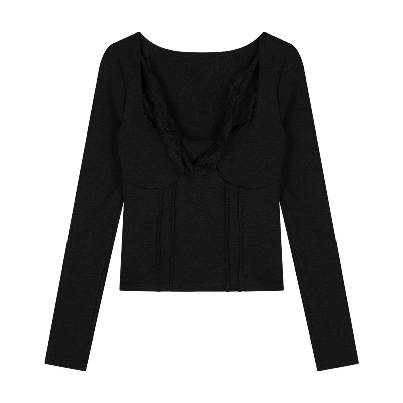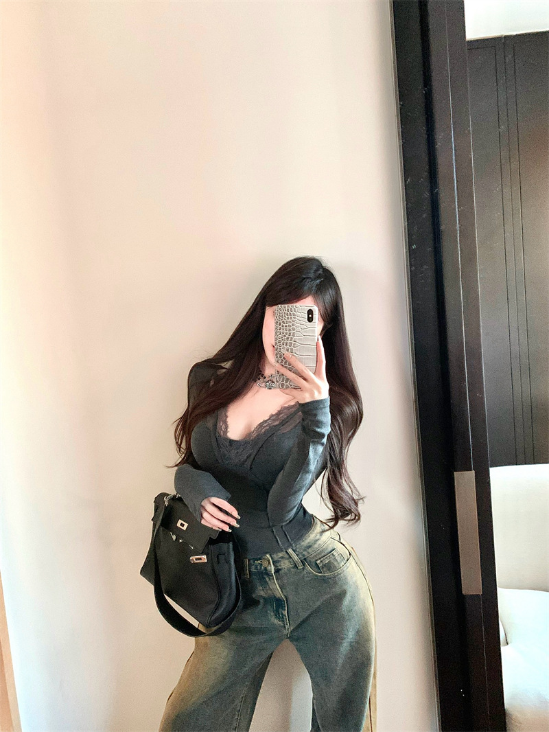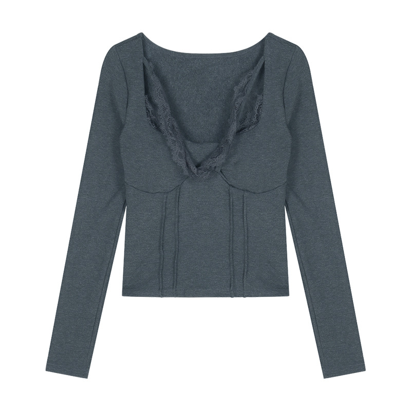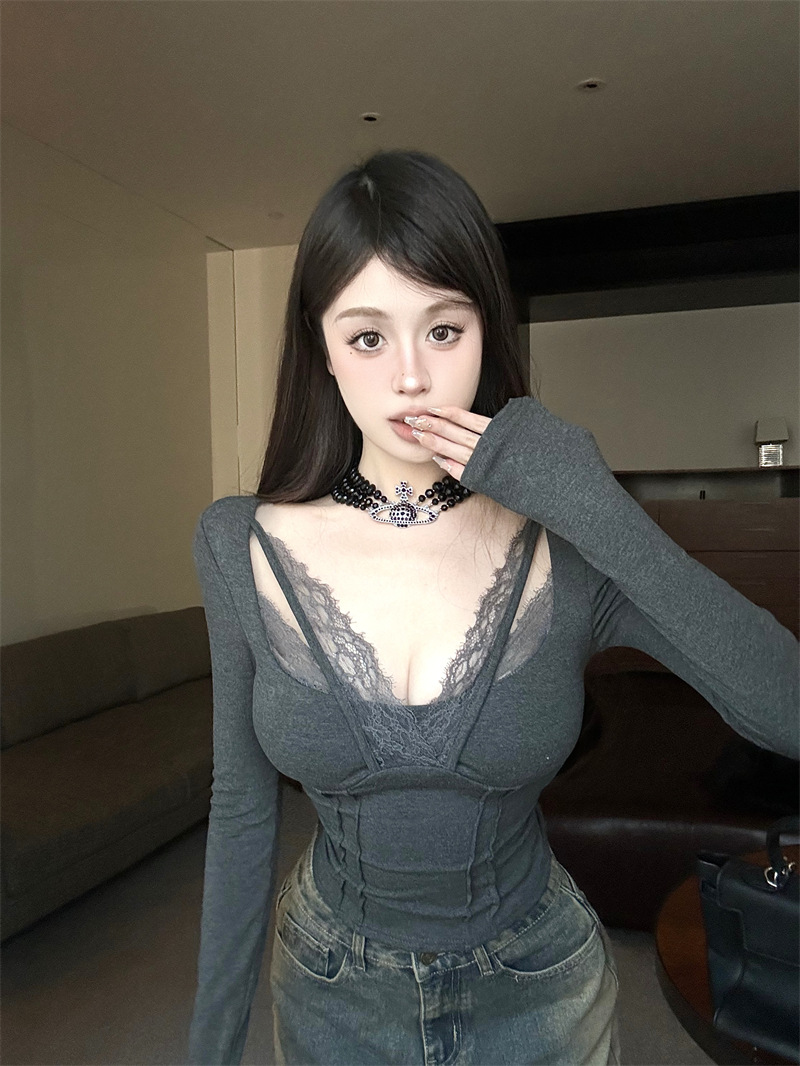 레이스 바느질 섹시한 긴팔 티셔츠 여성용 겨울 타이트 허리 슬림 핏 내부 퓨어 그레이 짧은베이스 레이어 셔츠 탑스토어 가기