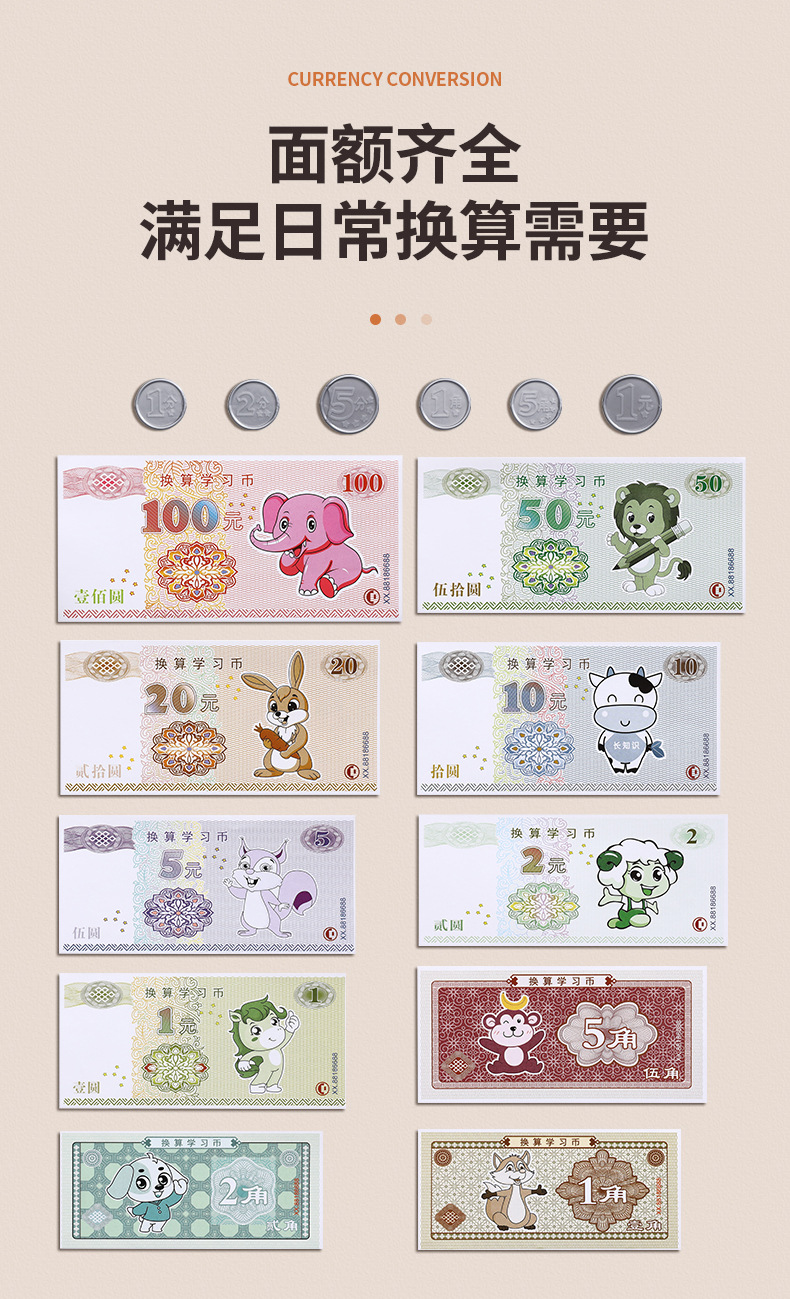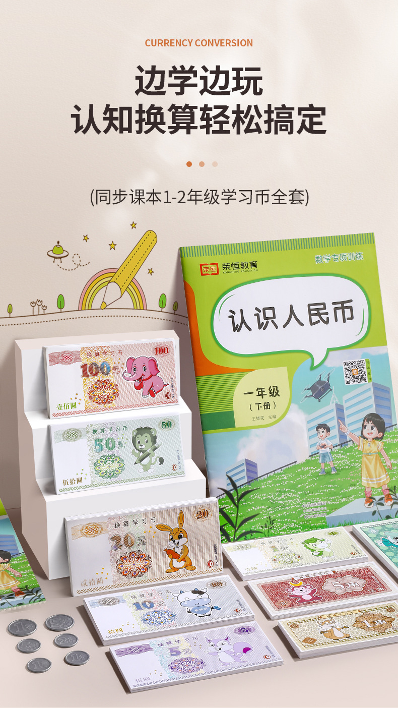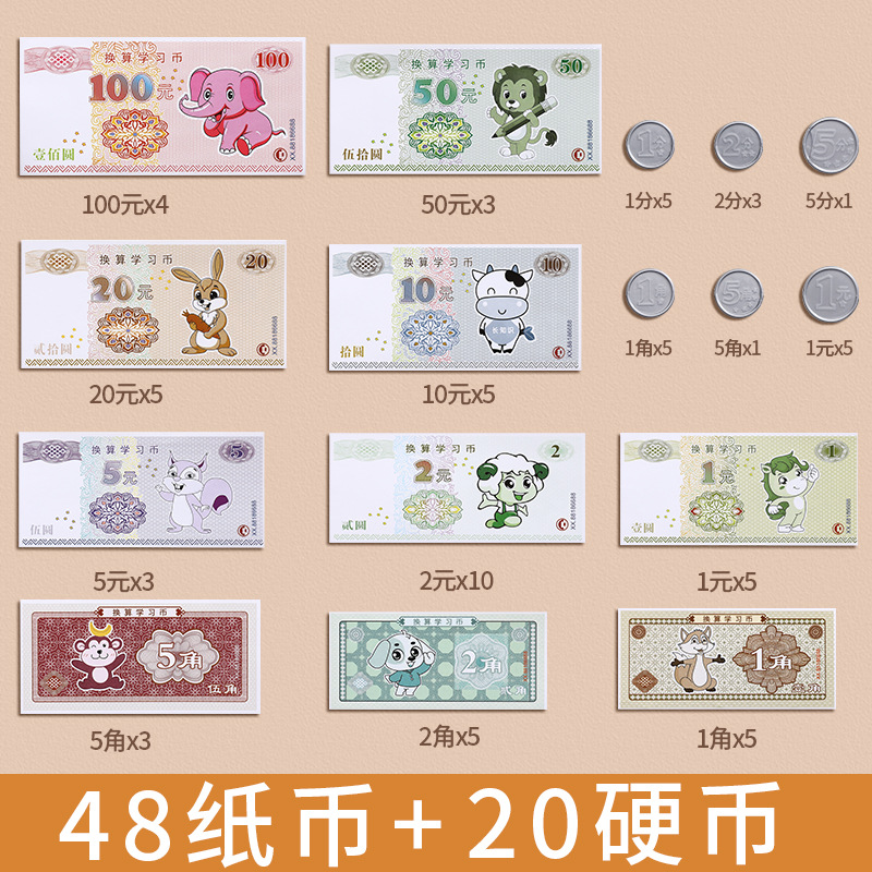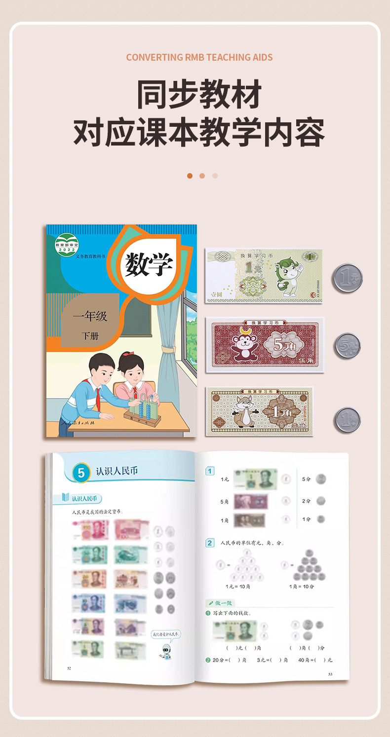 위안화 학습 도구의 수학적 시뮬레이션 이해 Yuan Jiao 포인트 어린이 종이 통화 및 동전 교육 인식 세트 1 학년과 2 학년스토어 가기