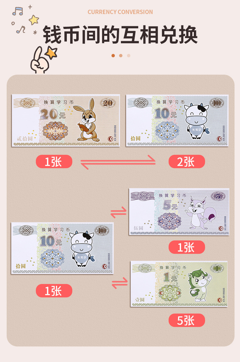 위안화 학습 도구의 수학적 시뮬레이션 이해 Yuan Jiao 포인트 어린이 종이 통화 및 동전 교육 인식 세트 1 학년과 2 학년