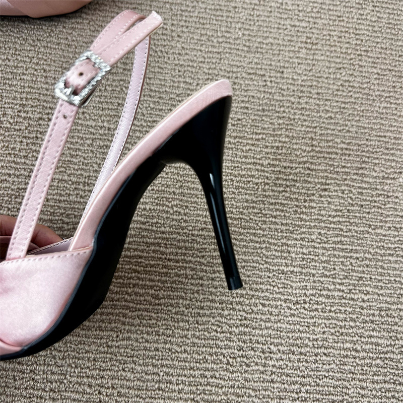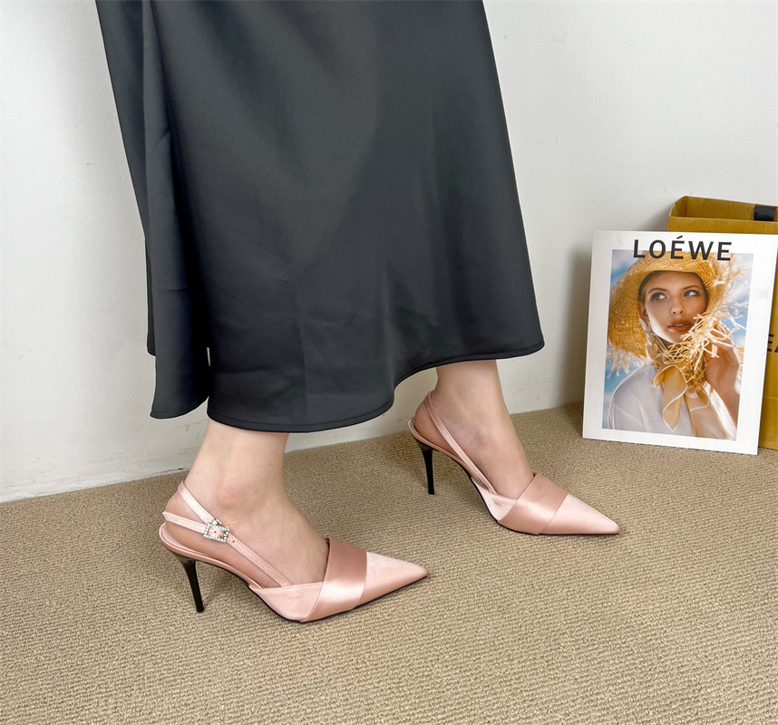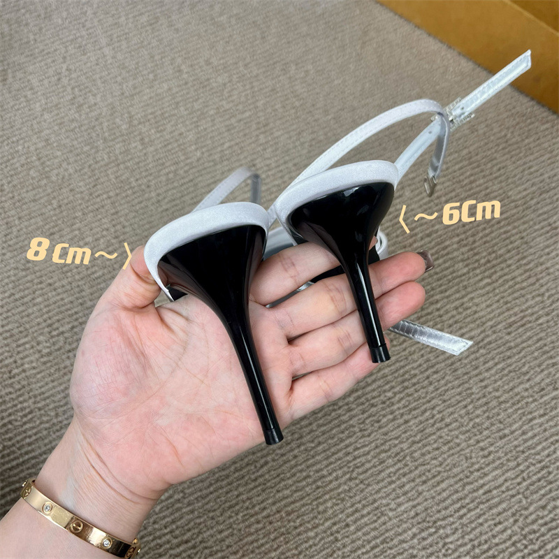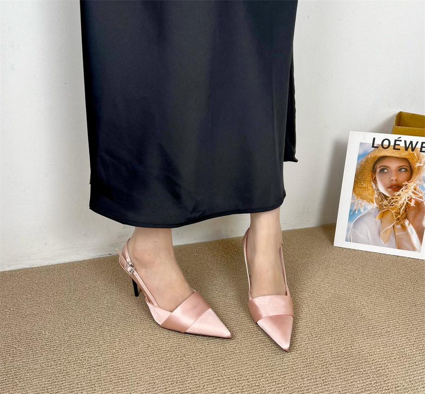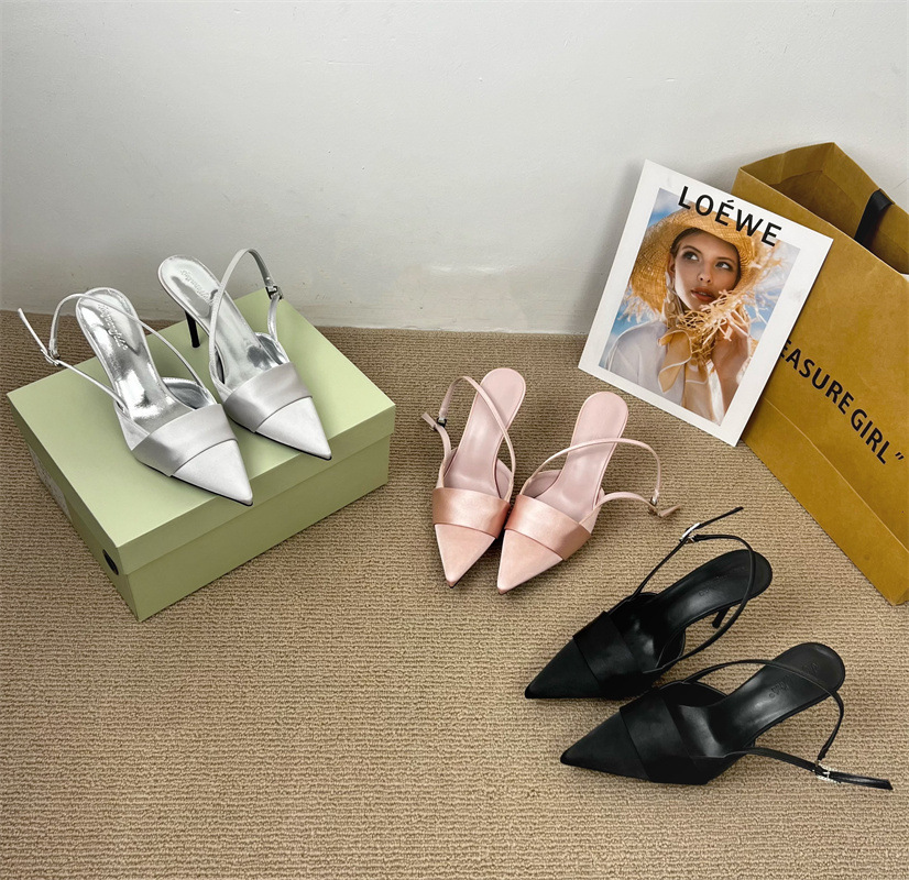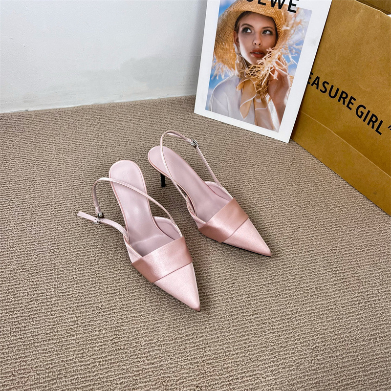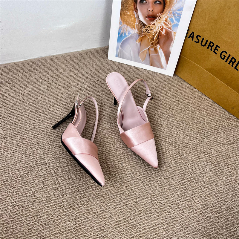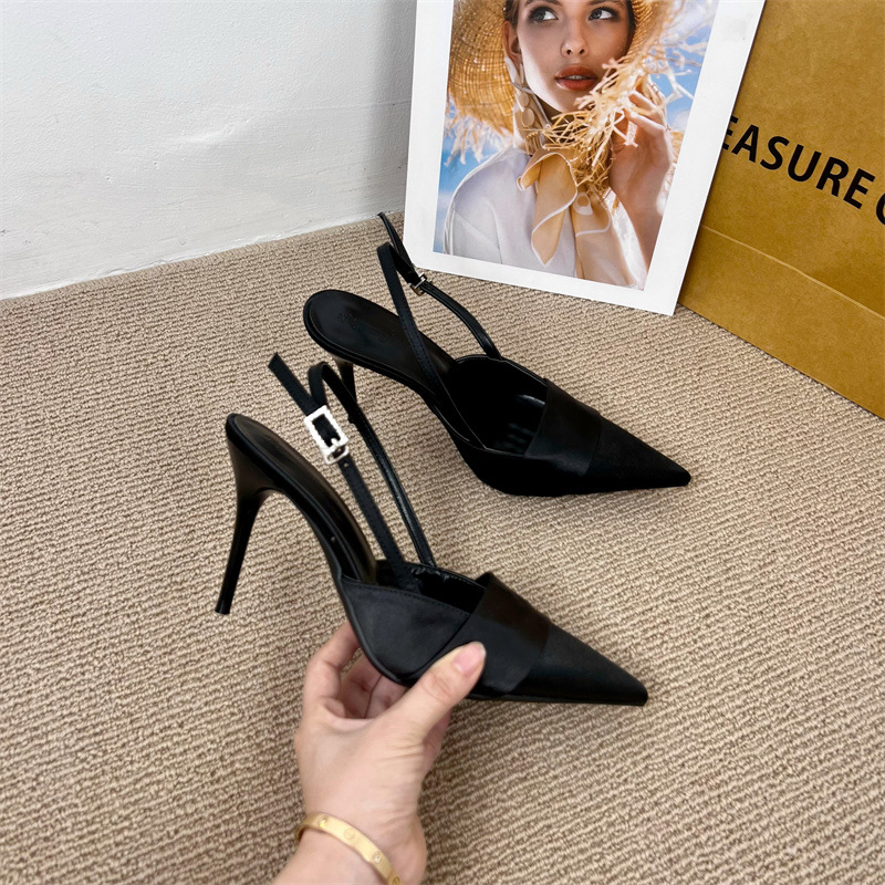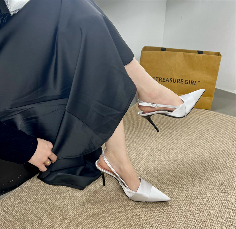 2025 년 봄과 여름 새 뾰족한 실버 새틴 샌들 여성 빈 뾰족한 발 뒤꿈치 하이힐스토어 가기