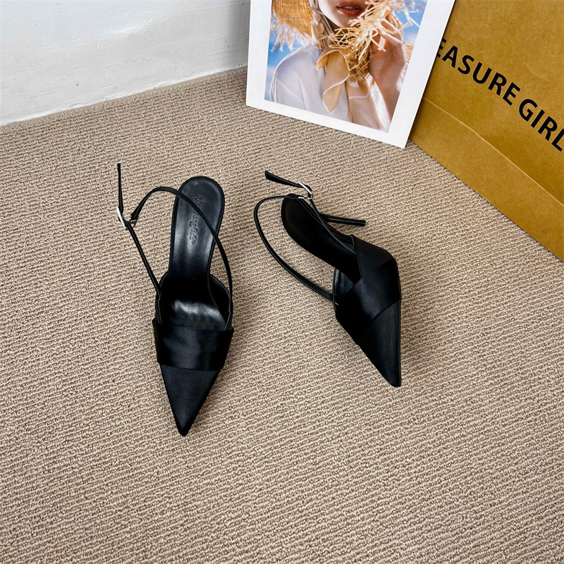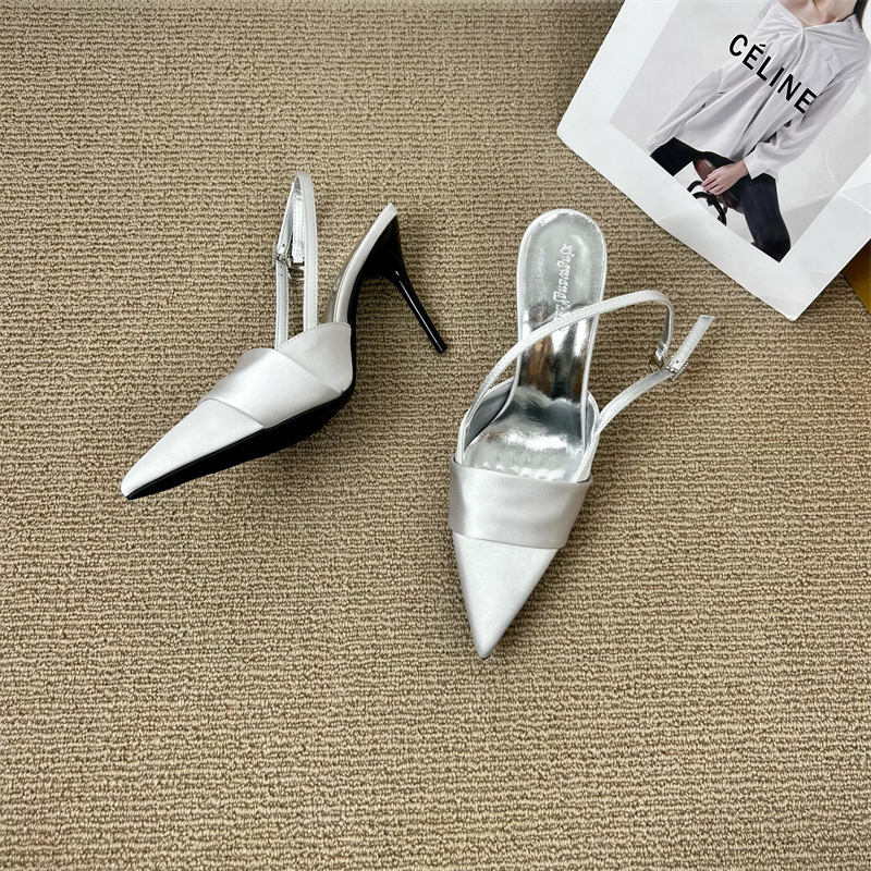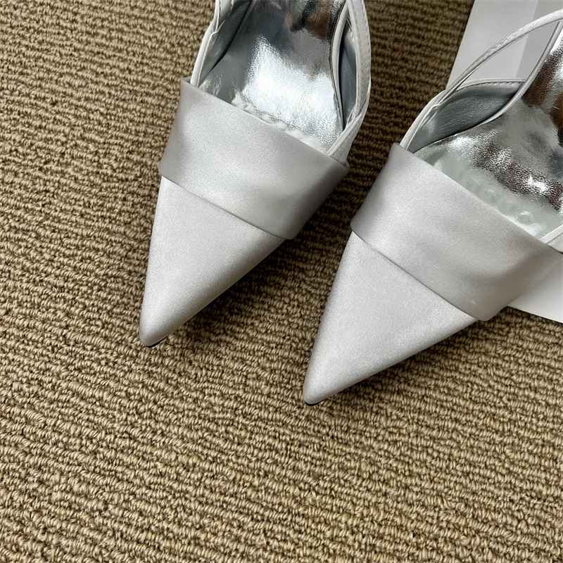 2025 년 봄과 여름 새 뾰족한 실버 새틴 샌들 여성 빈 뾰족한 발 뒤꿈치 하이힐