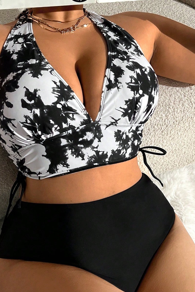 유럽과 미국의 분할 인쇄 패션 비키니 서랍 목 스트랩 백리스 섹시한 수영복 플러스 사이즈 뚱뚱한 여자 수영복 여성