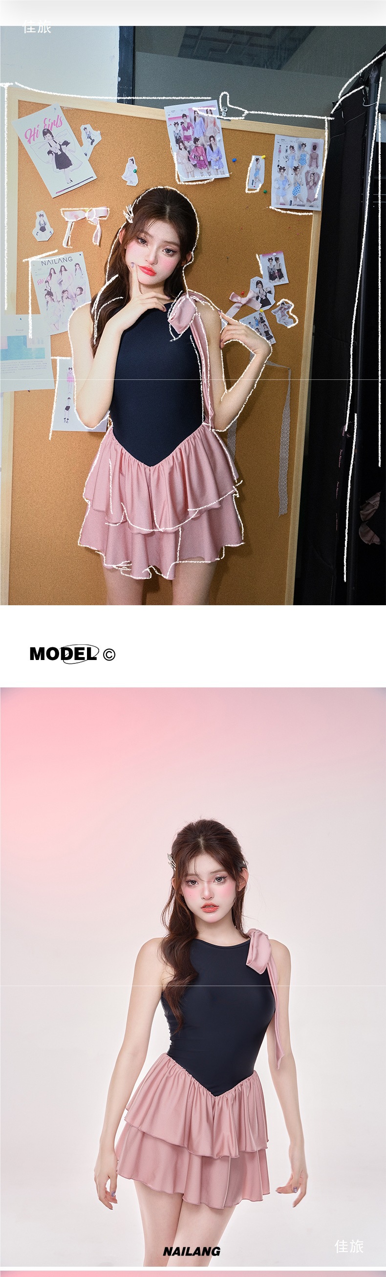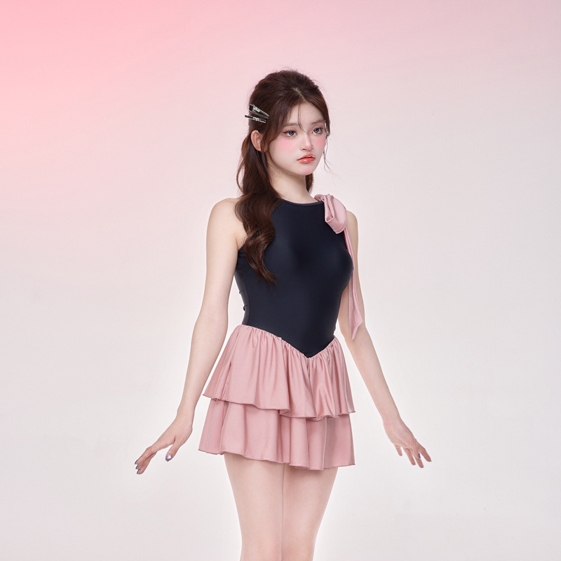 NLANG 수영복 여성 2025 새로운 요정 스커트 스타일 배를 덮는 가슴 패드 작은 가슴 푸시 업 민소매 온천