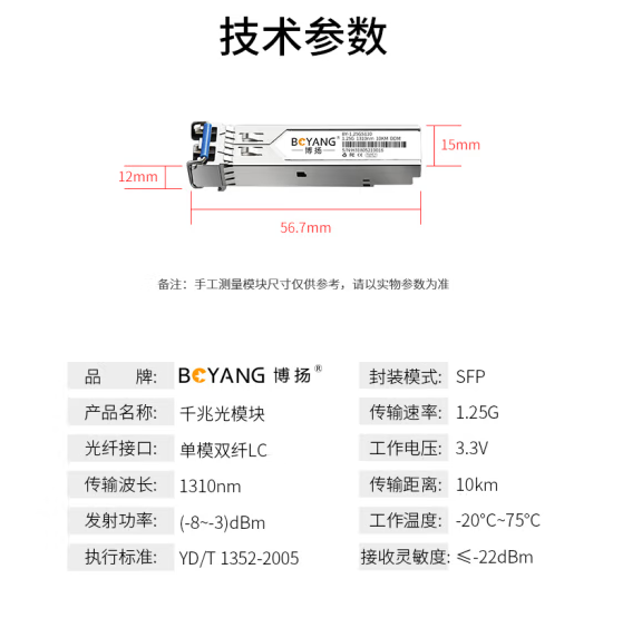博扬SFP光模块千兆1.25G单模双纤(1310nm,10km,LC)适配华为交换机SFP-GE-LX-SM1310*1 合格证*1 保修卡*1