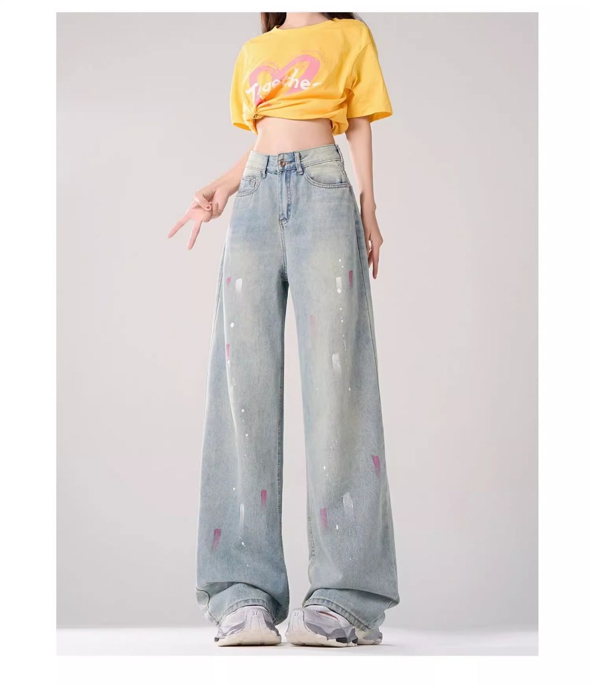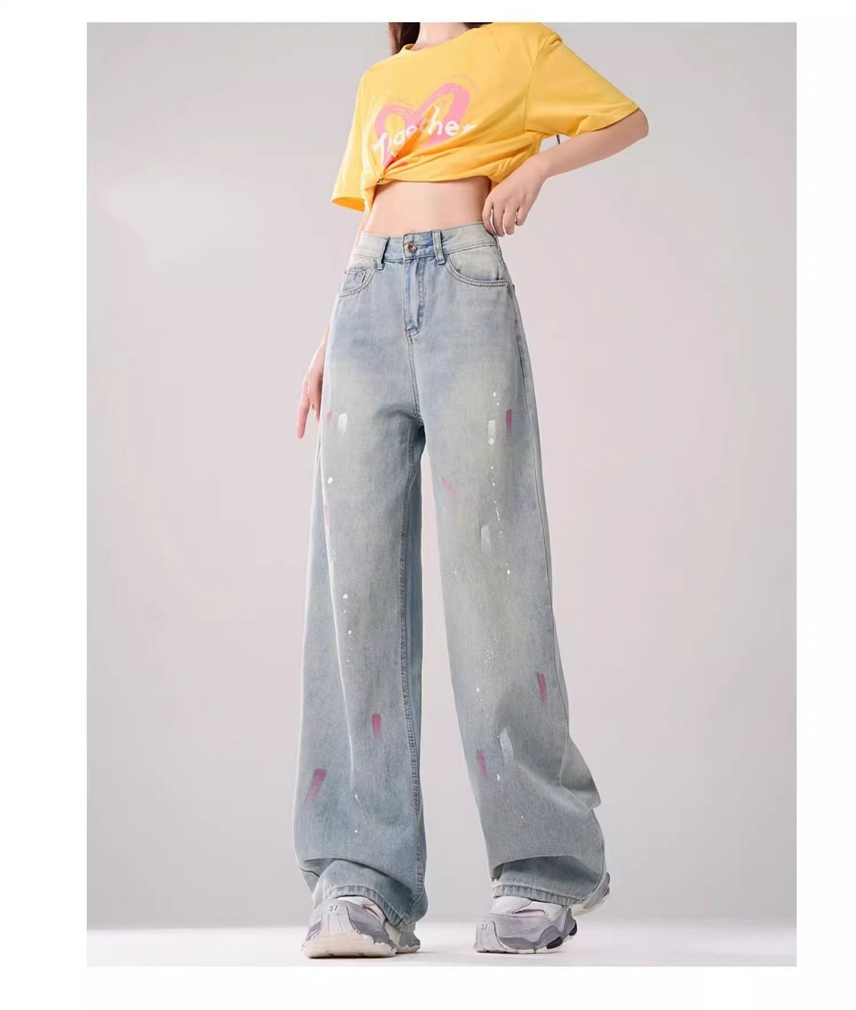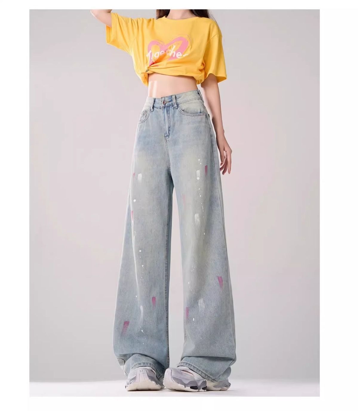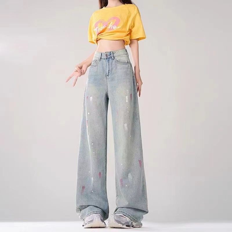 라이트 블루 독특한 직선 다리 넓은 다리 청바지 여성의 봄과 가을 2025 새로운 다목적 높은 허리 좁은 슬림 넓은 다리 바지스토어 가기
