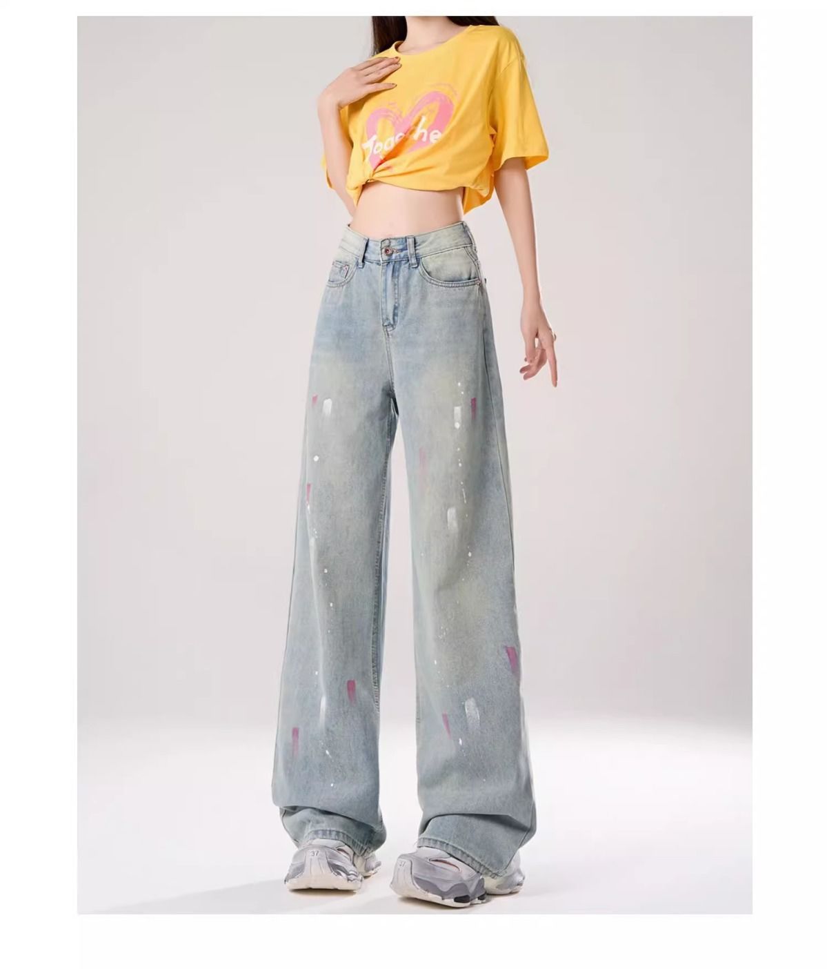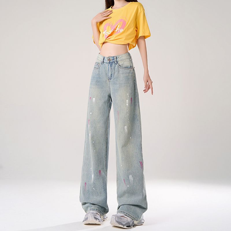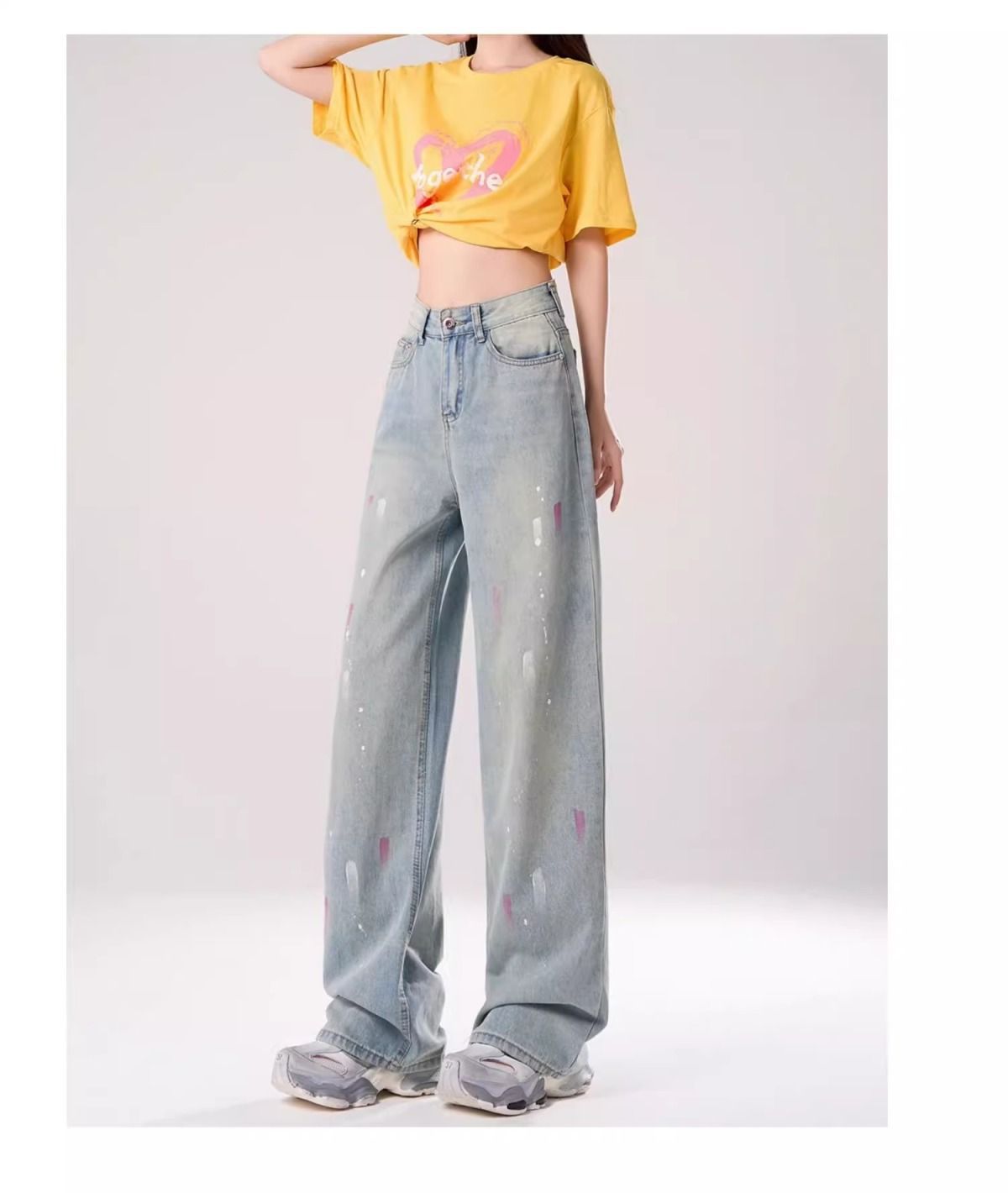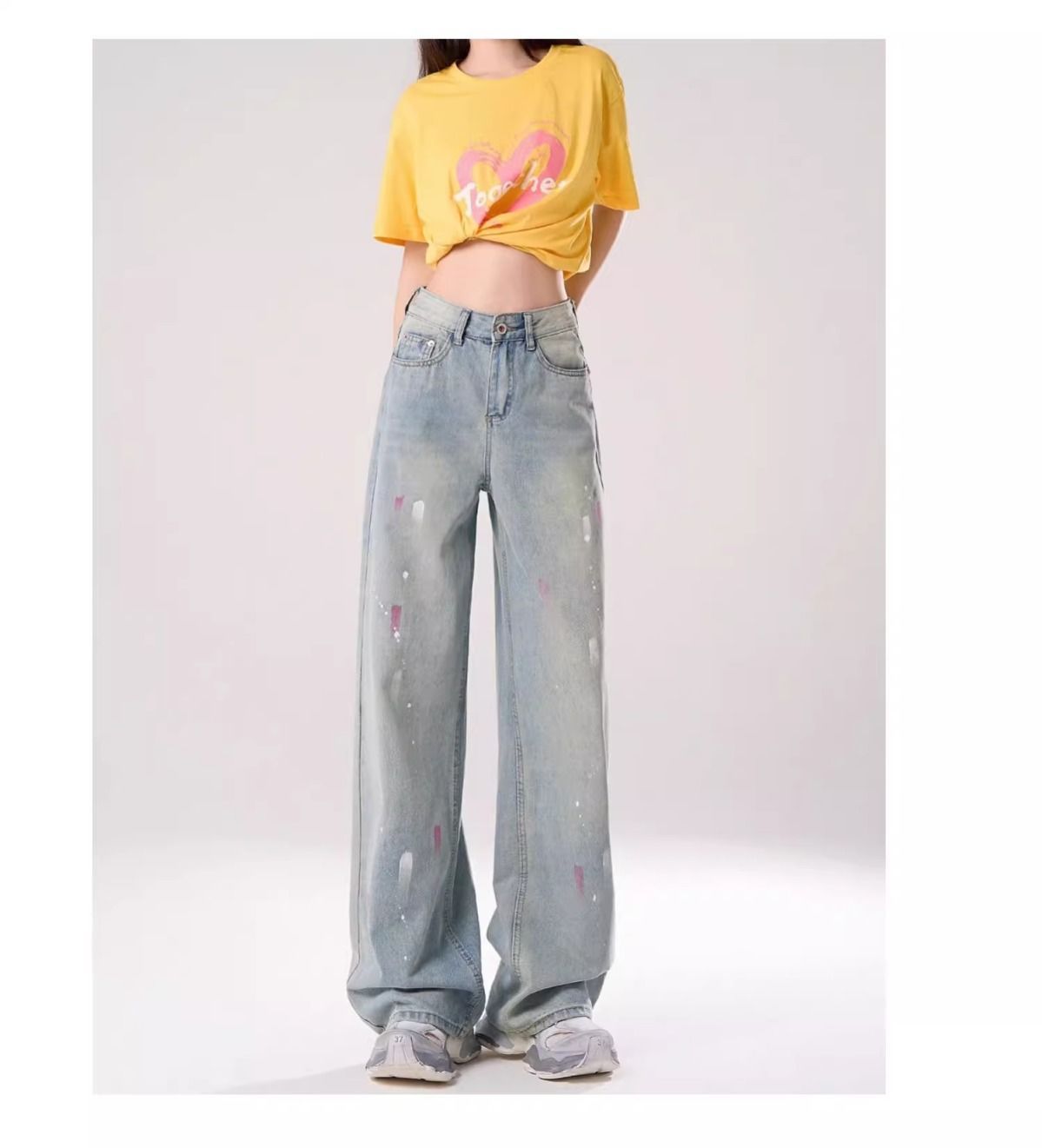 라이트 블루 독특한 직선 다리 넓은 다리 청바지 여성의 봄과 가을 2025 새로운 다목적 높은 허리 좁은 슬림 넓은 다리 바지스토어 가기