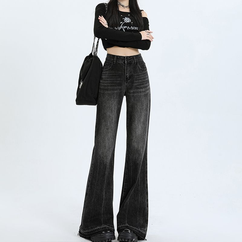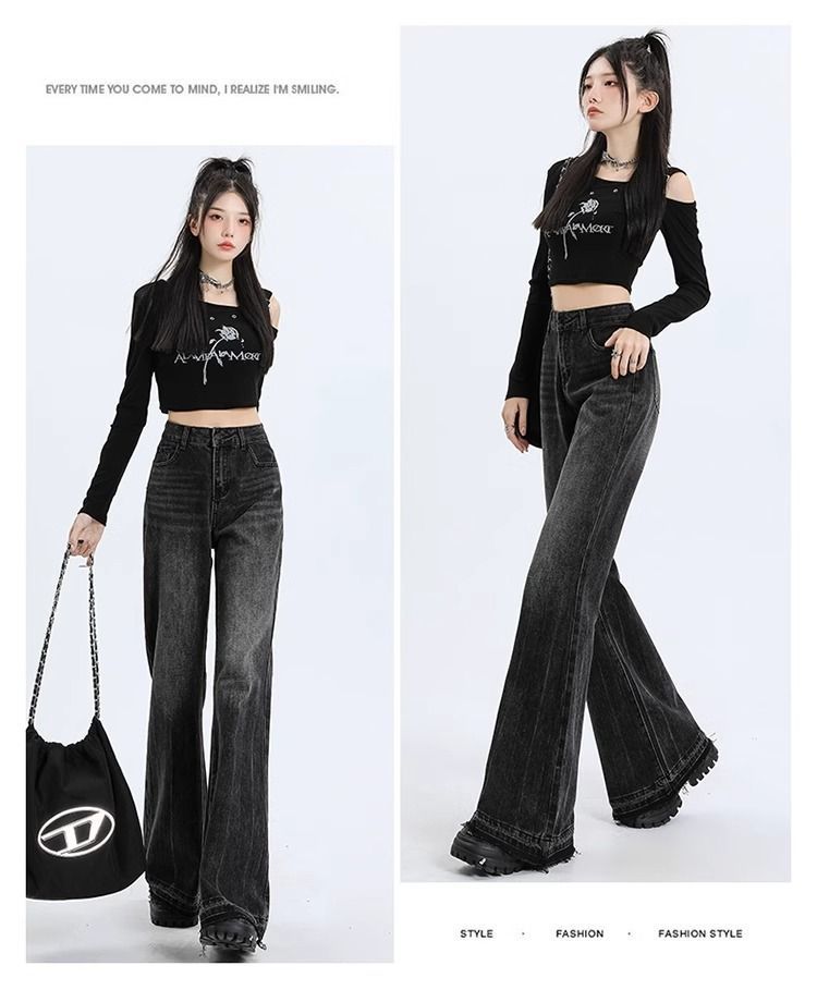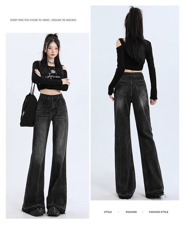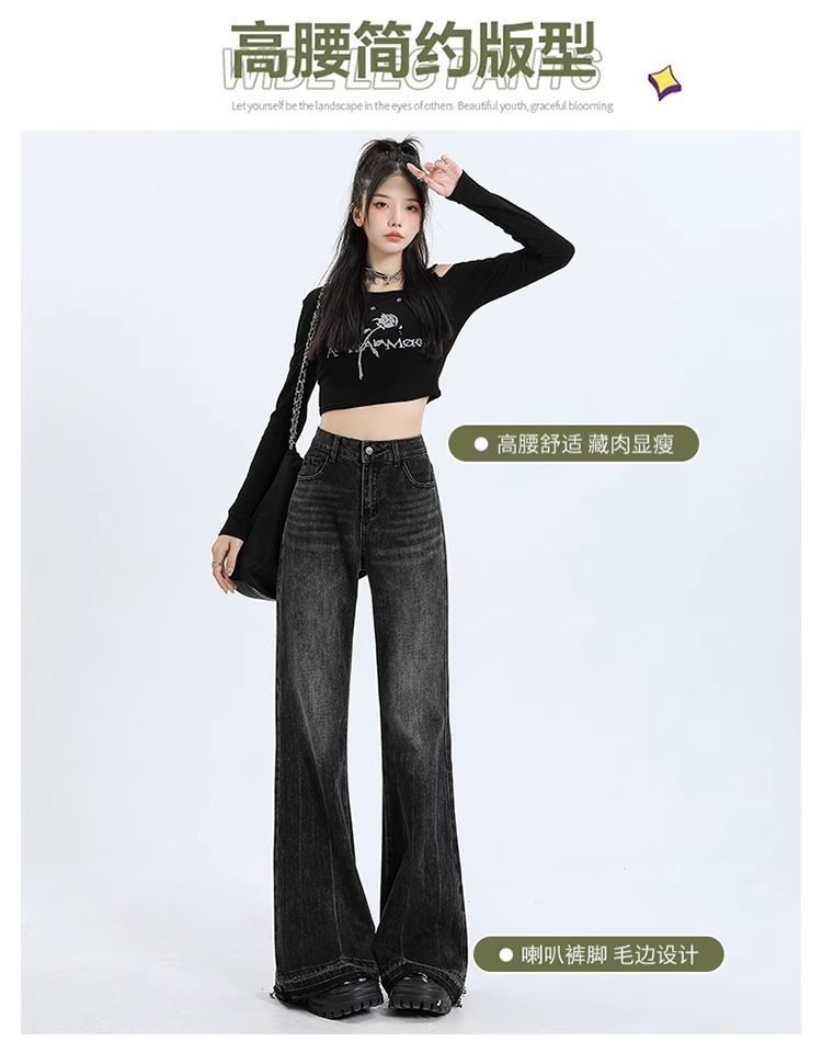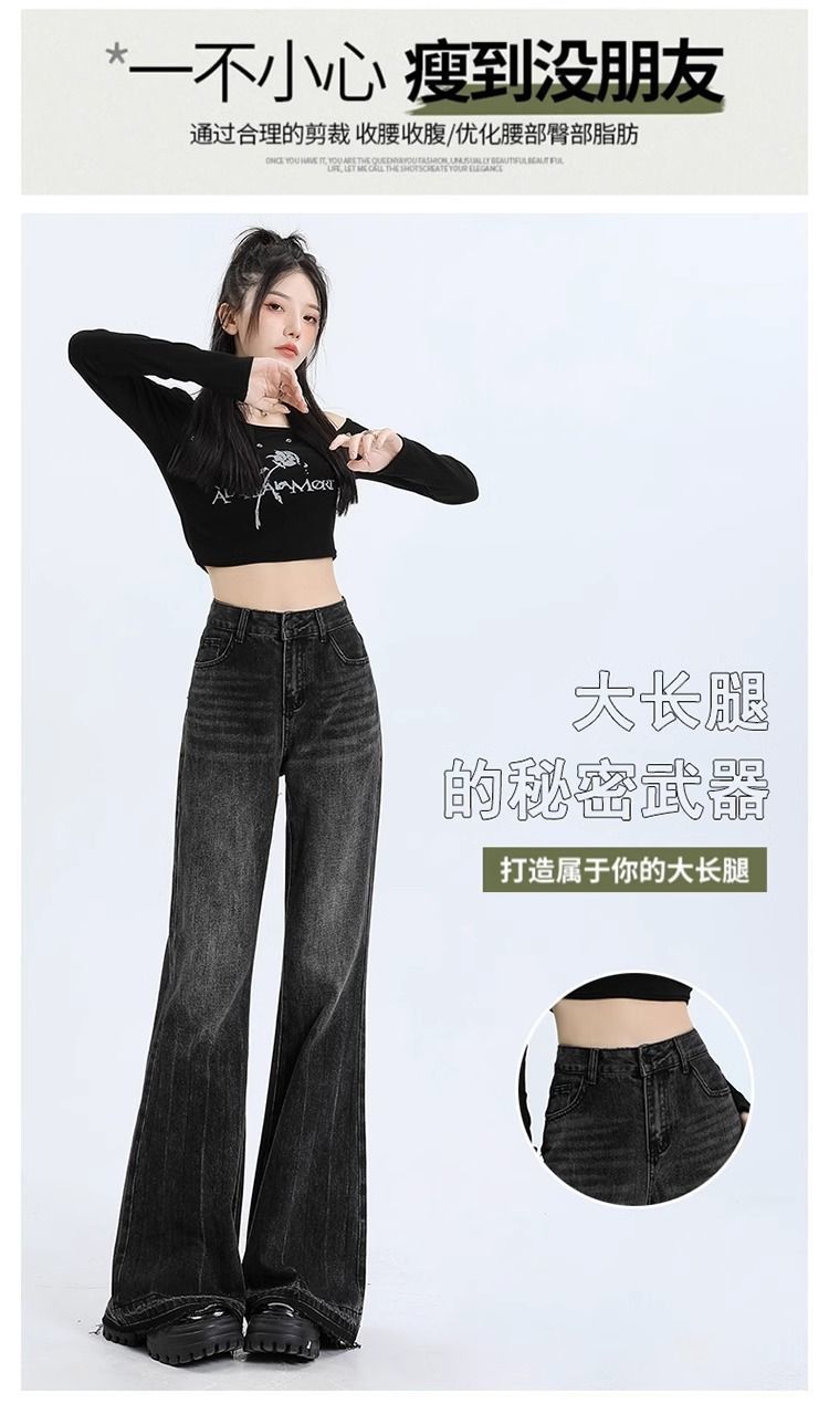 검은 회색 약한 청바지 여성의 봄과 가을 새로운 높은 허리 느슨한 슬리밍 질감 디자인 센스 랩 걸레 바지
