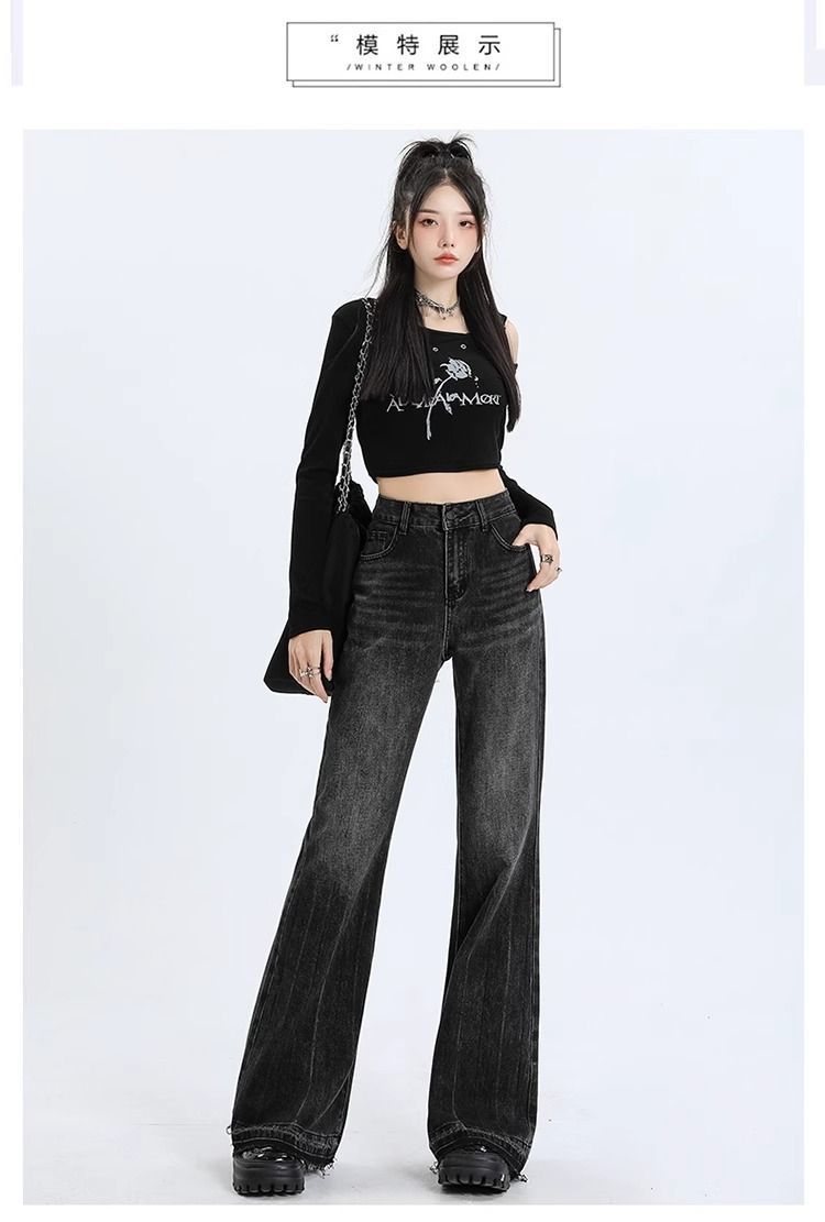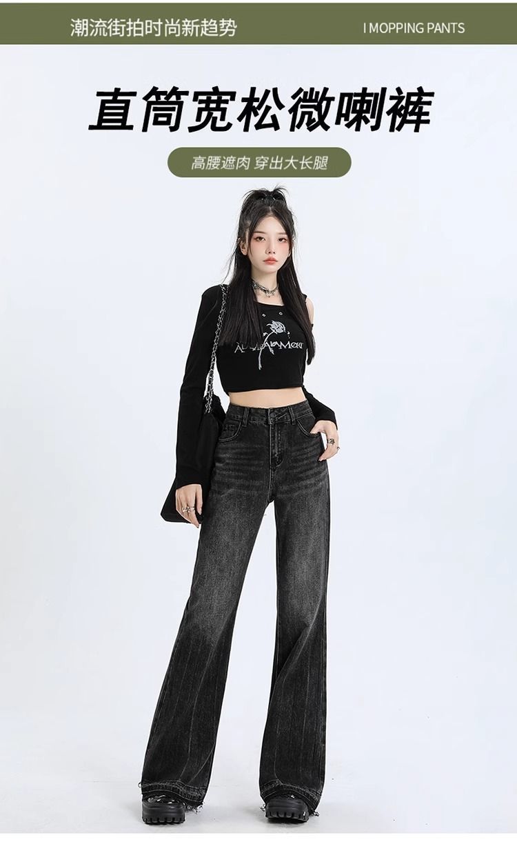 검은 회색 약한 청바지 여성의 봄과 가을 새로운 높은 허리 느슨한 슬리밍 질감 디자인 센스 랩 걸레 바지스토어 가기