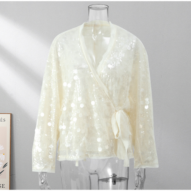 투명한 구슬 레이스 업 코트 국경 유럽과 미국 패션 느슨한 봄과 여름 얇은 긴 소매 카디건 탑