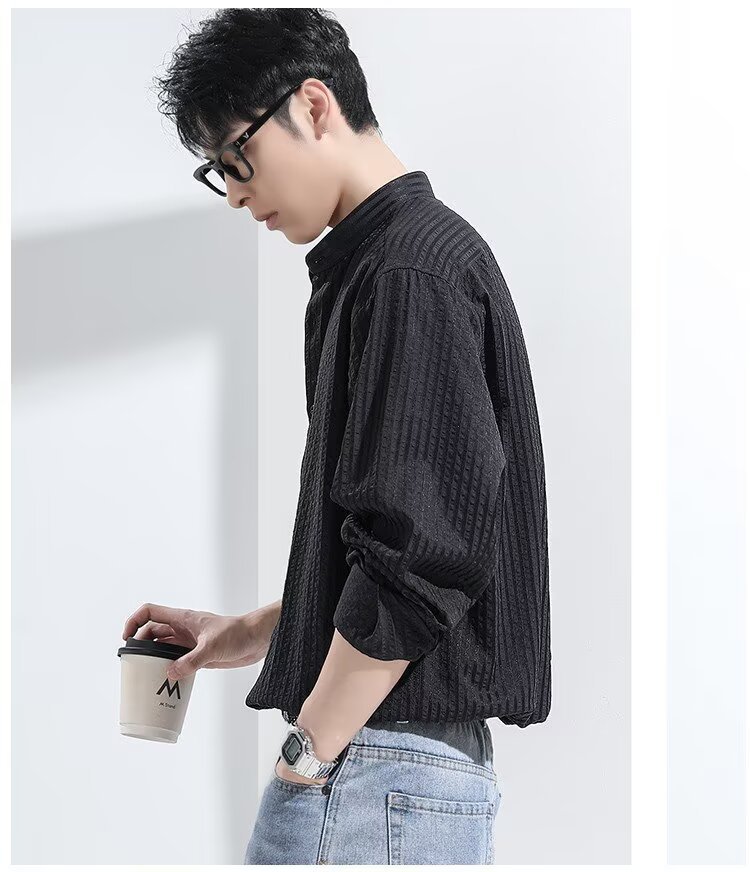 주름 방지 시어 스커 블랙 긴팔 셔츠 2025 십대를위한 봄 새로운 패션 스탠드 칼라 스트라이프 셔츠 재킷스토어 가기