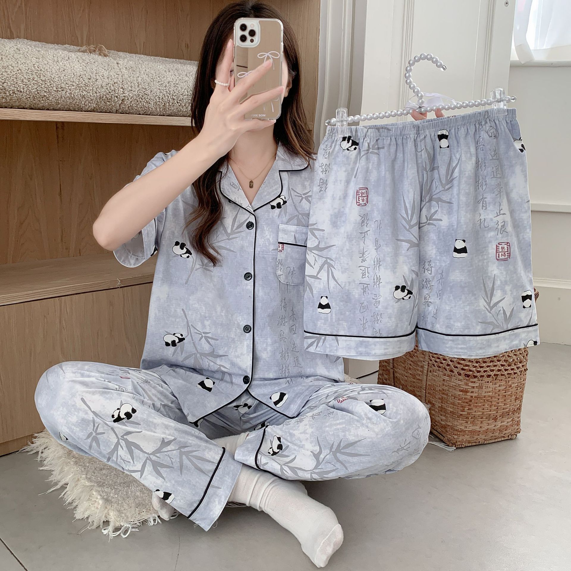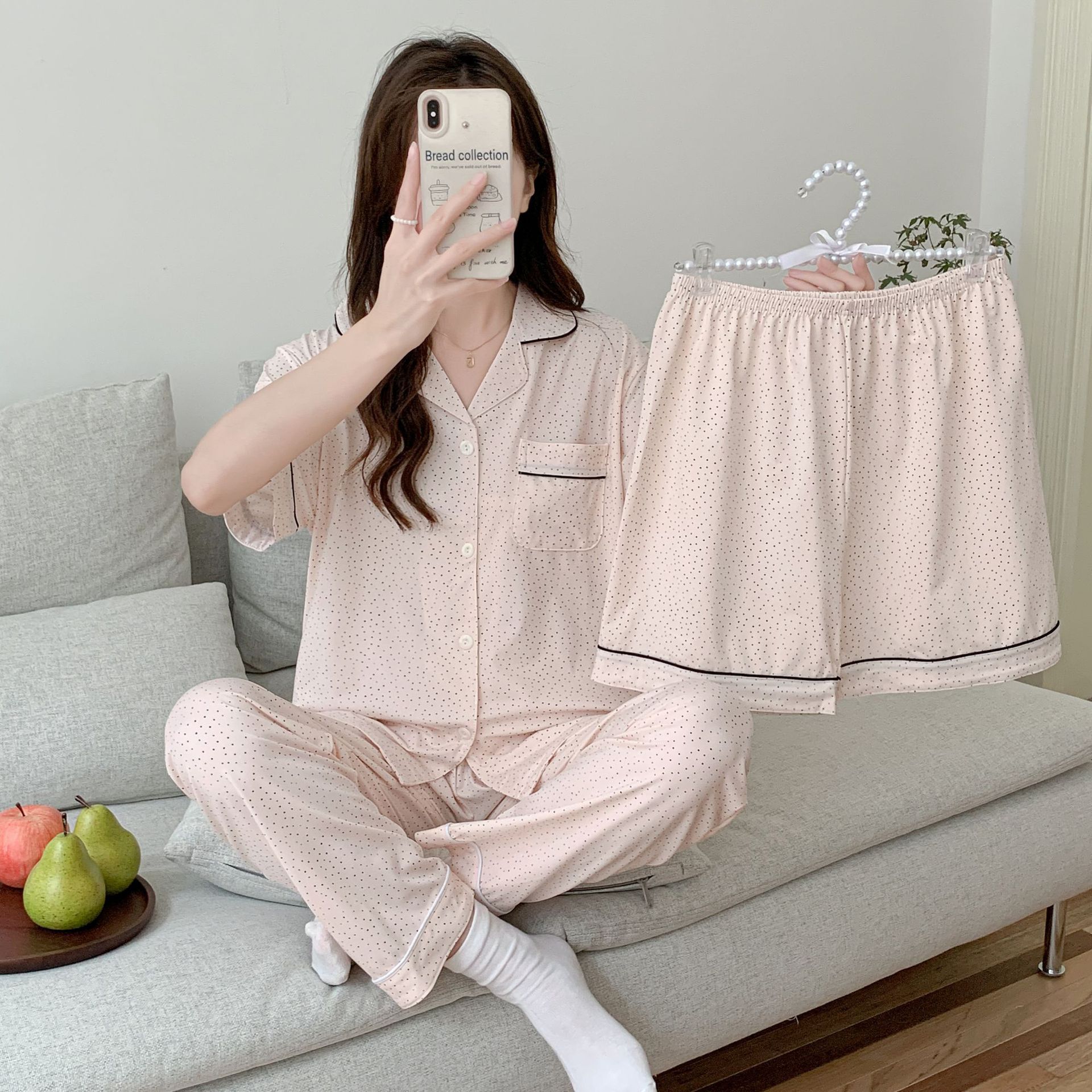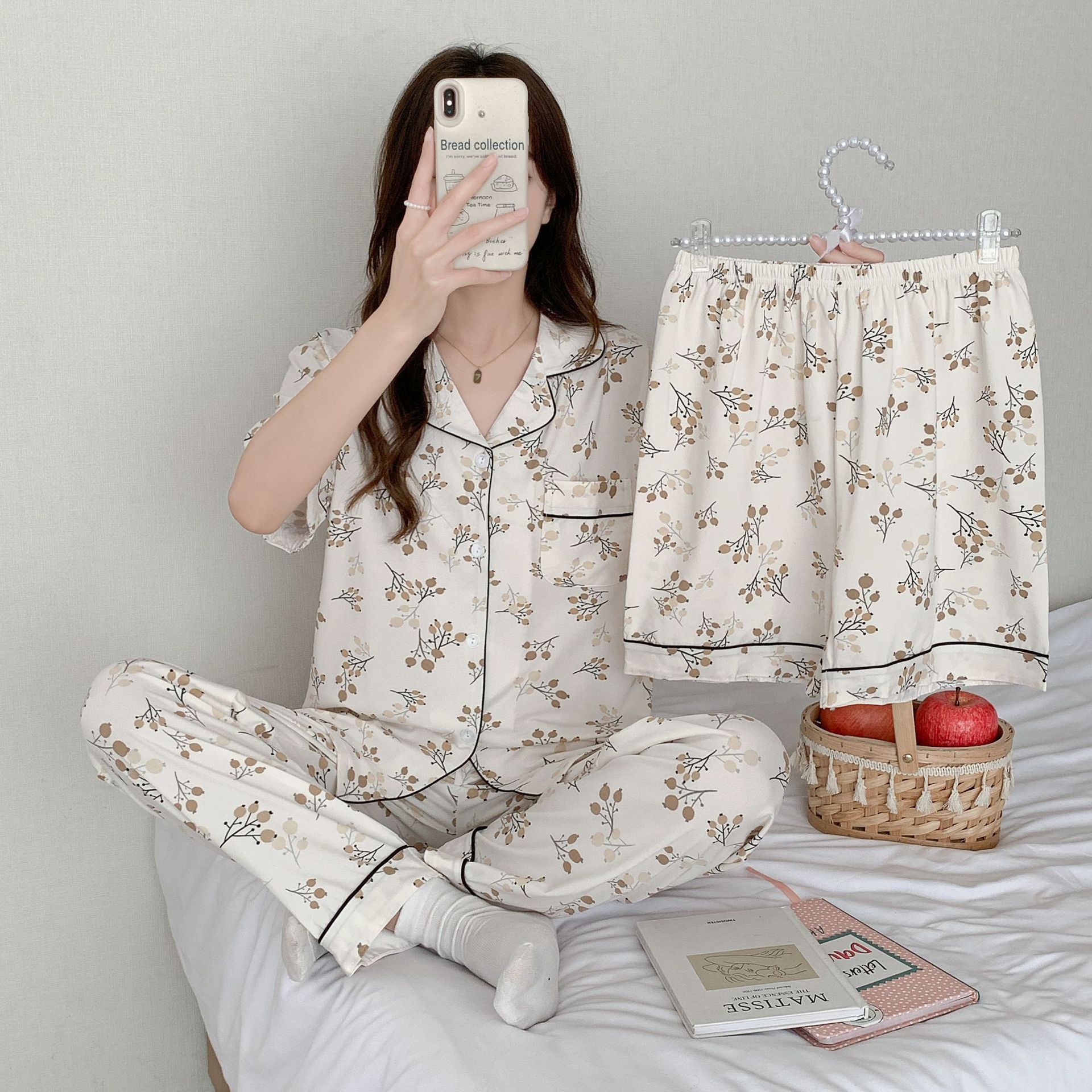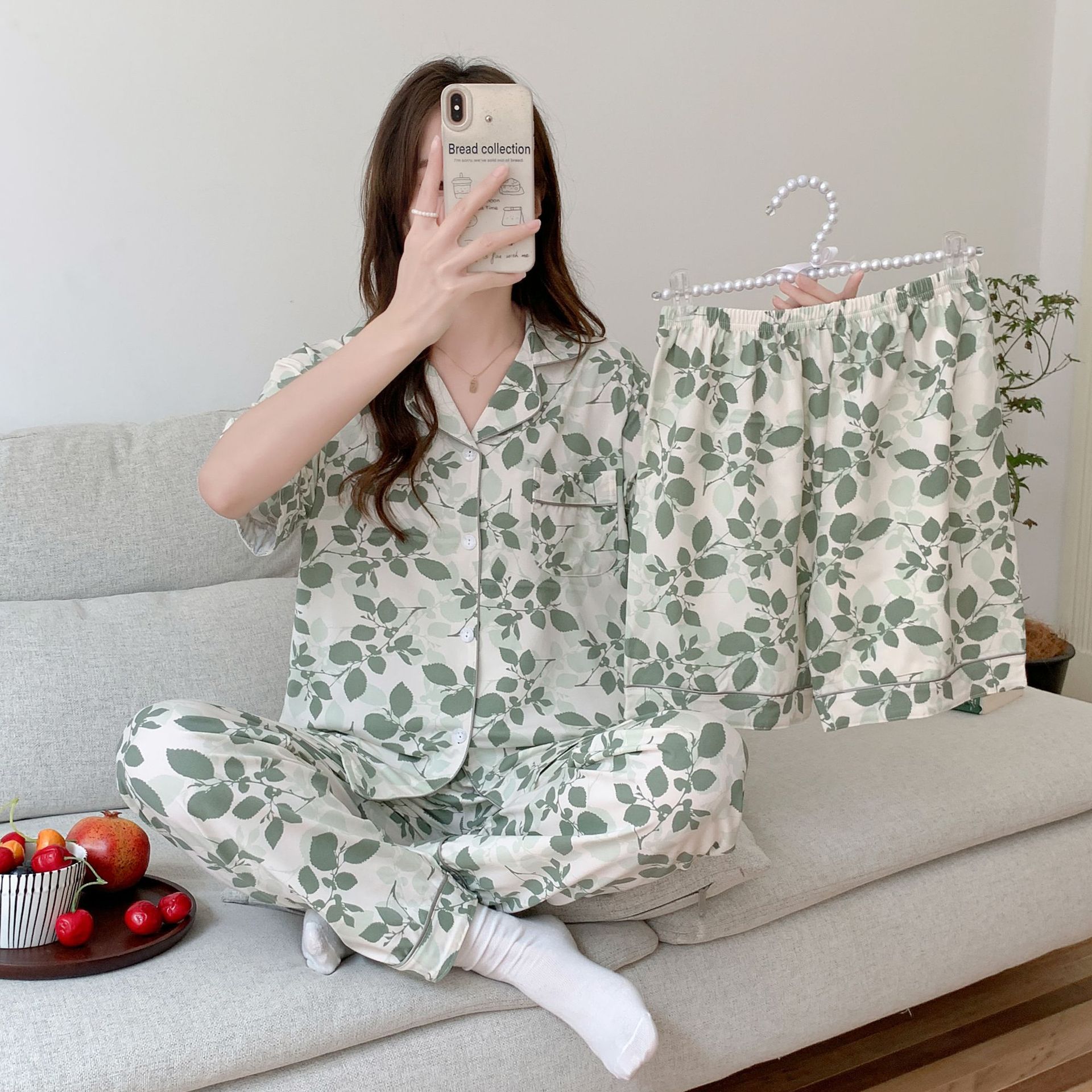 2025 년에 따라 한 수면 다양한 옵션 3 피스, 작은 신선한 잠옷 여성 반팔 바지 가정용 옷은 외부에서 입을 수 있습니다.스토어 가기