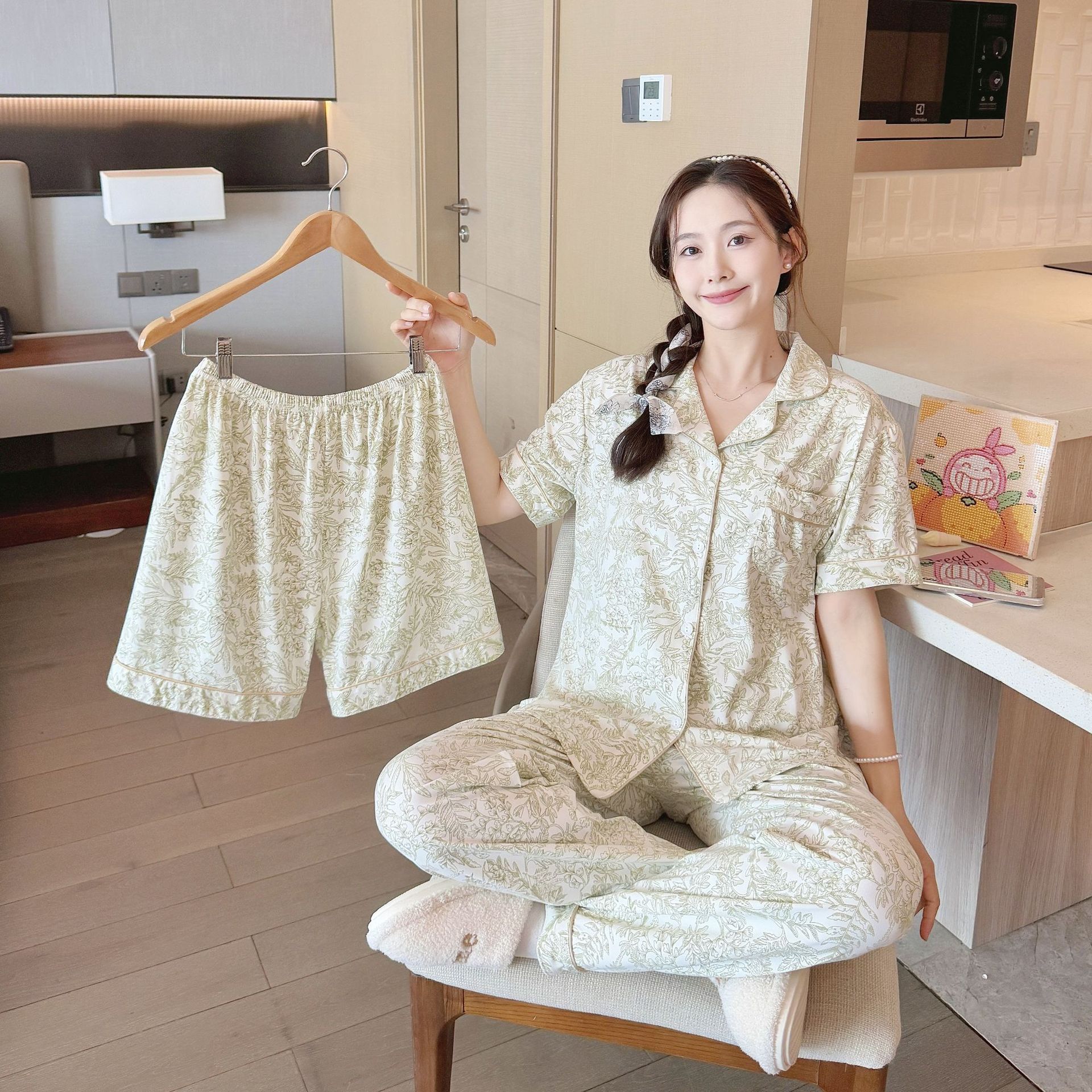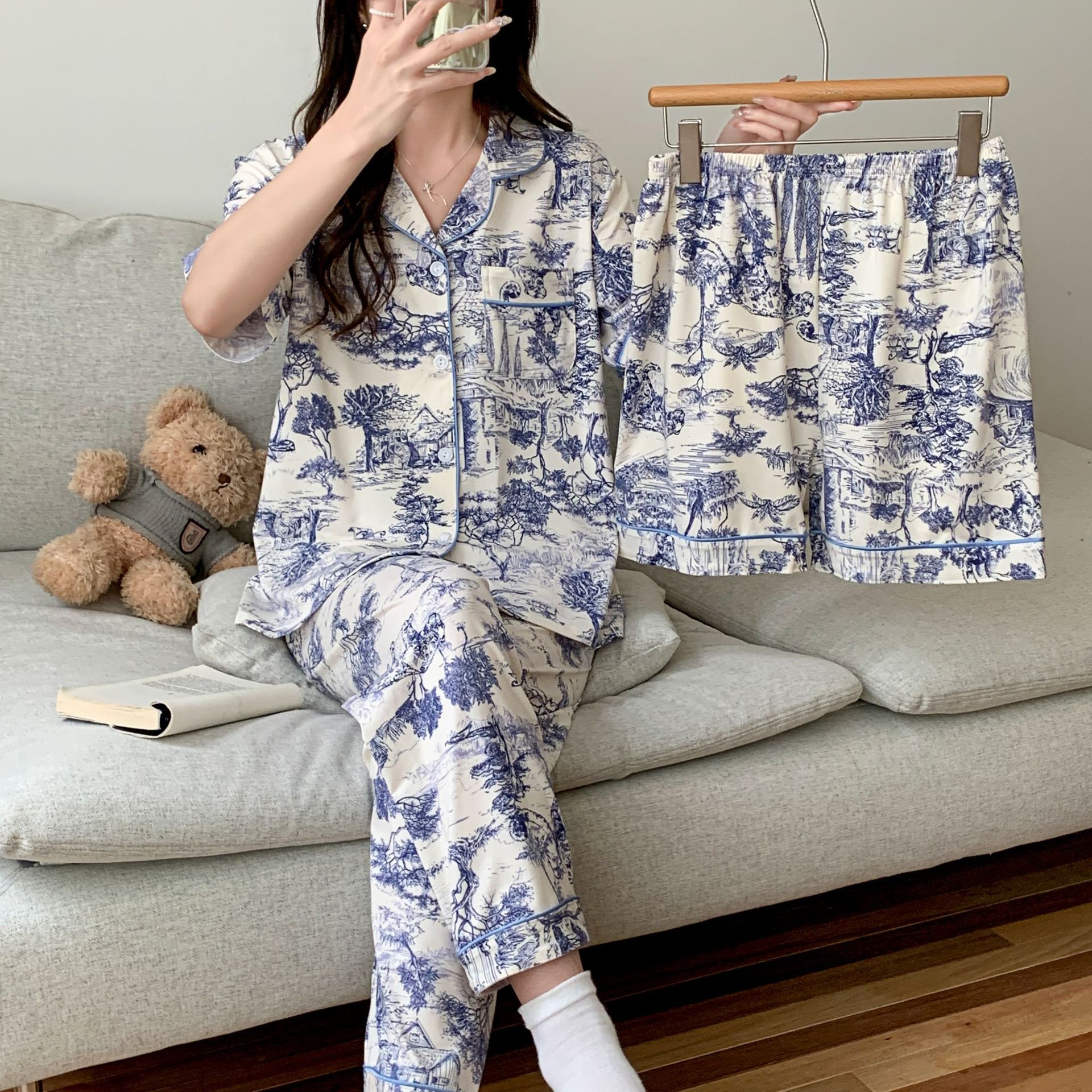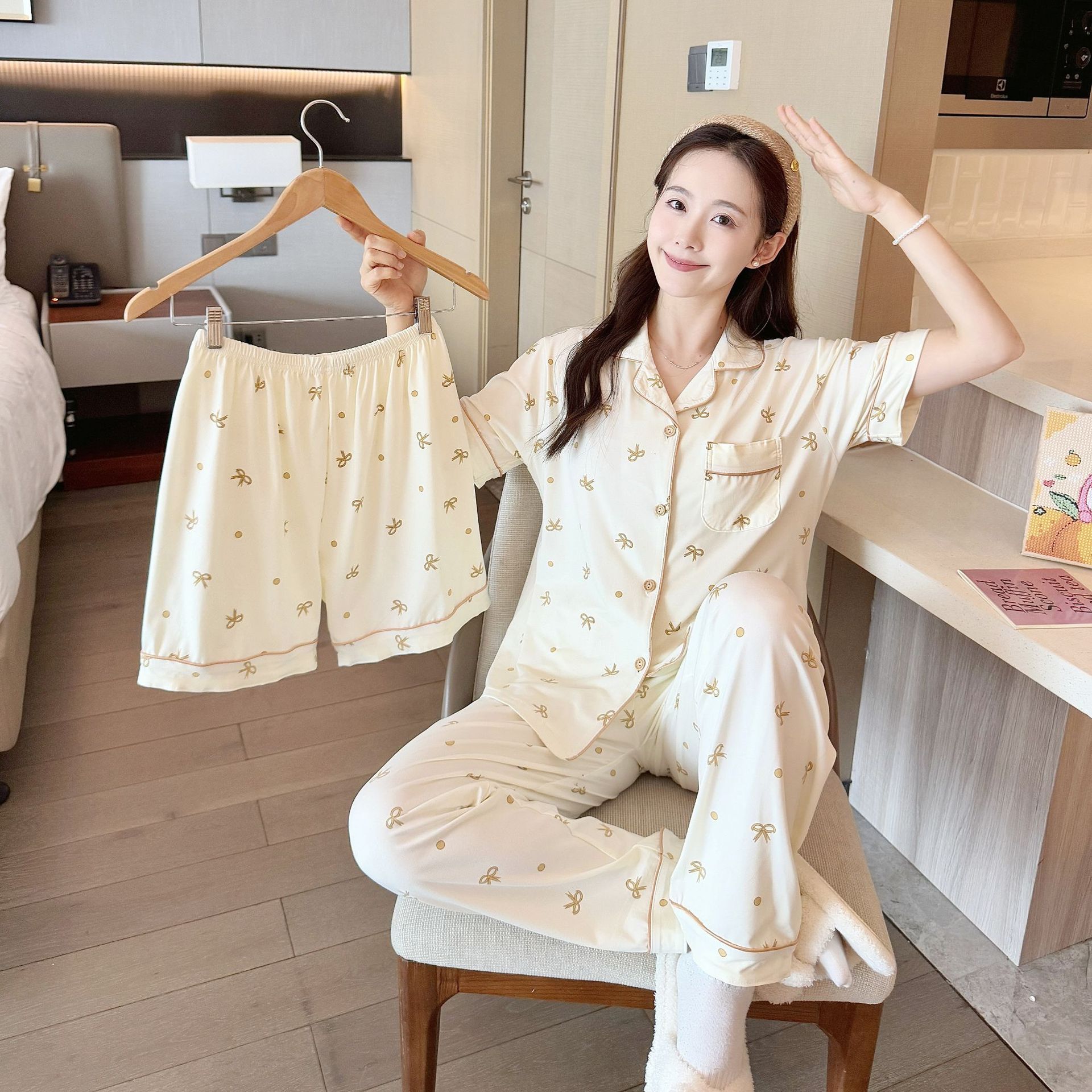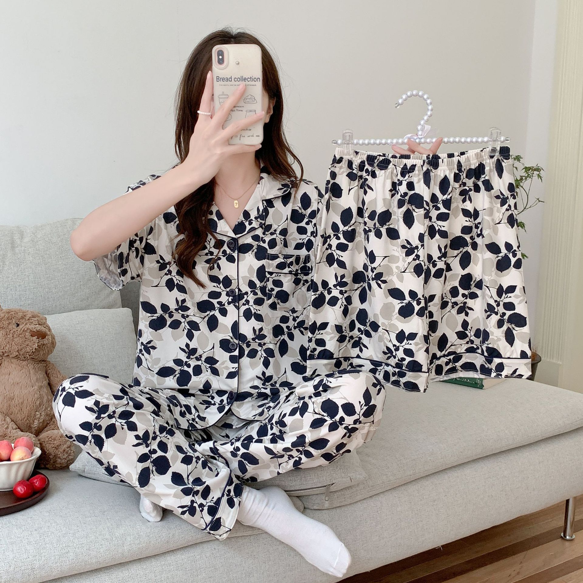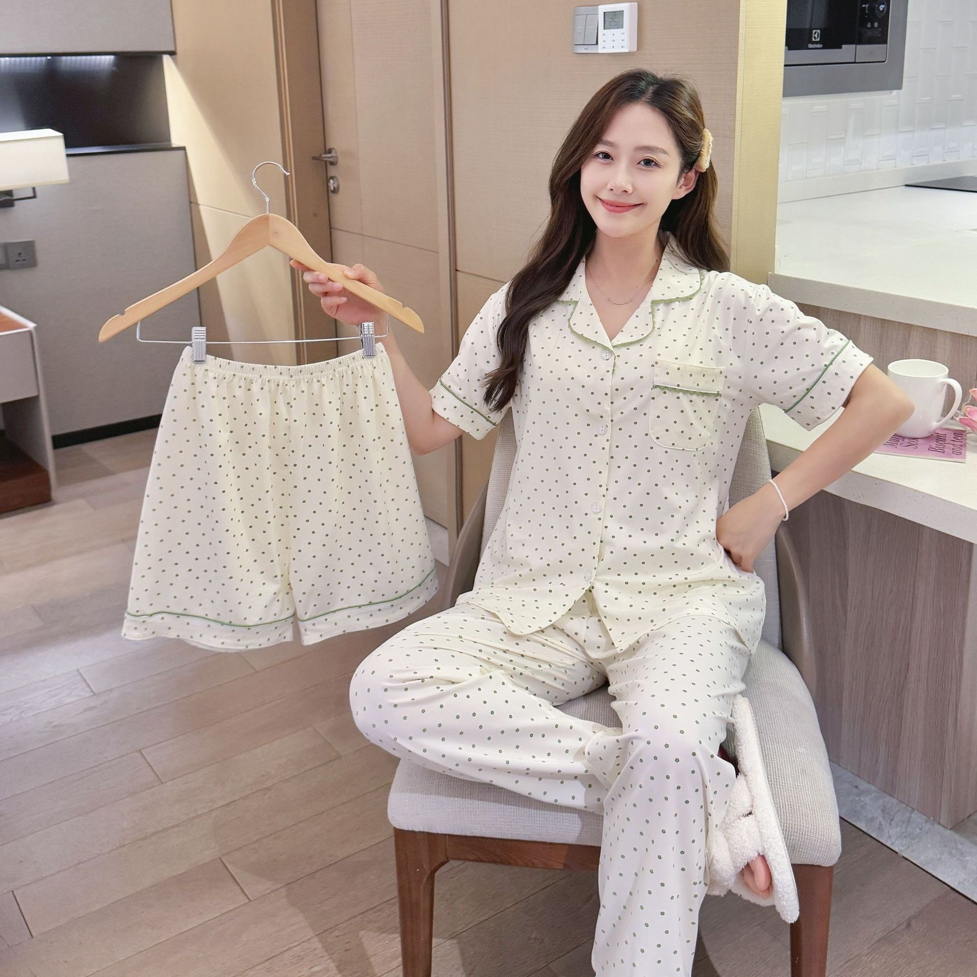 2025 년에 따라 한 수면 다양한 옵션 3 피스, 작은 신선한 잠옷 여성 반팔 바지 가정용 옷은 외부에서 입을 수 있습니다.스토어 가기