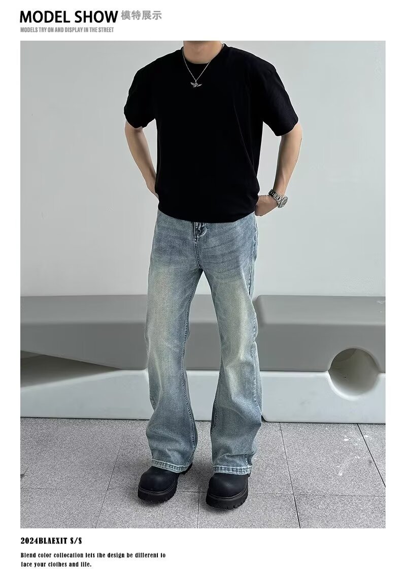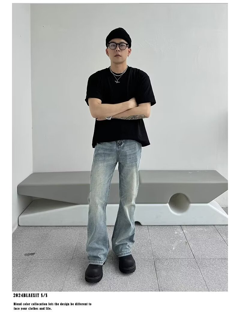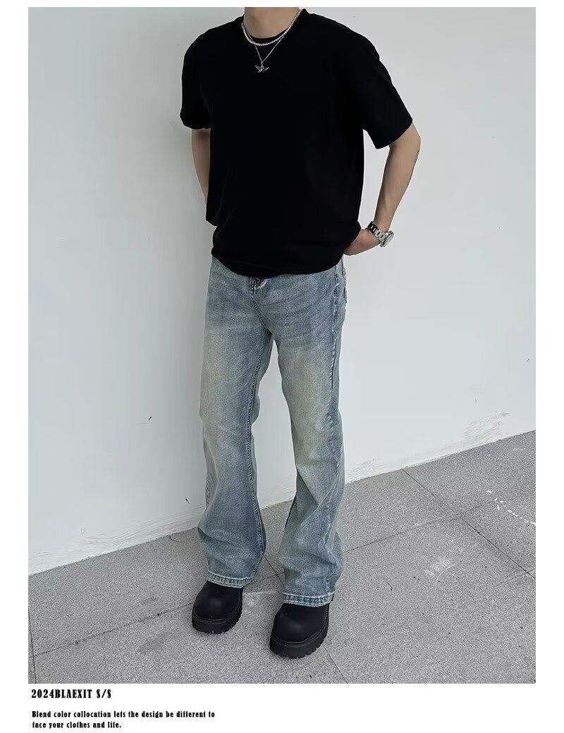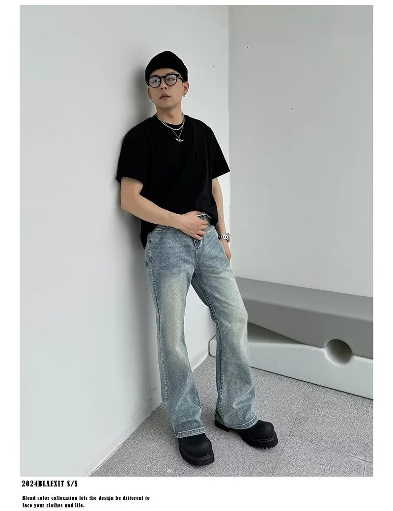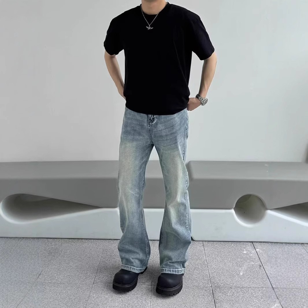 아메리칸 스타일 하이 스트리트 클렌핏 세탁 블루 청바지 남성용 스트레이트 튜브 루즈 마이크로 러 바지 바이브 스타일 트렌디 바지스토어 가기