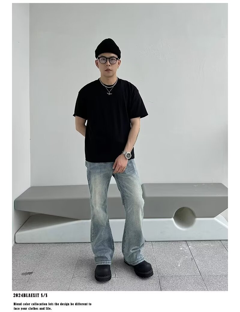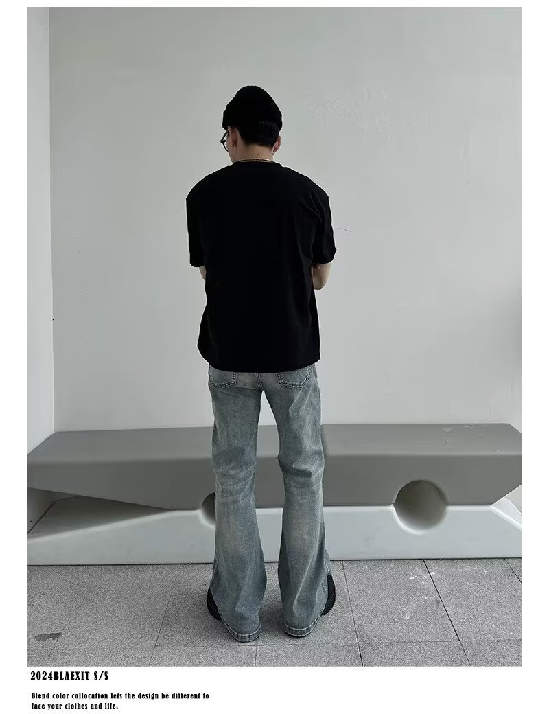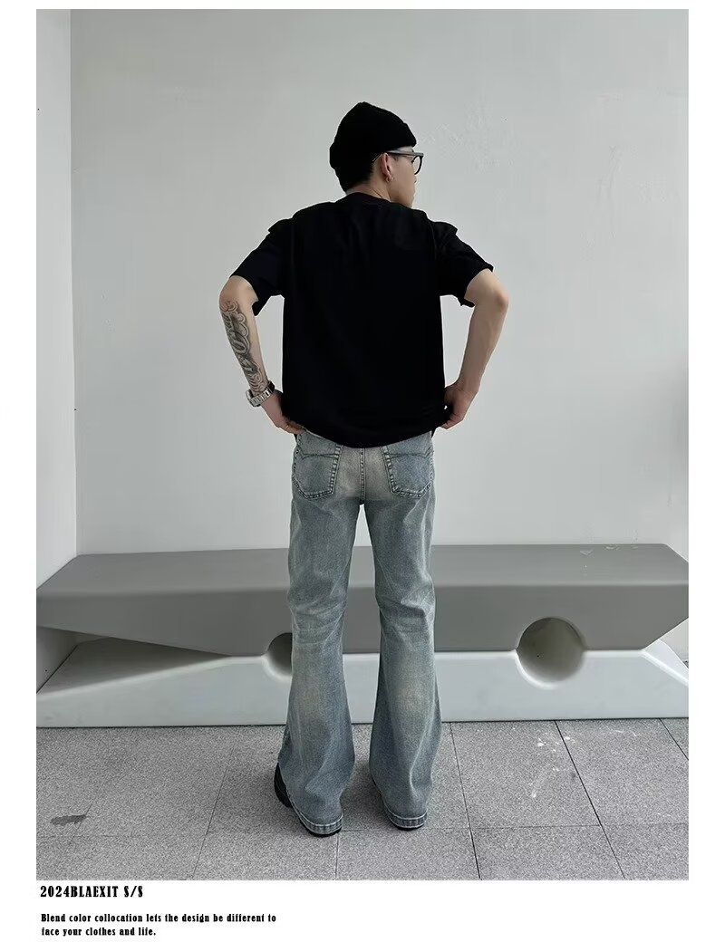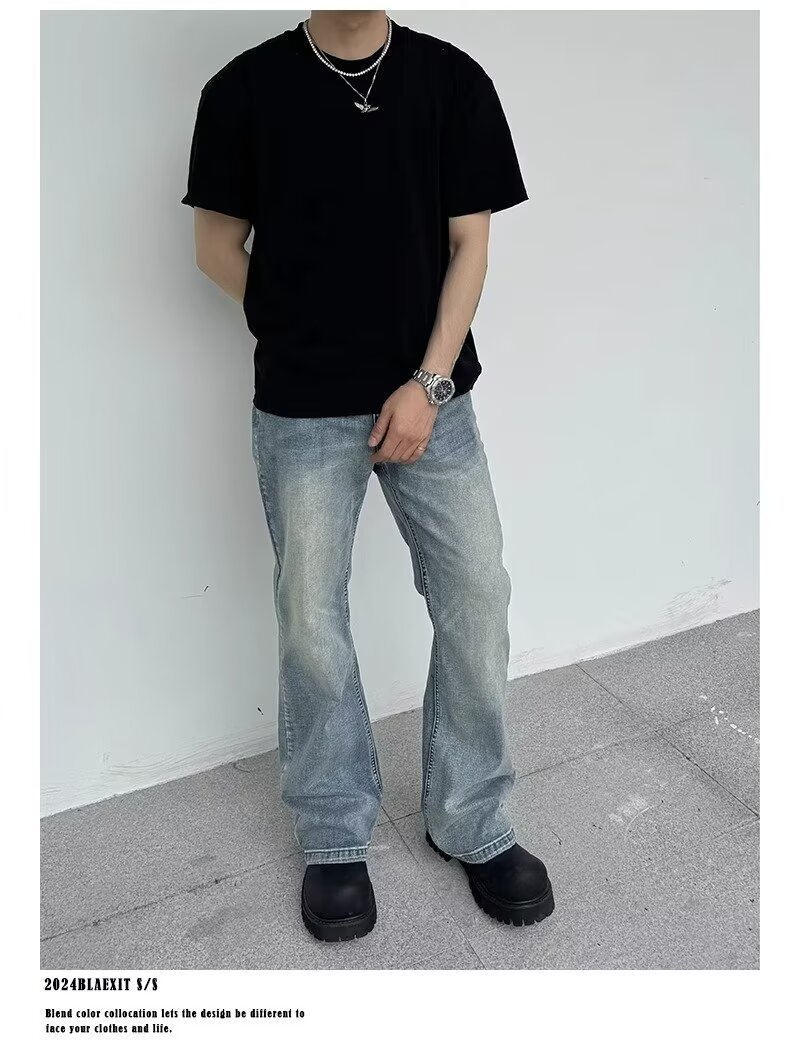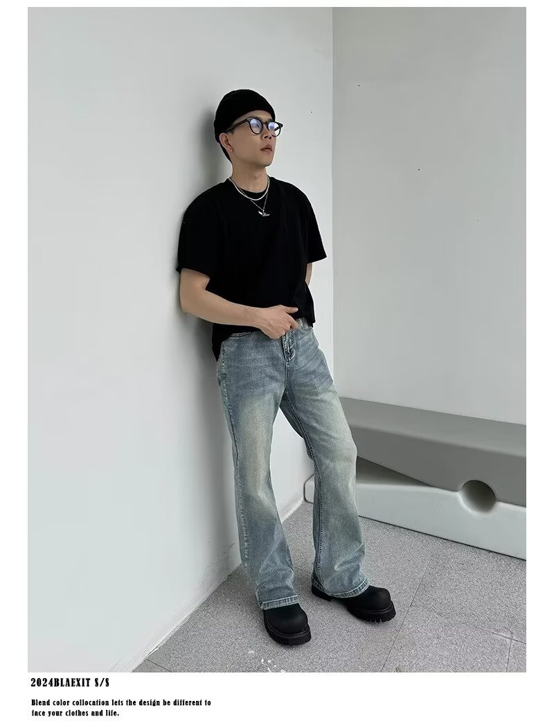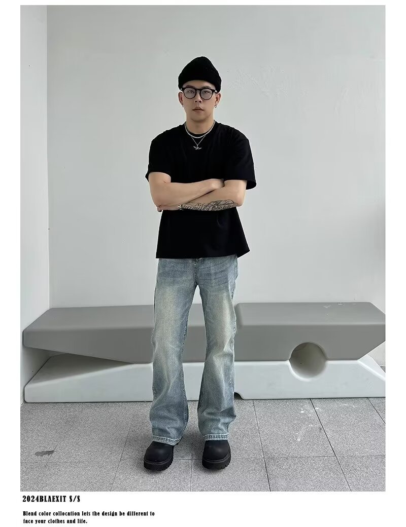 아메리칸 스타일 하이 스트리트 클렌핏 세탁 블루 청바지 남성용 스트레이트 튜브 루즈 마이크로 러 바지 바이브 스타일 트렌디 바지스토어 가기