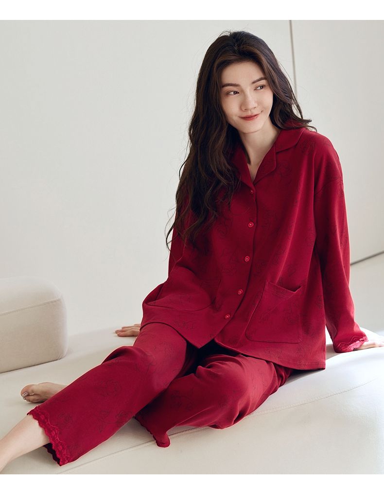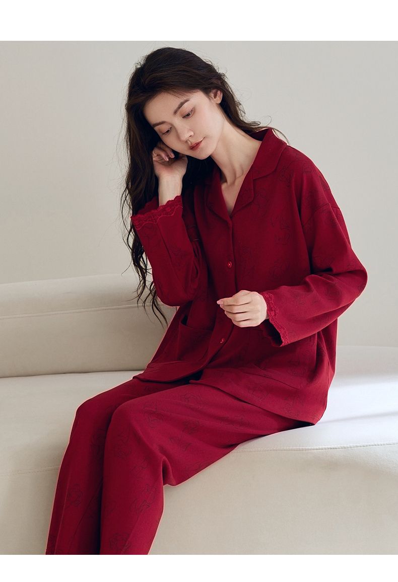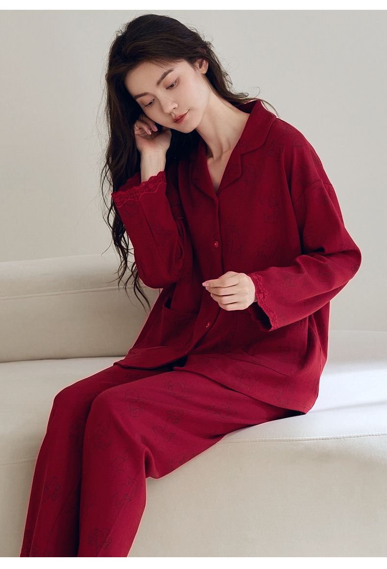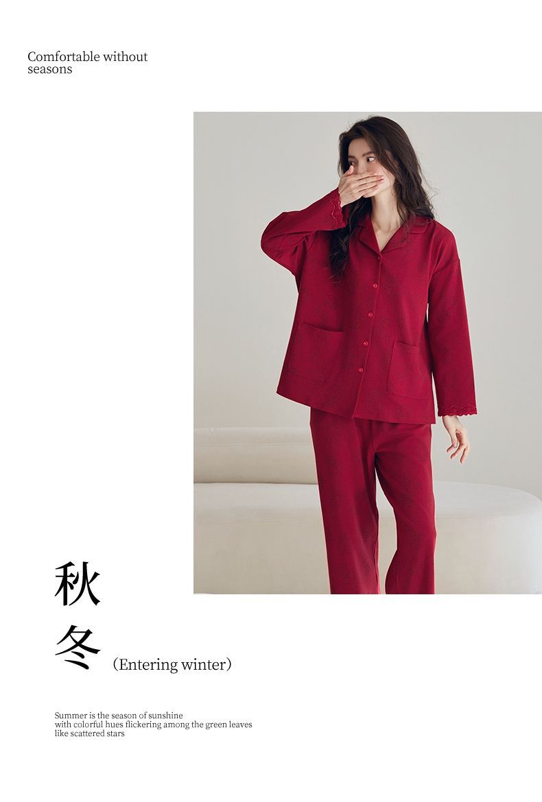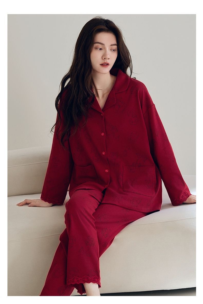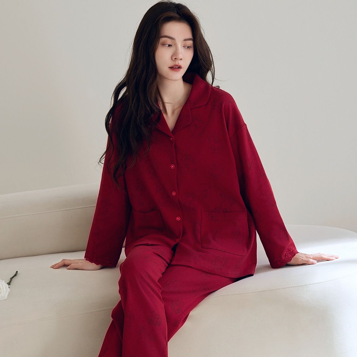 봄과 가을면 긴팔 잠옷 여성용 카디건 옷깃 세트 외출을위한 빨간 간단한 집 옷