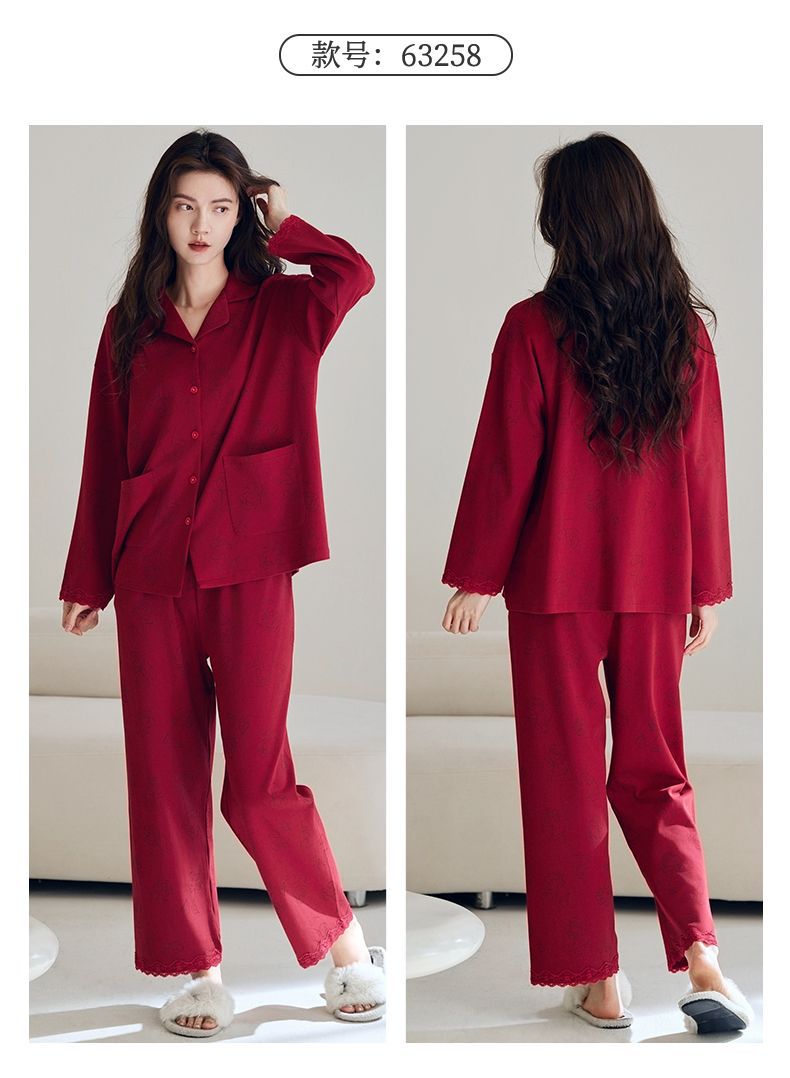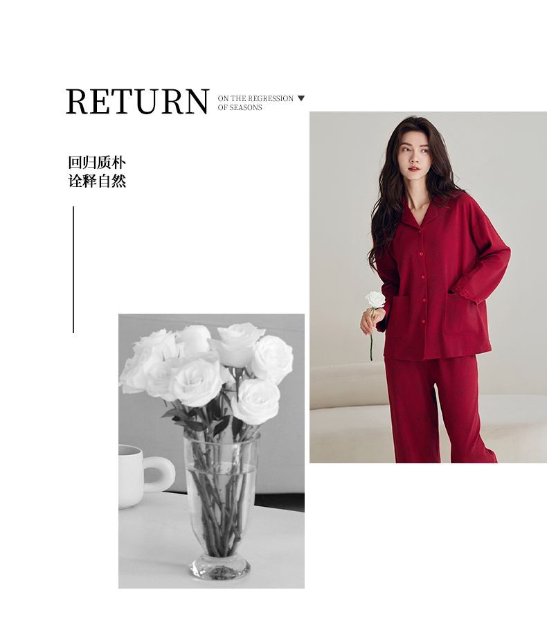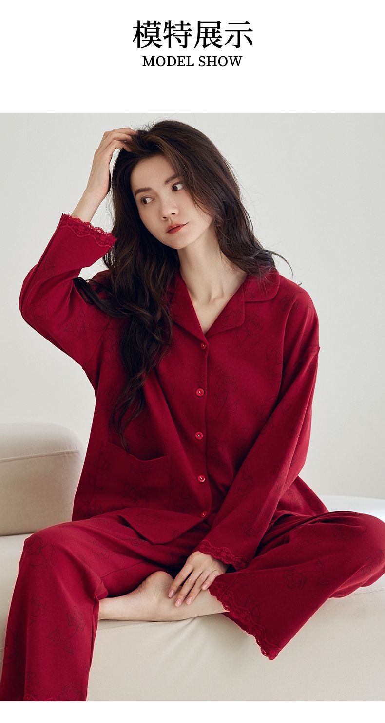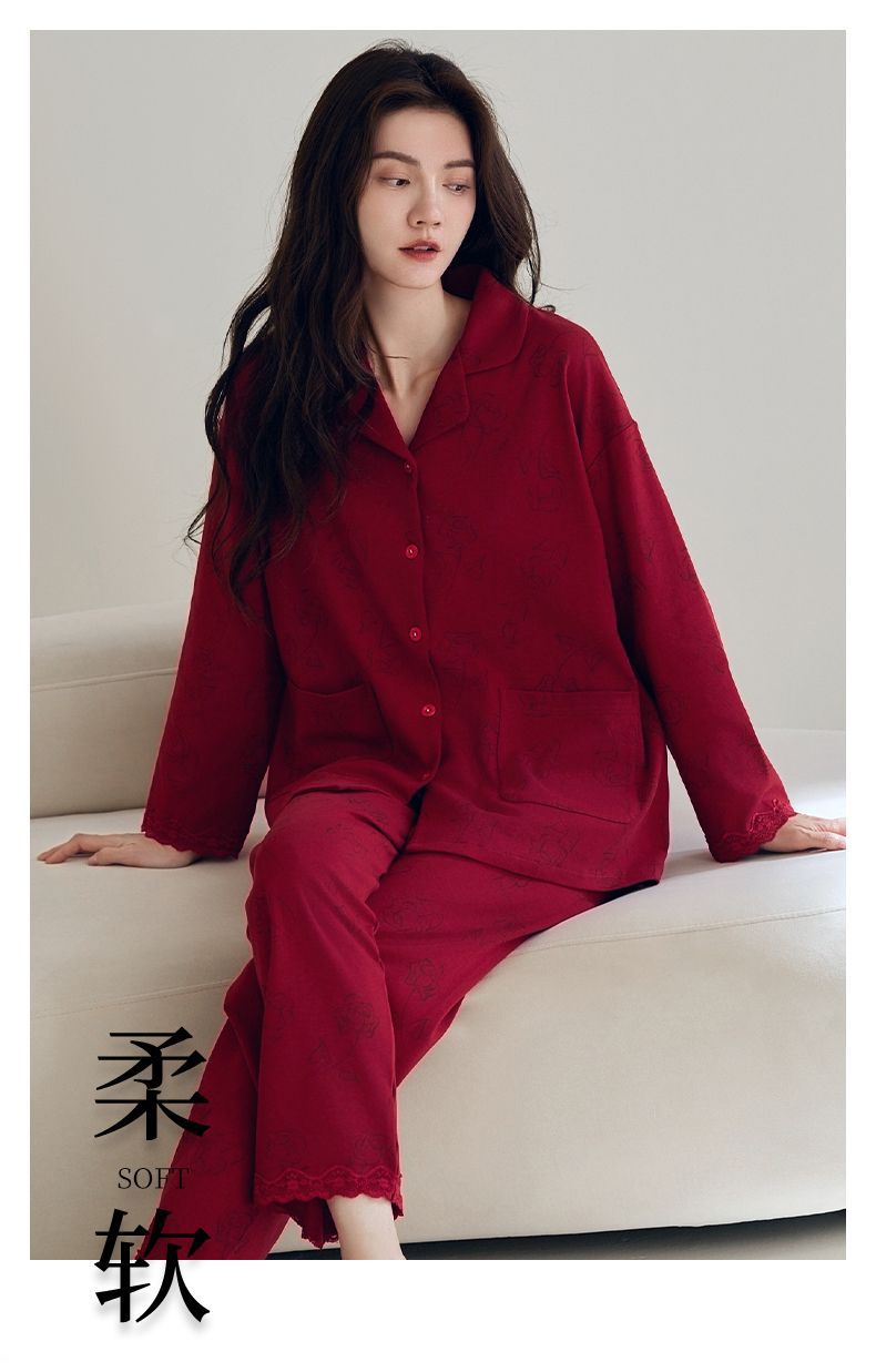 봄과 가을면 긴팔 잠옷 여성용 카디건 옷깃 세트 외출을위한 빨간 간단한 집 옷스토어 가기