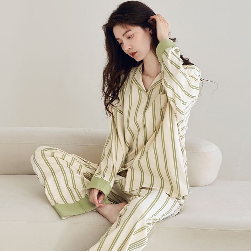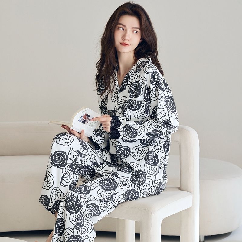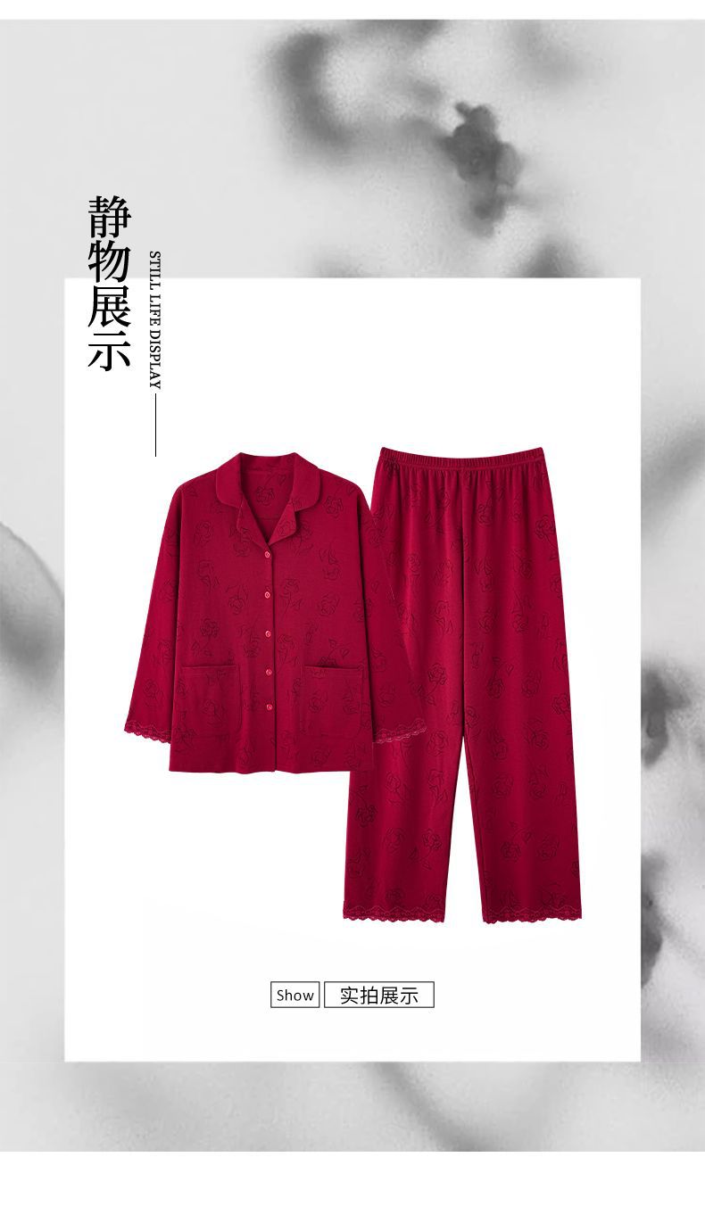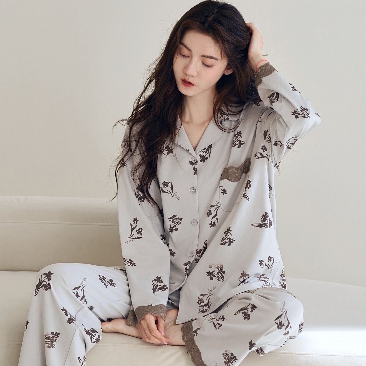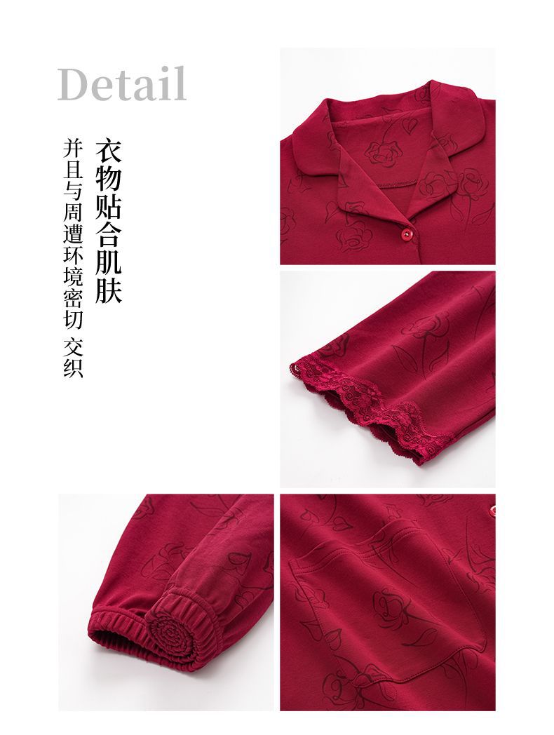 봄과 가을면 긴팔 잠옷 여성용 카디건 옷깃 세트 외출을위한 빨간 간단한 집 옷스토어 가기