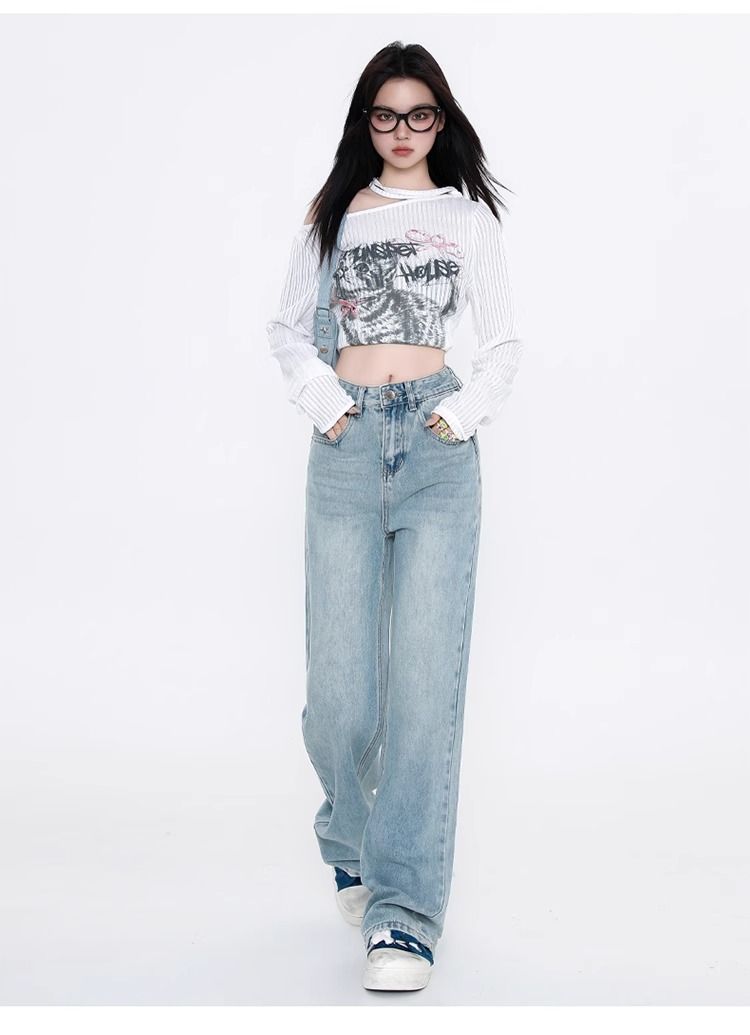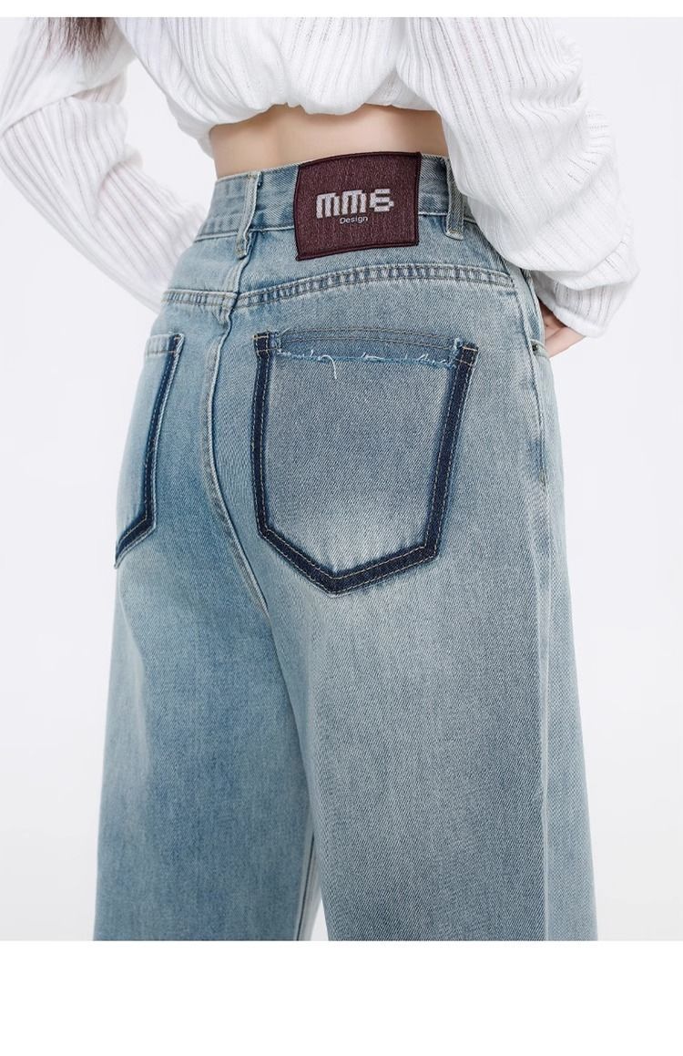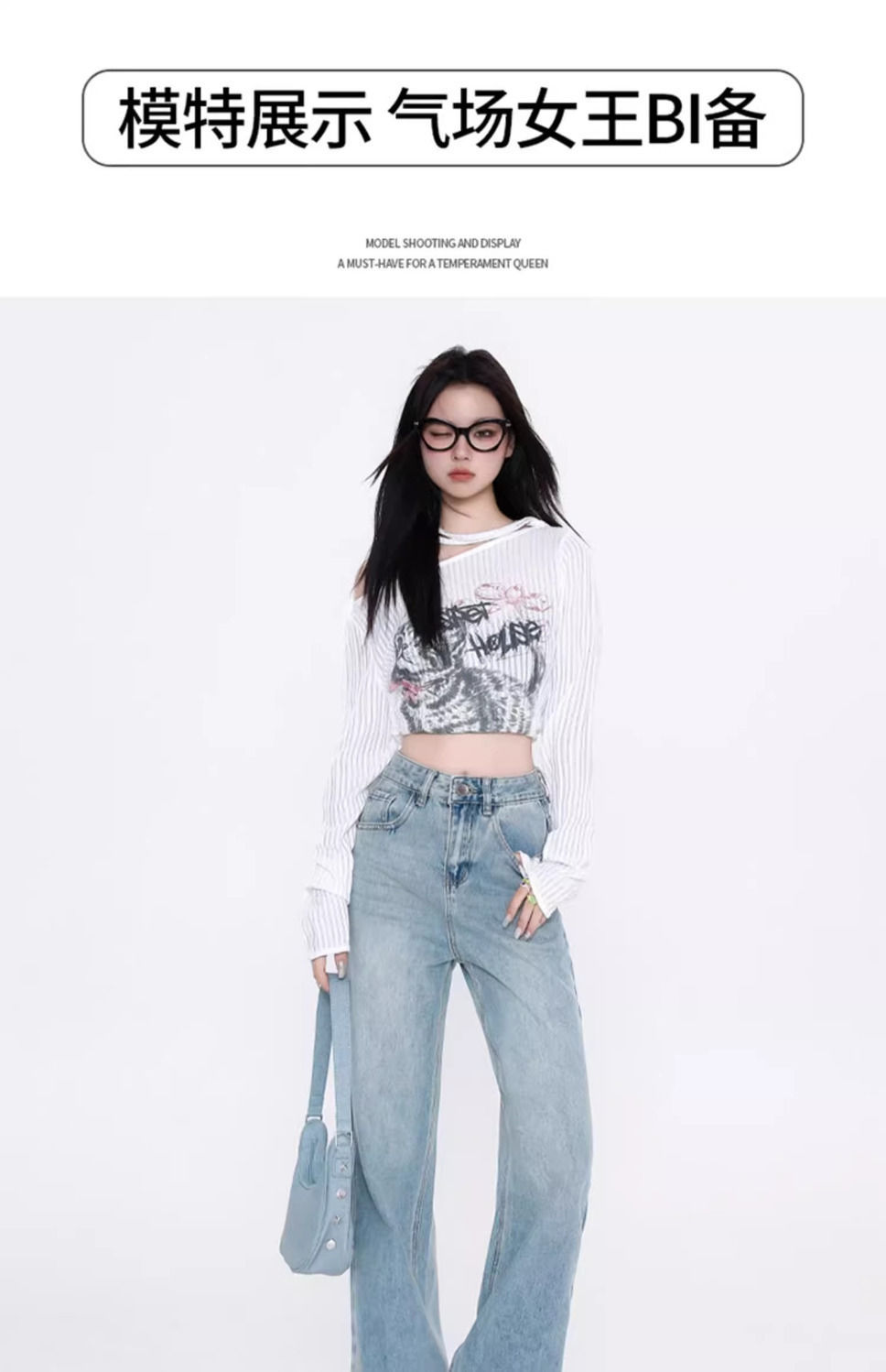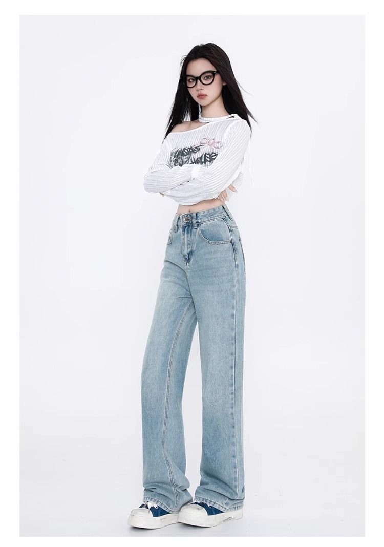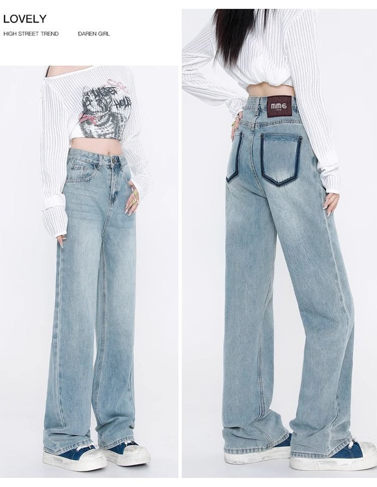 라이트 블루 아메리칸 스타일 높은 허리 넓은 다리 청바지 여성의 2025 봄 Baokuian 느슨한 슬리밍 스트레이트 팬츠스토어 가기