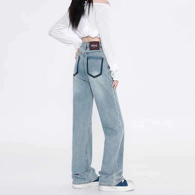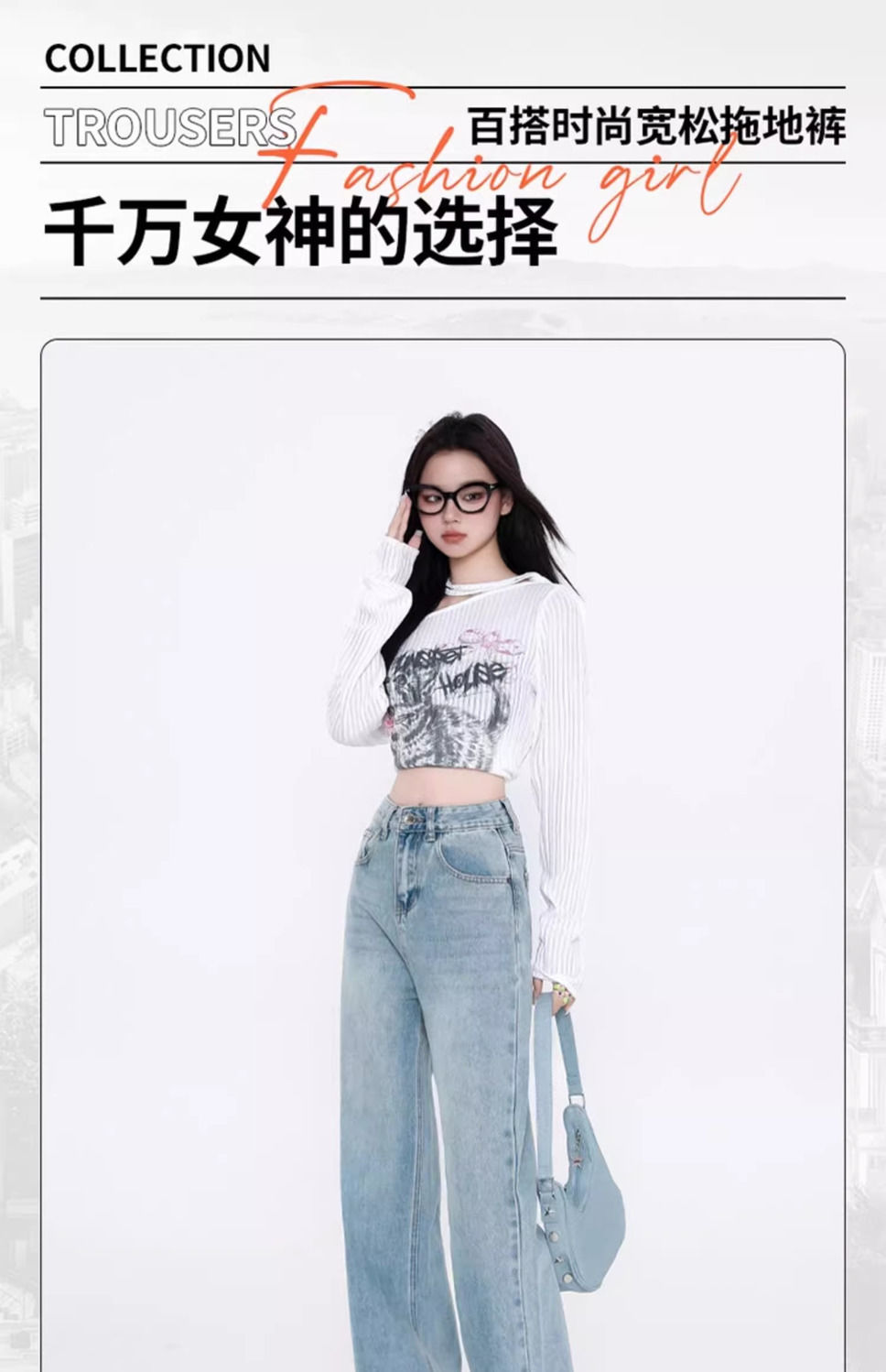 라이트 블루 아메리칸 스타일 높은 허리 넓은 다리 청바지 여성의 2025 봄 Baokuian 느슨한 슬리밍 스트레이트 팬츠