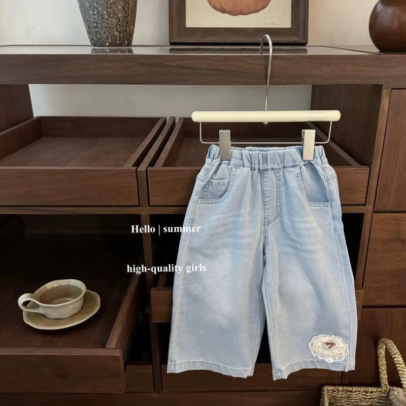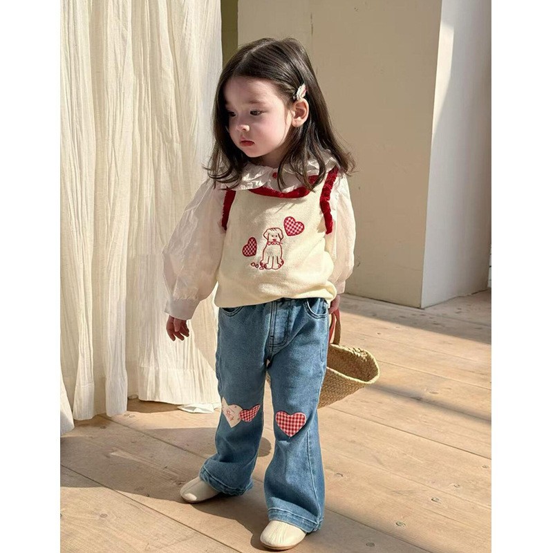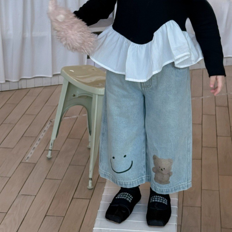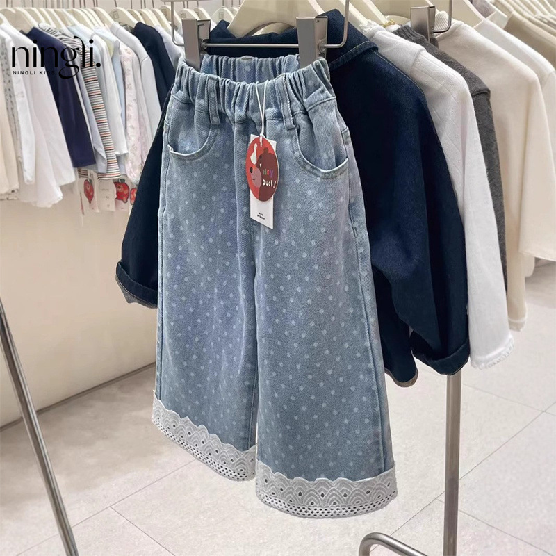 Ningli 여아 바지 봄, 가을 신작 아동 한국식 캐주얼 폴카 도트 레이스 와이드 팬츠 베이비 캐주얼 청바지