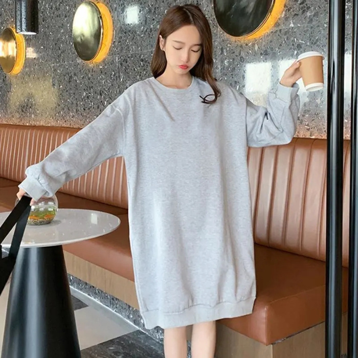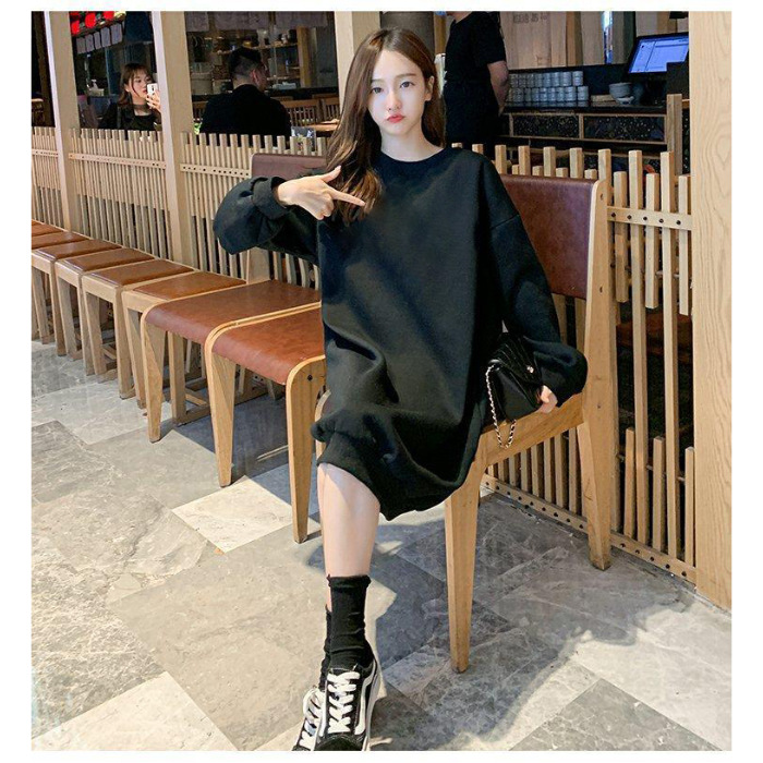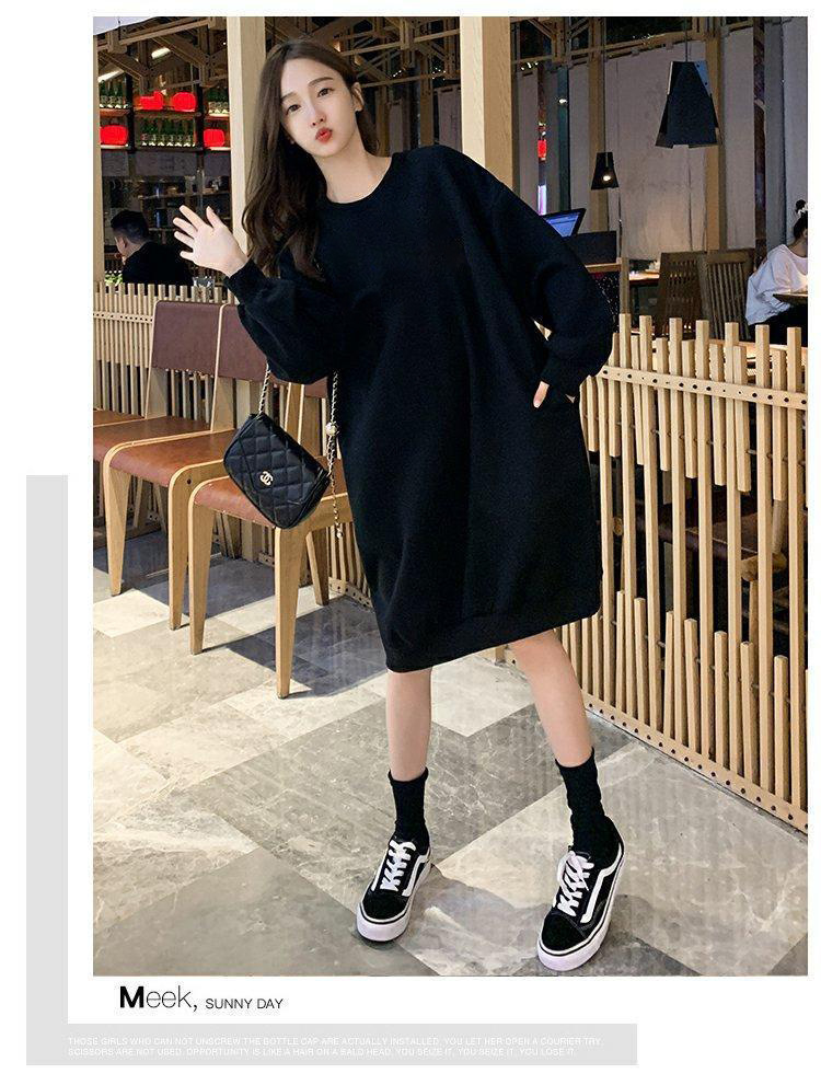 기모 두껍게 250g 플러스 사이즈 연령 감소 중간 원피스 여성 한국 느슨한 슬림 크루 넥 원피스