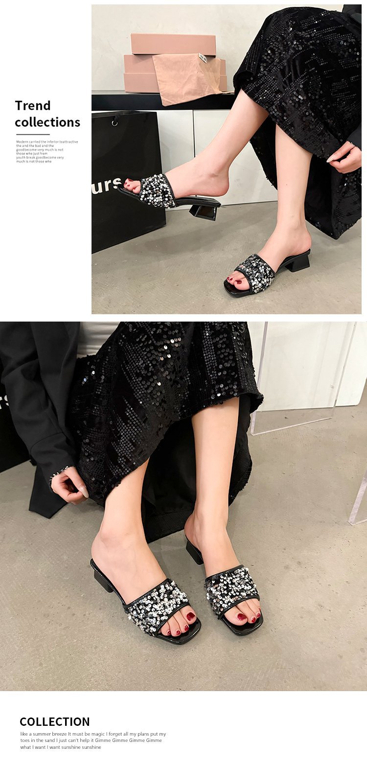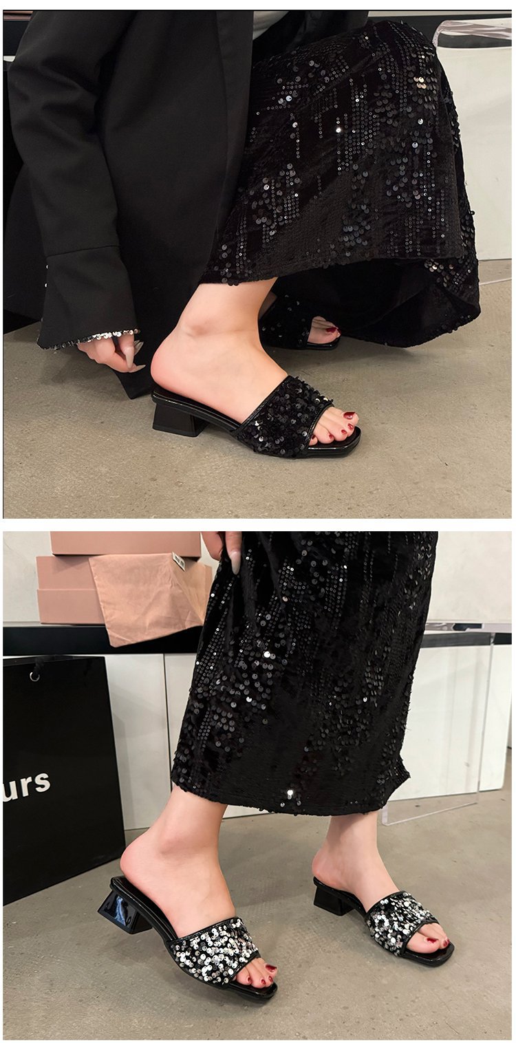 사이버 연예인 Sequin 슬리퍼 여성 2025 년 새로운 슈퍼 핫 여름 우아한 아우터 올 매치 슬라이드 프렌치 청키 힐 샌들스토어 가기