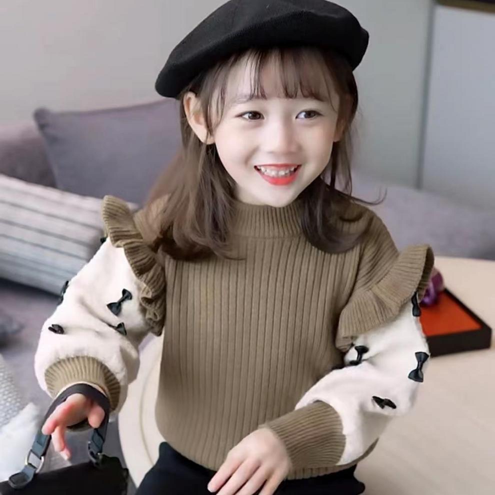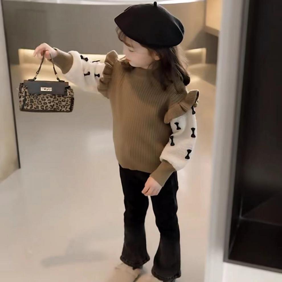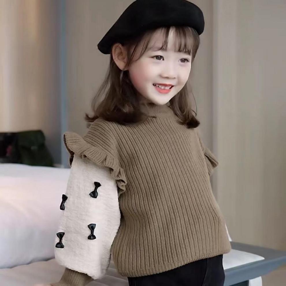 여자 스웨터 겨울 2024 새로운 아기 바느질 한국 스타일 풀오버 어린이 퍼프 슬리브 공주 스타일 니트웨어