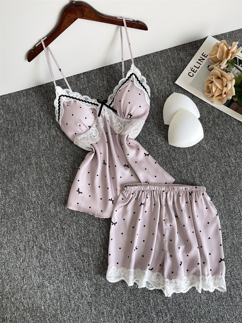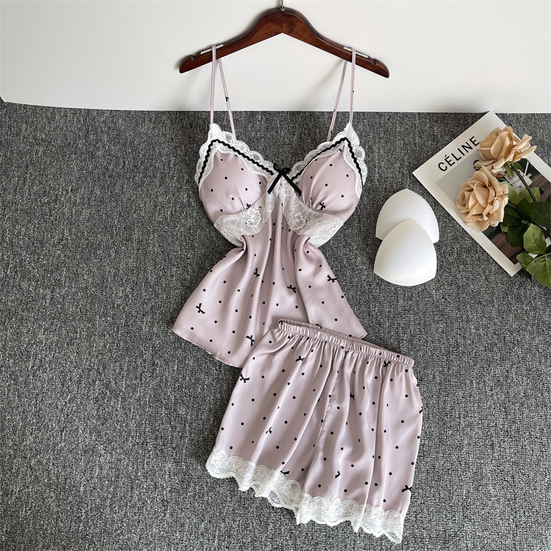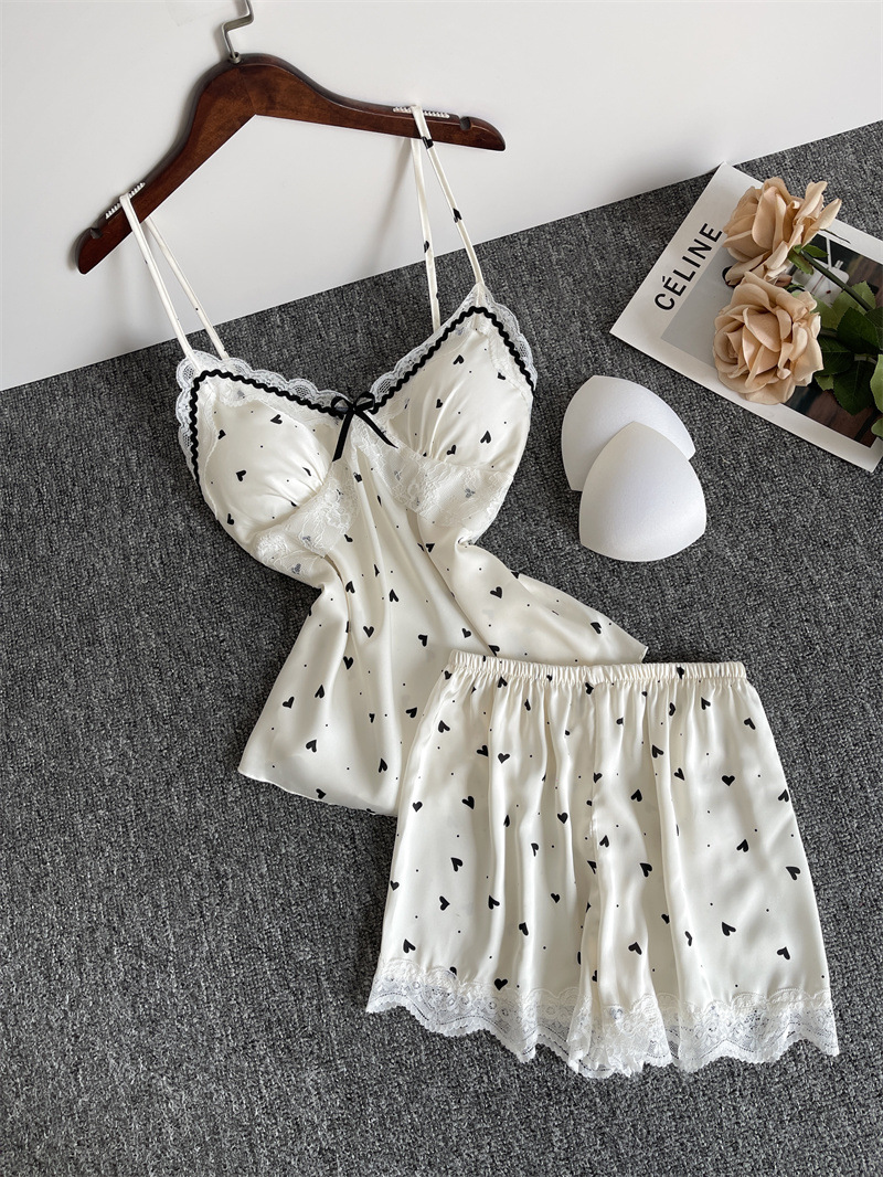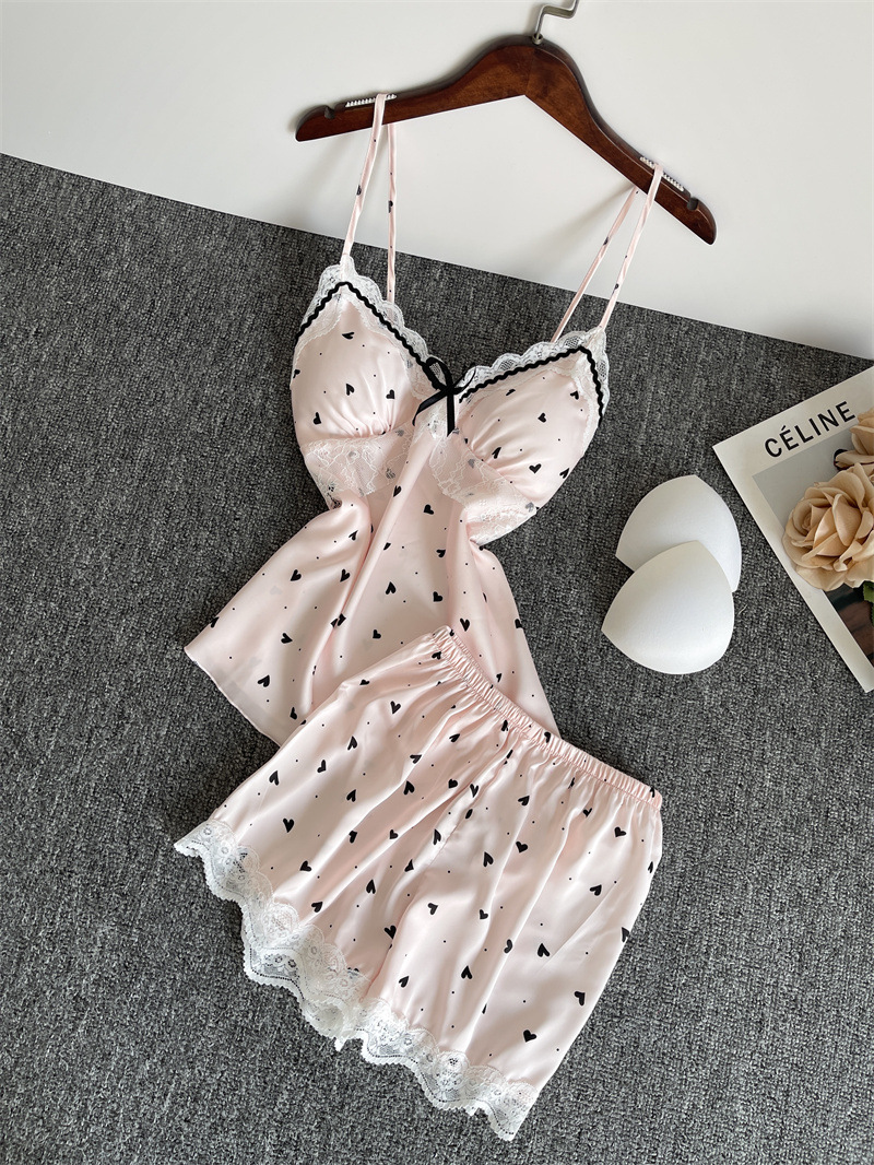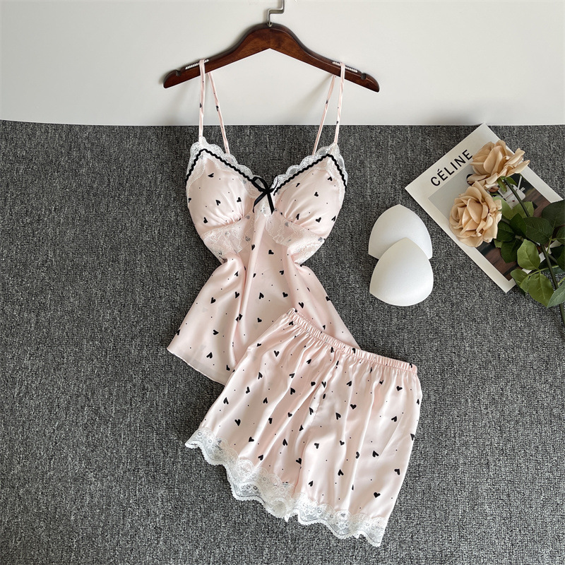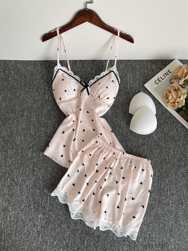 순수한 욕망 파자마 여성의 여름 아이스 실크 섹시한 달콤한 홈 옷 레이스 슬링 반바지 세트 봄과 가을