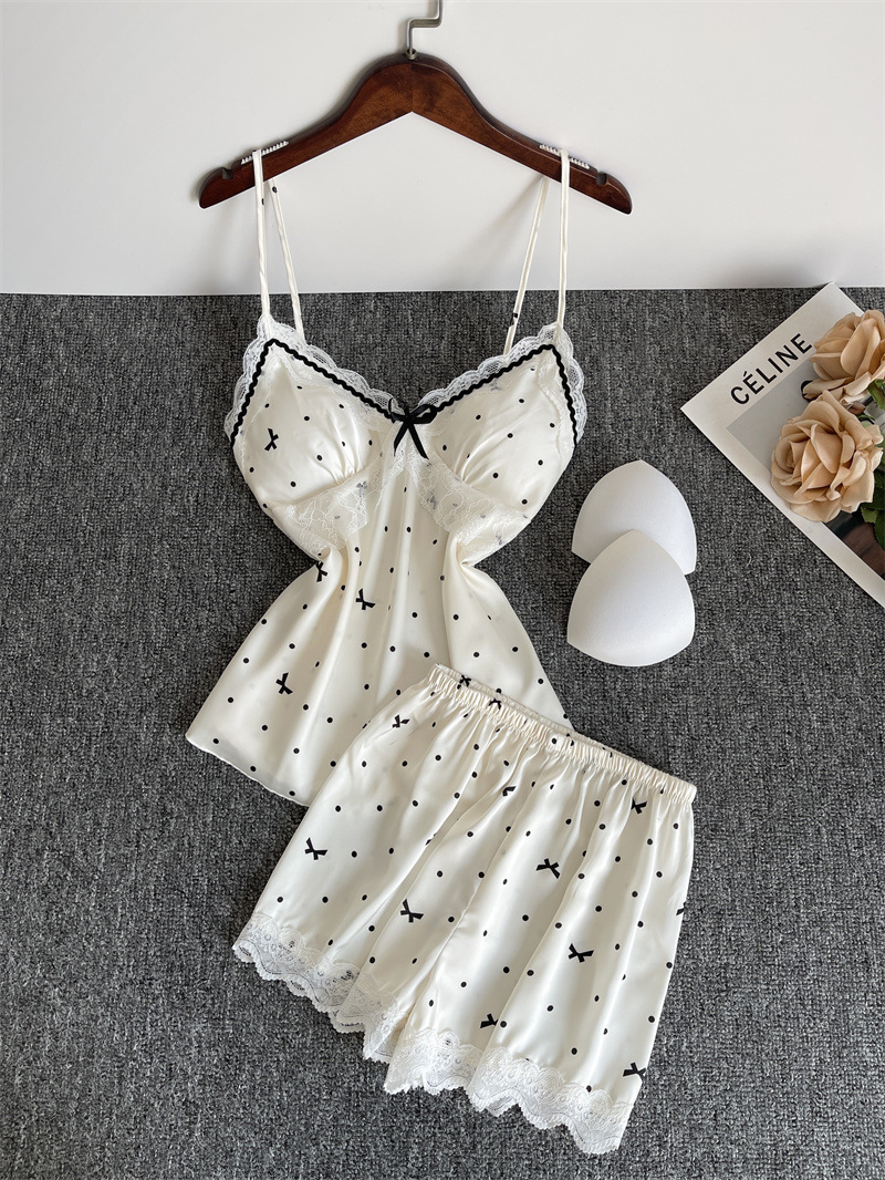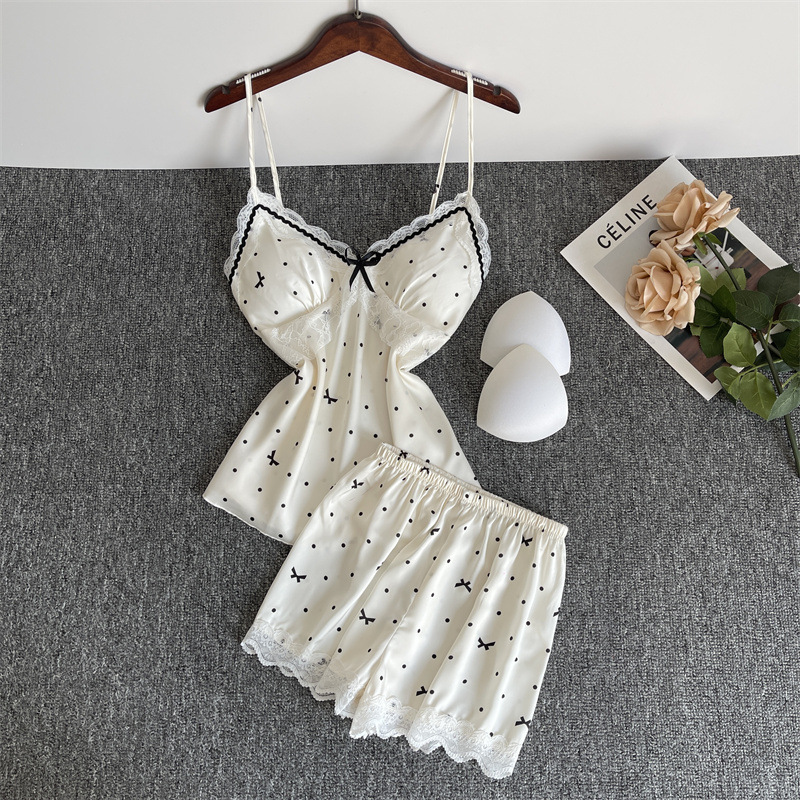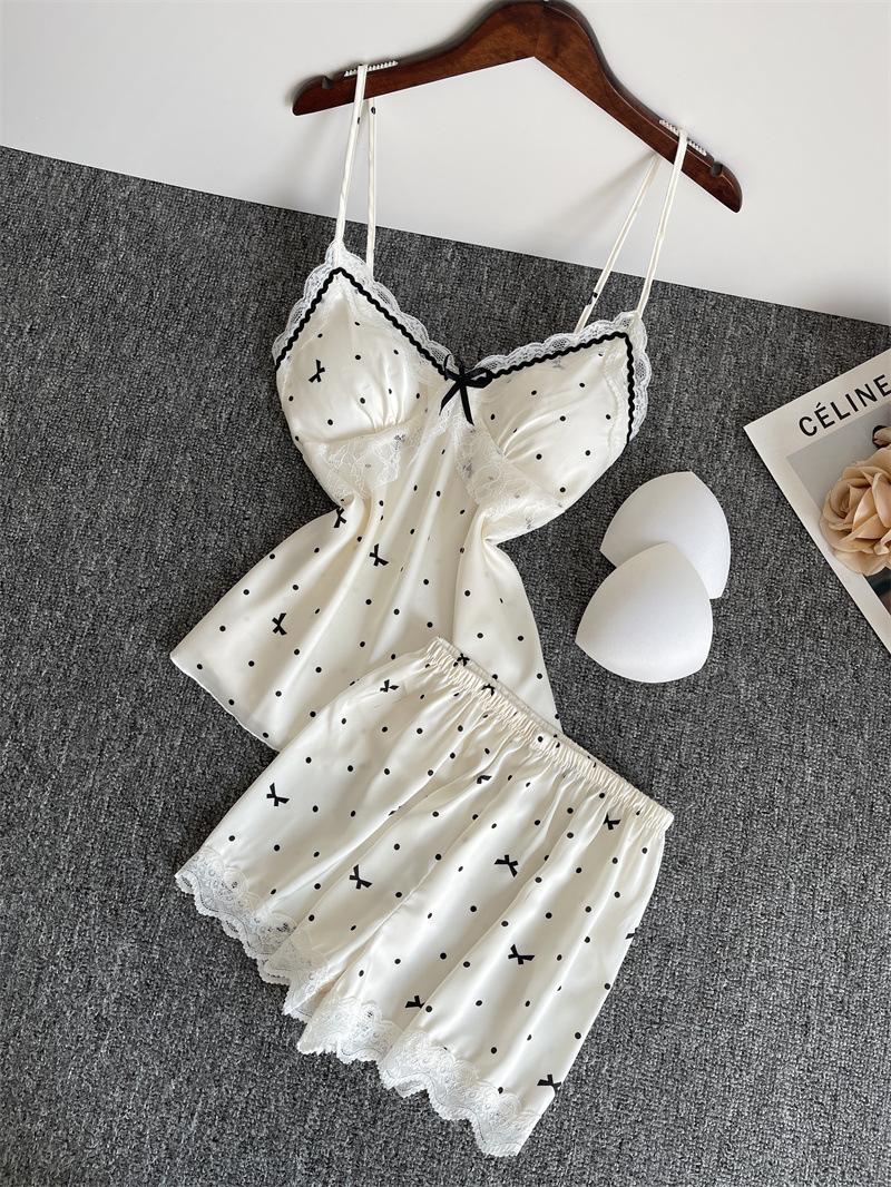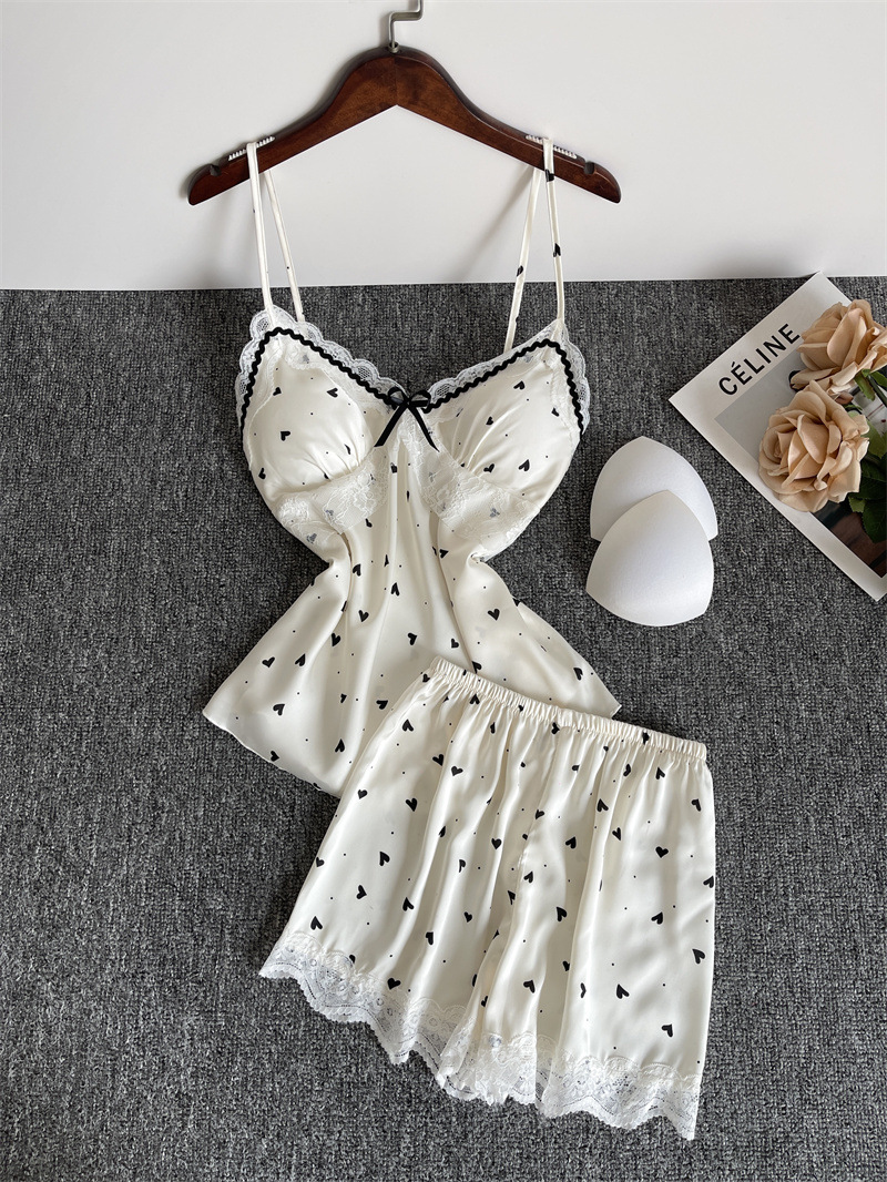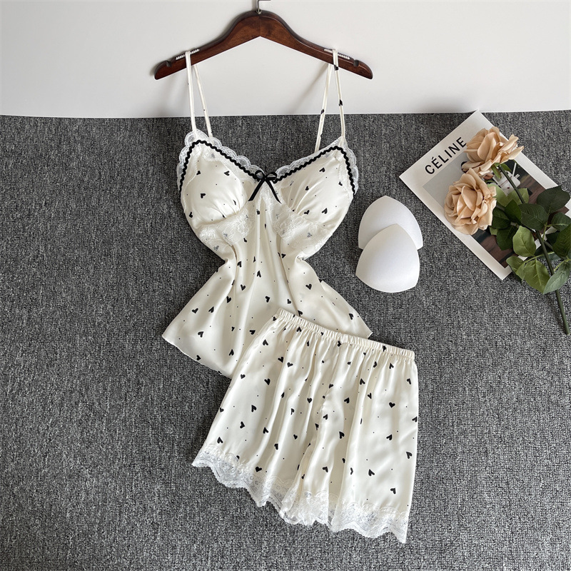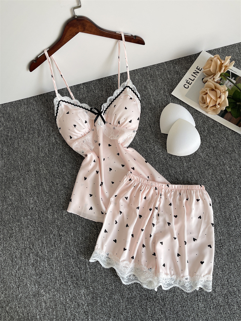 순수한 욕망 파자마 여성의 여름 아이스 실크 섹시한 달콤한 홈 옷 레이스 슬링 반바지 세트 봄과 가을