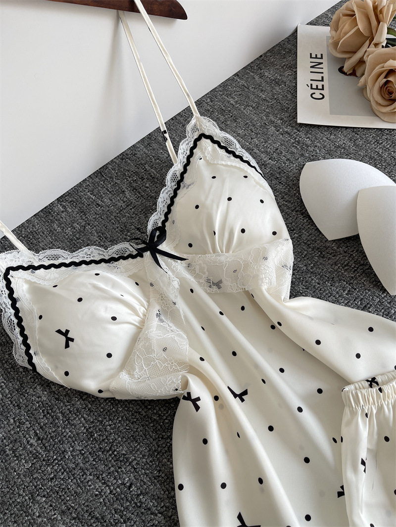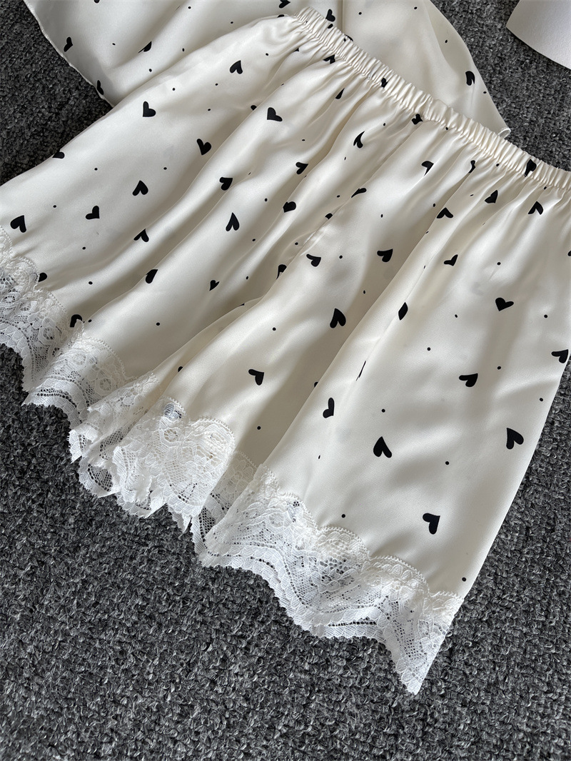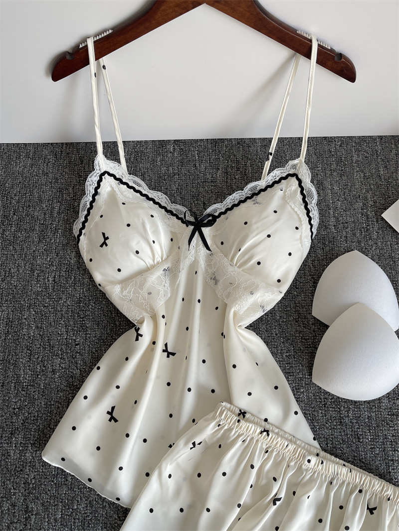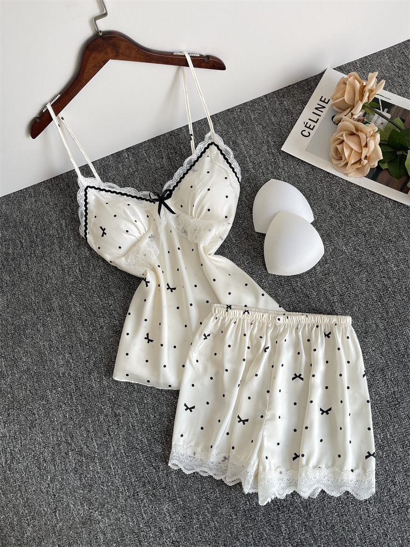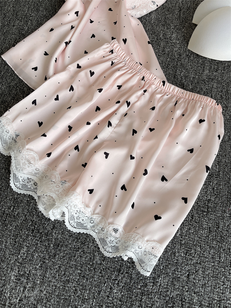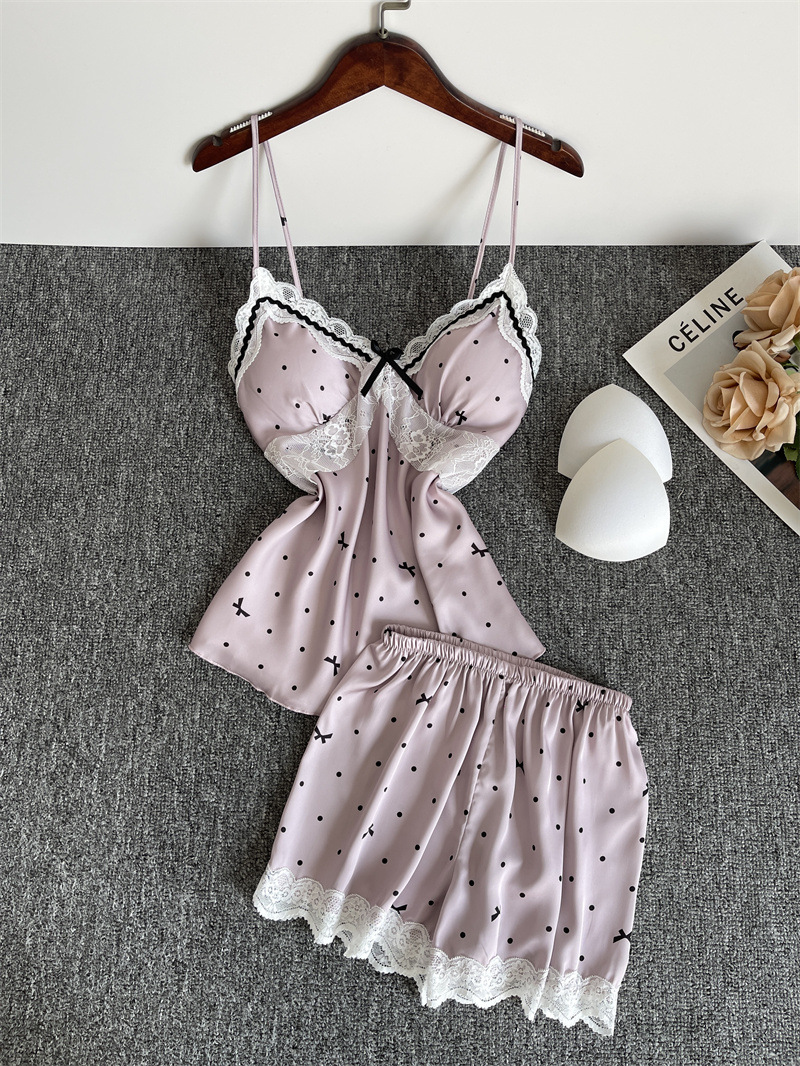 순수한 욕망 파자마 여성의 여름 아이스 실크 섹시한 달콤한 홈 옷 레이스 슬링 반바지 세트 봄과 가을