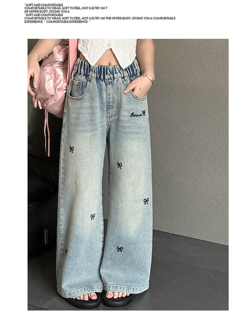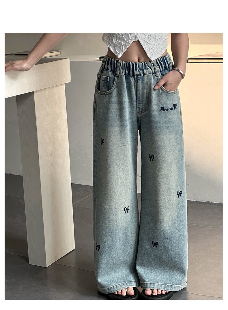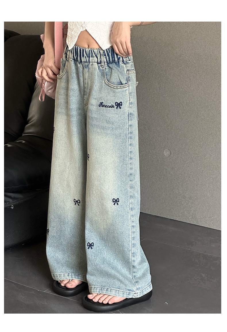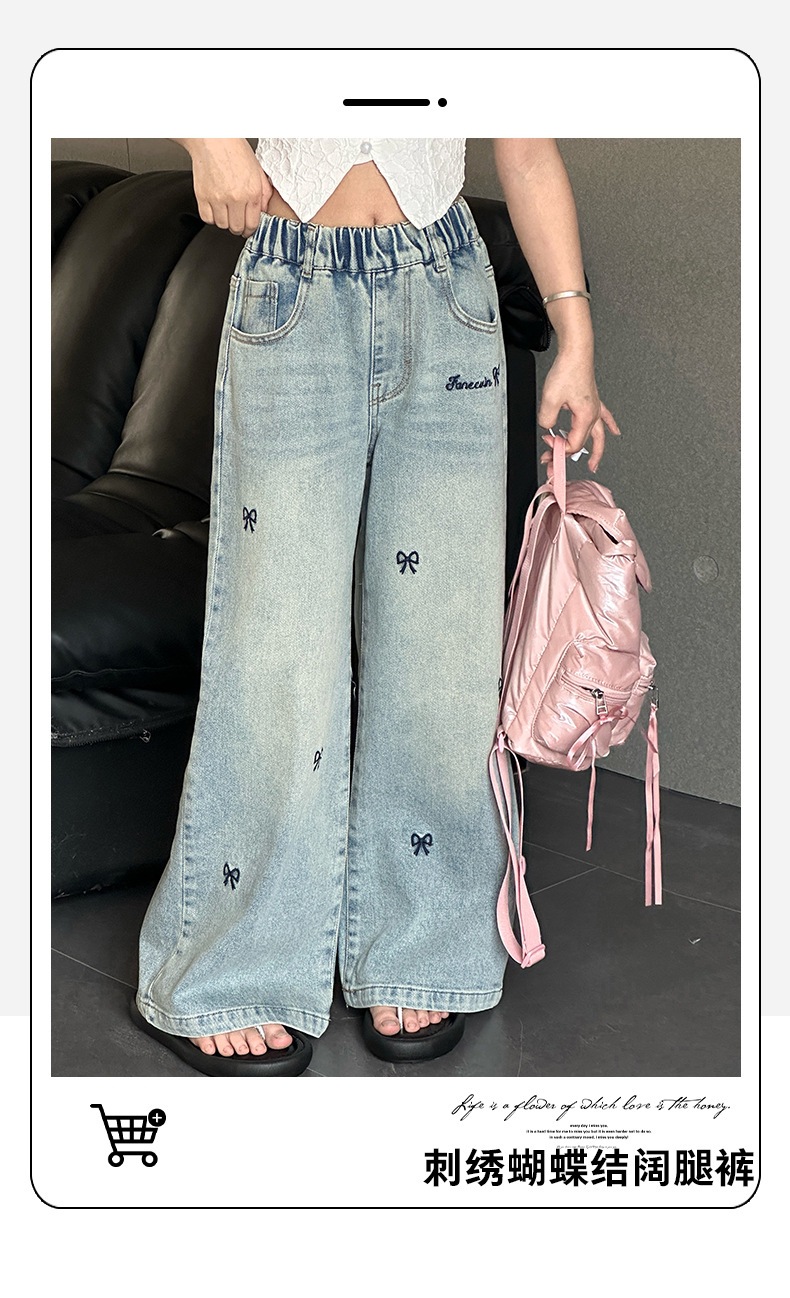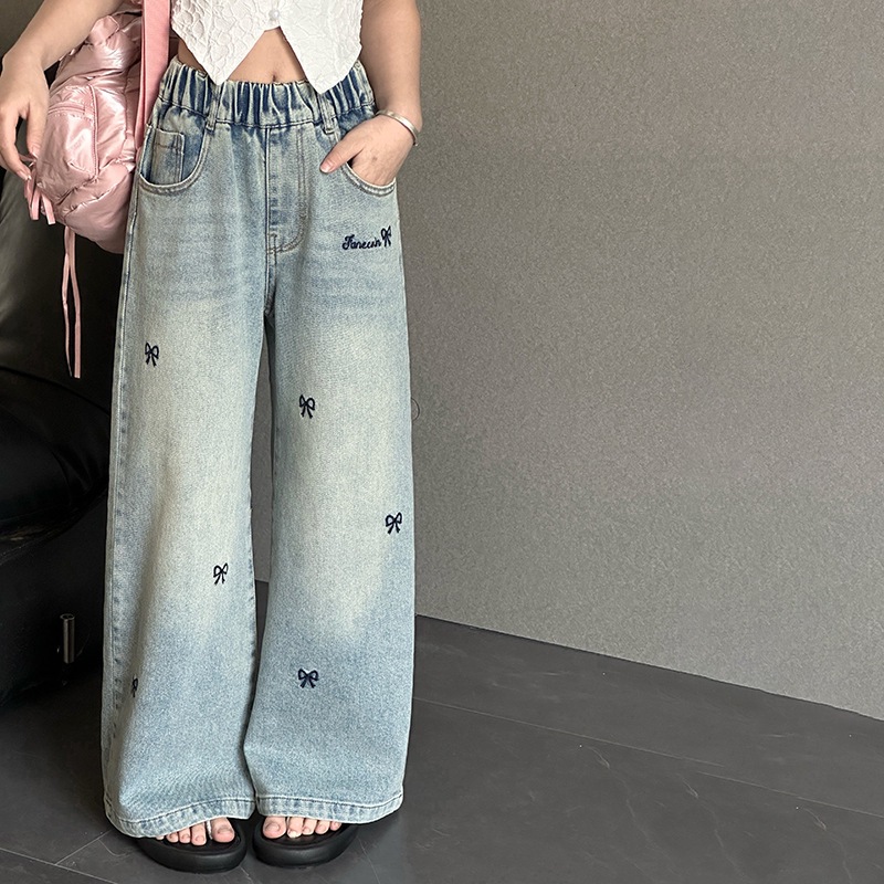 소녀 자수 활 청바지 2025 봄 중대형 어린이 새로운 한국 스타일 데님 넓은 다리 트렌디 바지