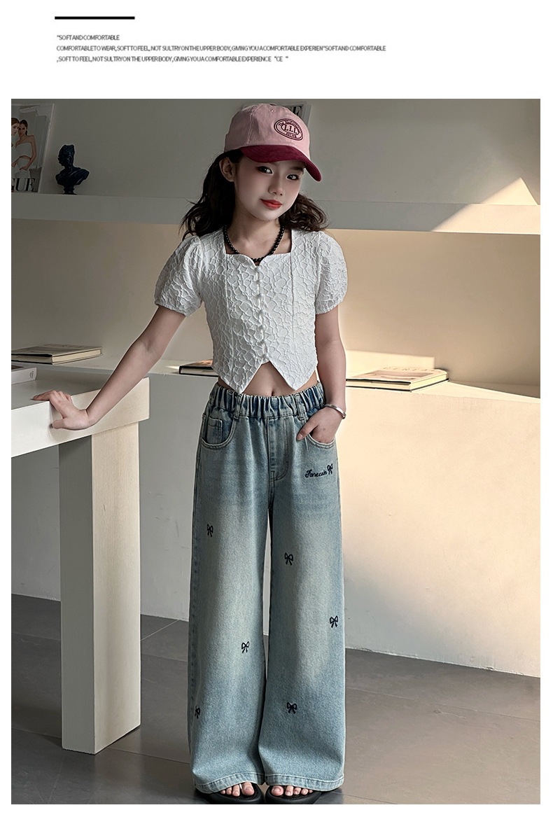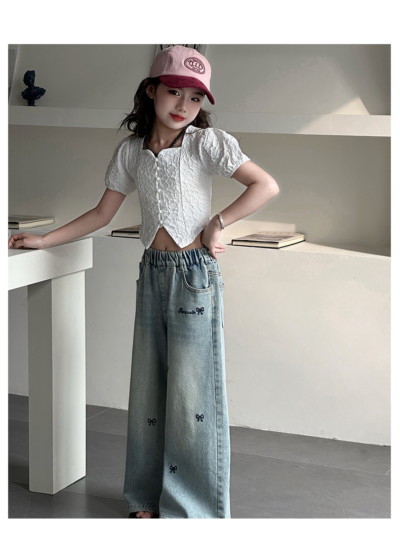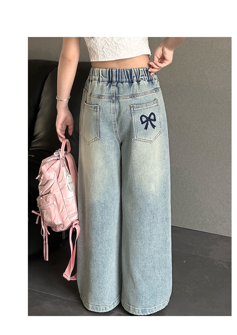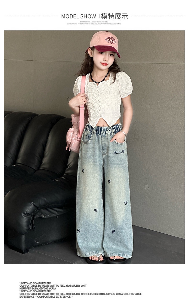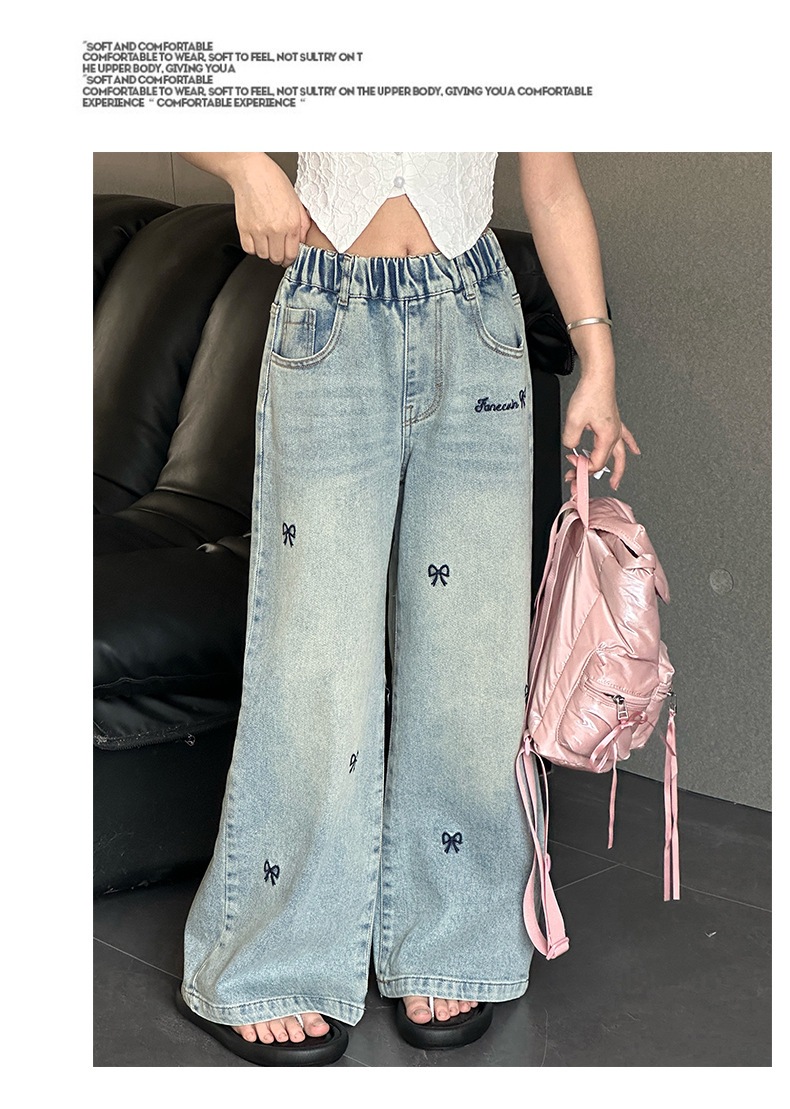 소녀 자수 활 청바지 2025 봄 중대형 어린이 새로운 한국 스타일 데님 넓은 다리 트렌디 바지
