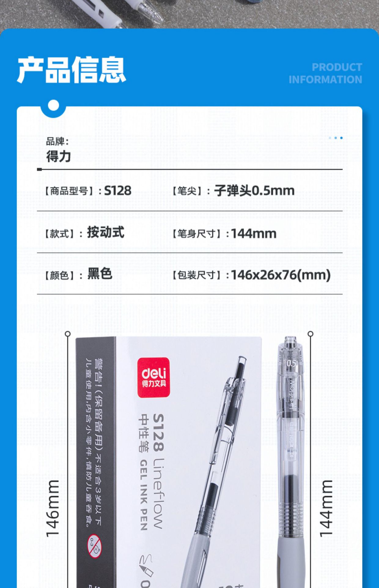 델리 S128 프레스 젤 펜 0.5mm 검은 총알 펜 학생 사무실 볼펜 머리카락 세대