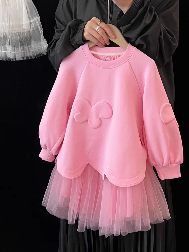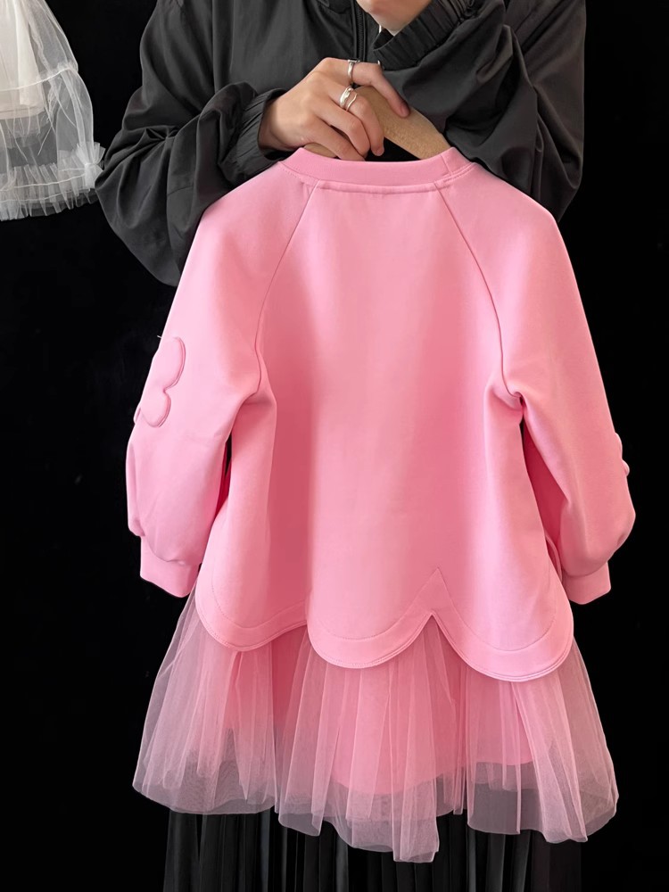 [핑크 하우스 걸스 원피스 봄 새로운 어린이 프랑스 달콤한 디자인 센스 메쉬 스티칭 스웨트 셔츠 원피스스토어 가기