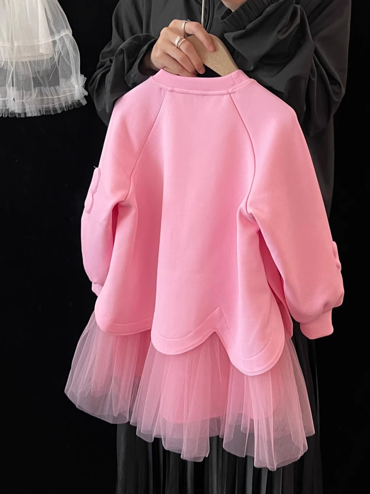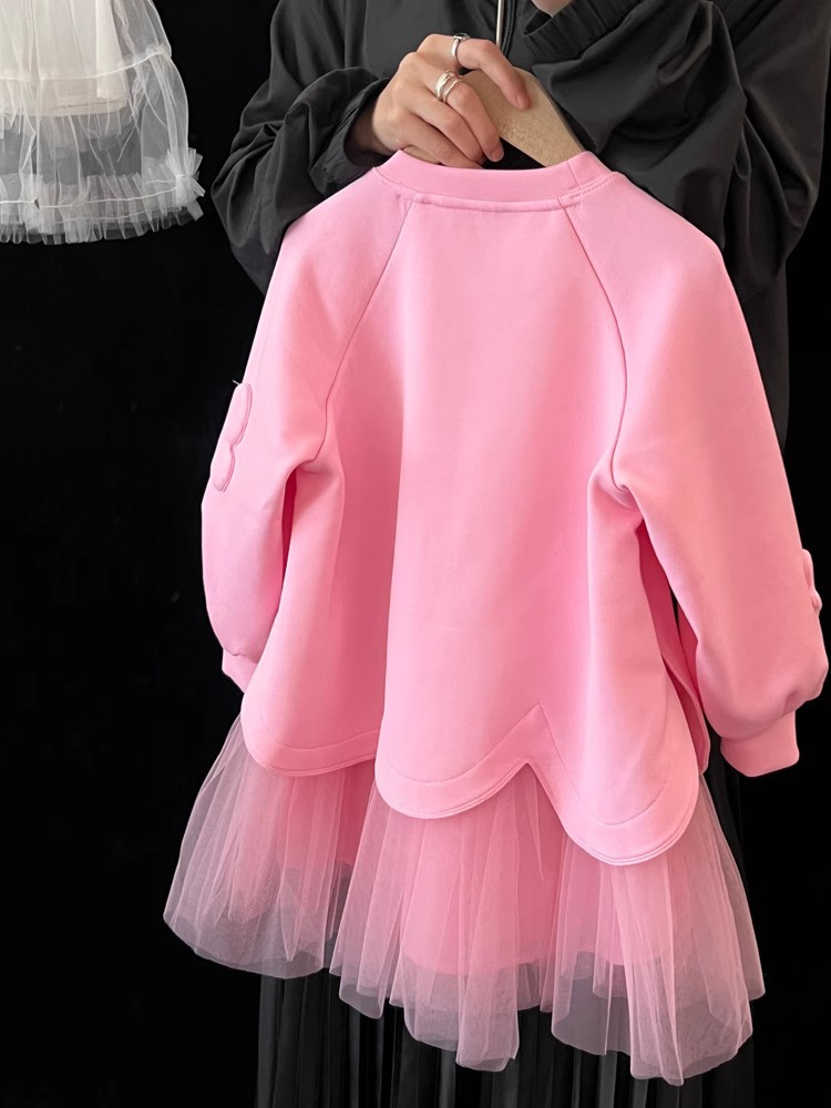 [핑크 하우스 걸스 원피스 봄 새로운 어린이 프랑스 달콤한 디자인 센스 메쉬 스티칭 스웨트 셔츠 원피스