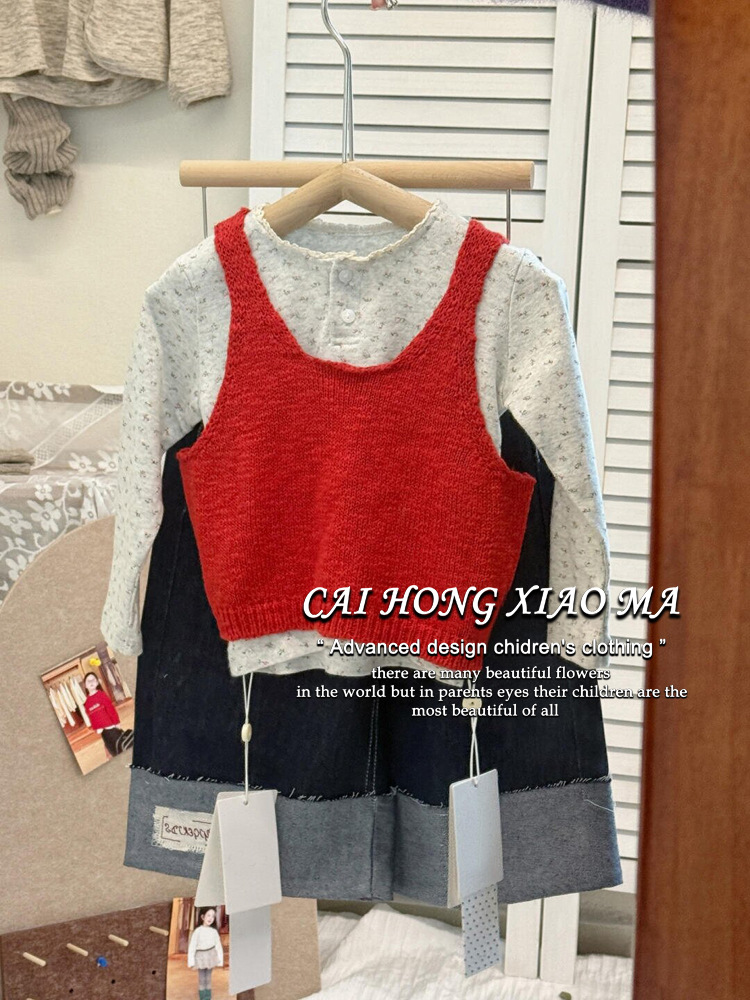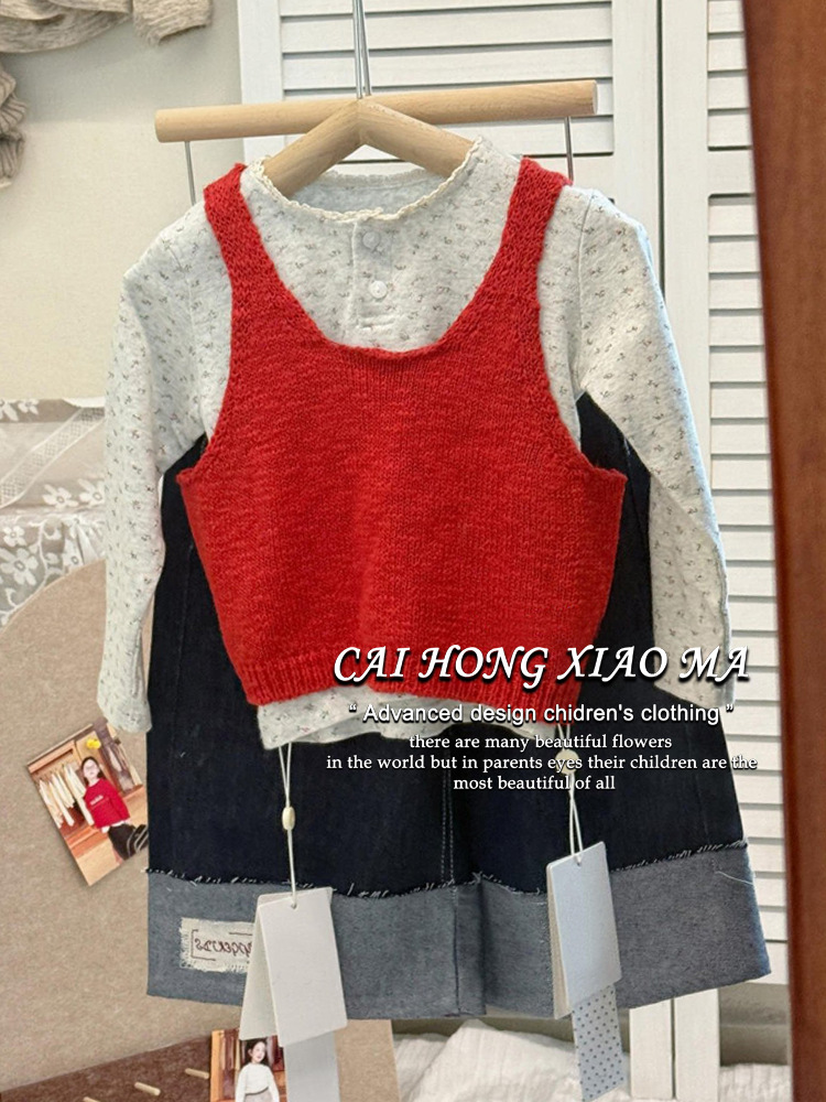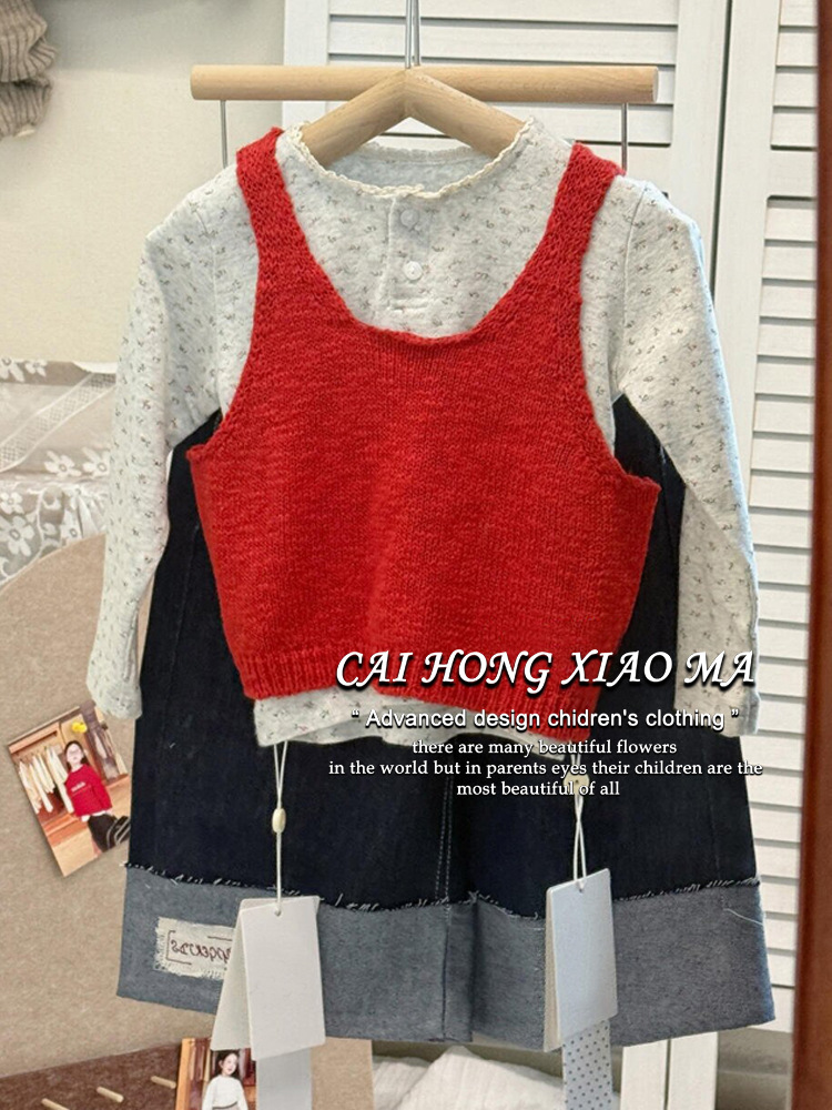 Tongxingyuan 2025 봄 새 소녀 한국 세트 어린이 꽃 무늬 긴 소매 탑 니트 조끼 청바지