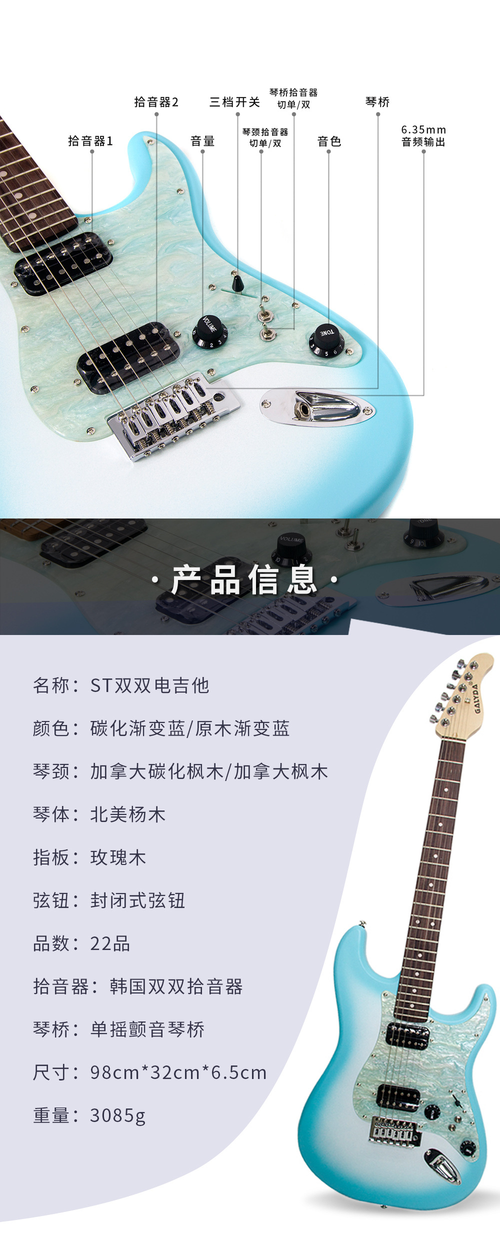 • 39inch ST 듀얼 듀얼 일렉트릭 기타/카바이드 그라데이션 블루