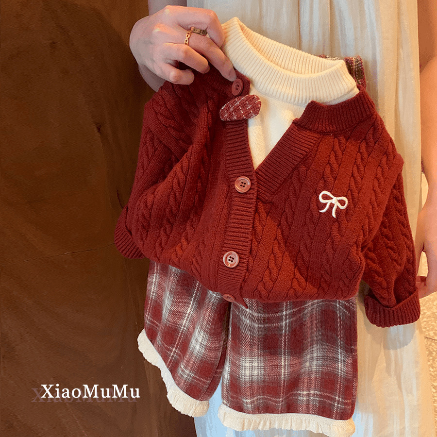 • 빨간색 페이크 투피스 스웨터 + 빨간색 체크 무늬 바지(벨벳 및 두꺼워짐)