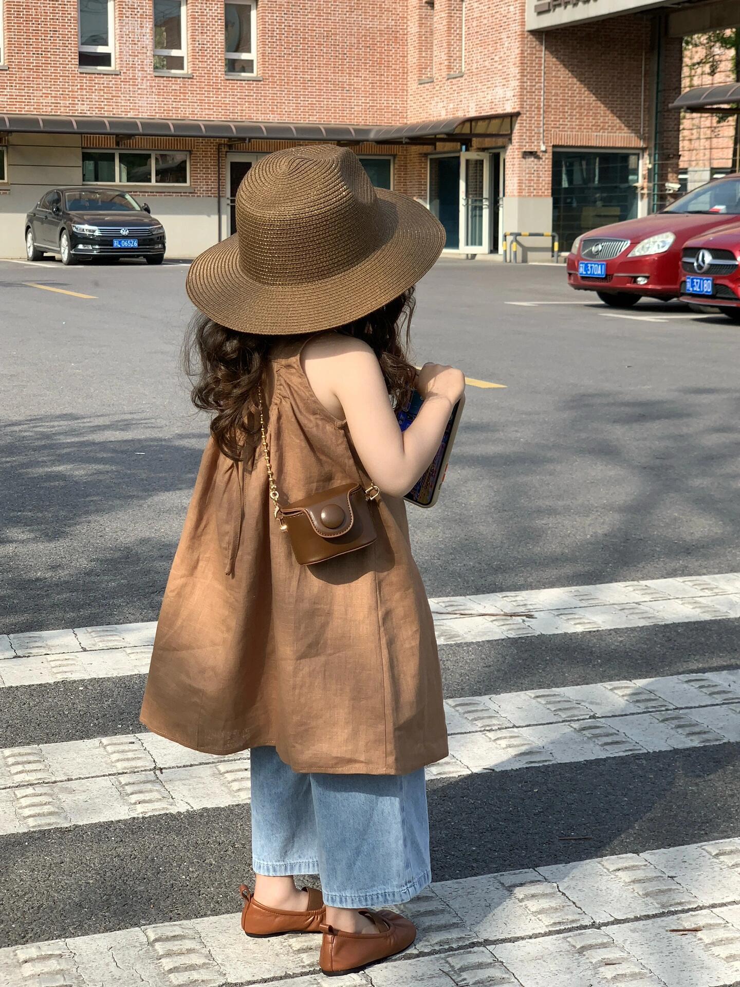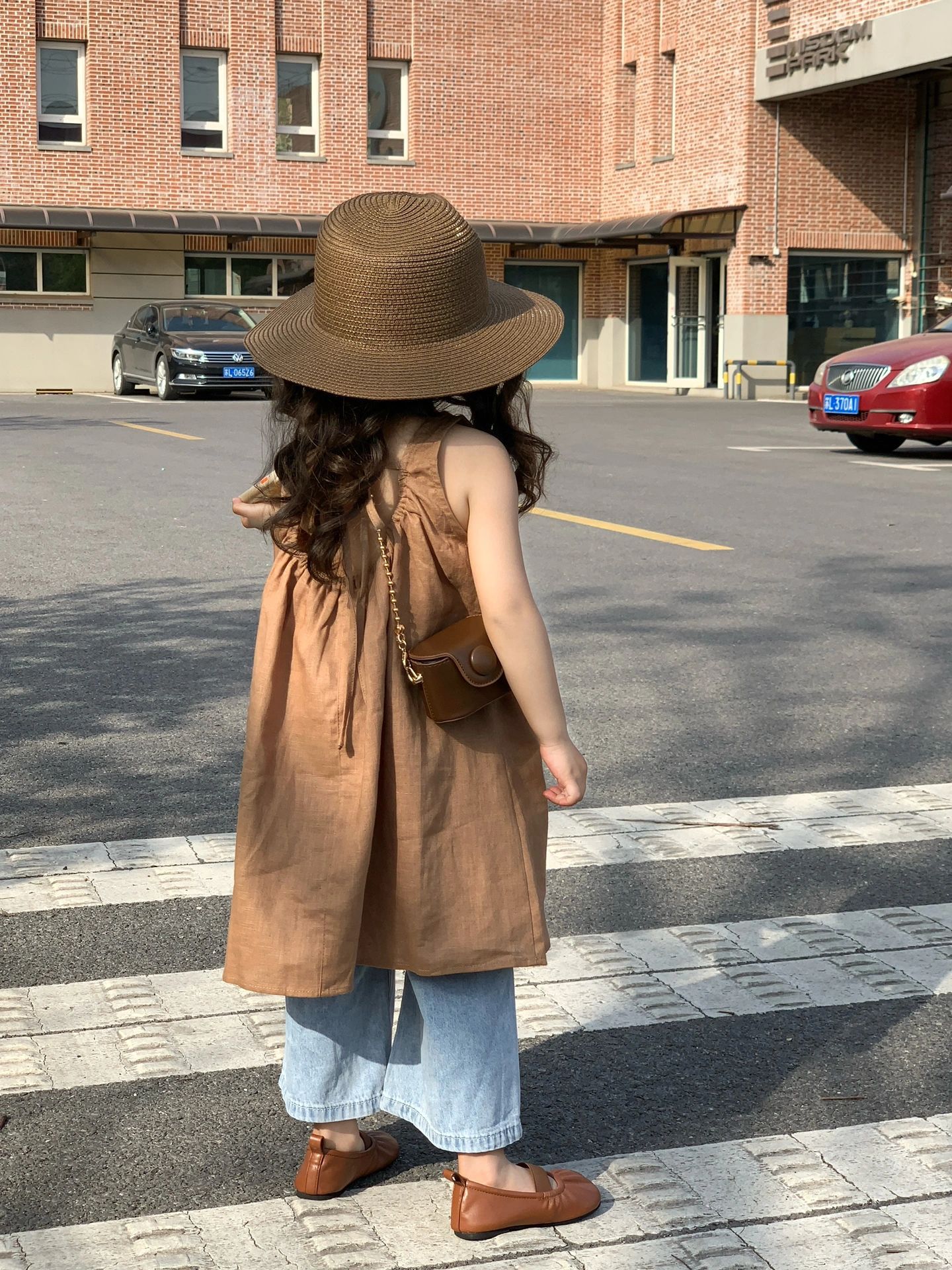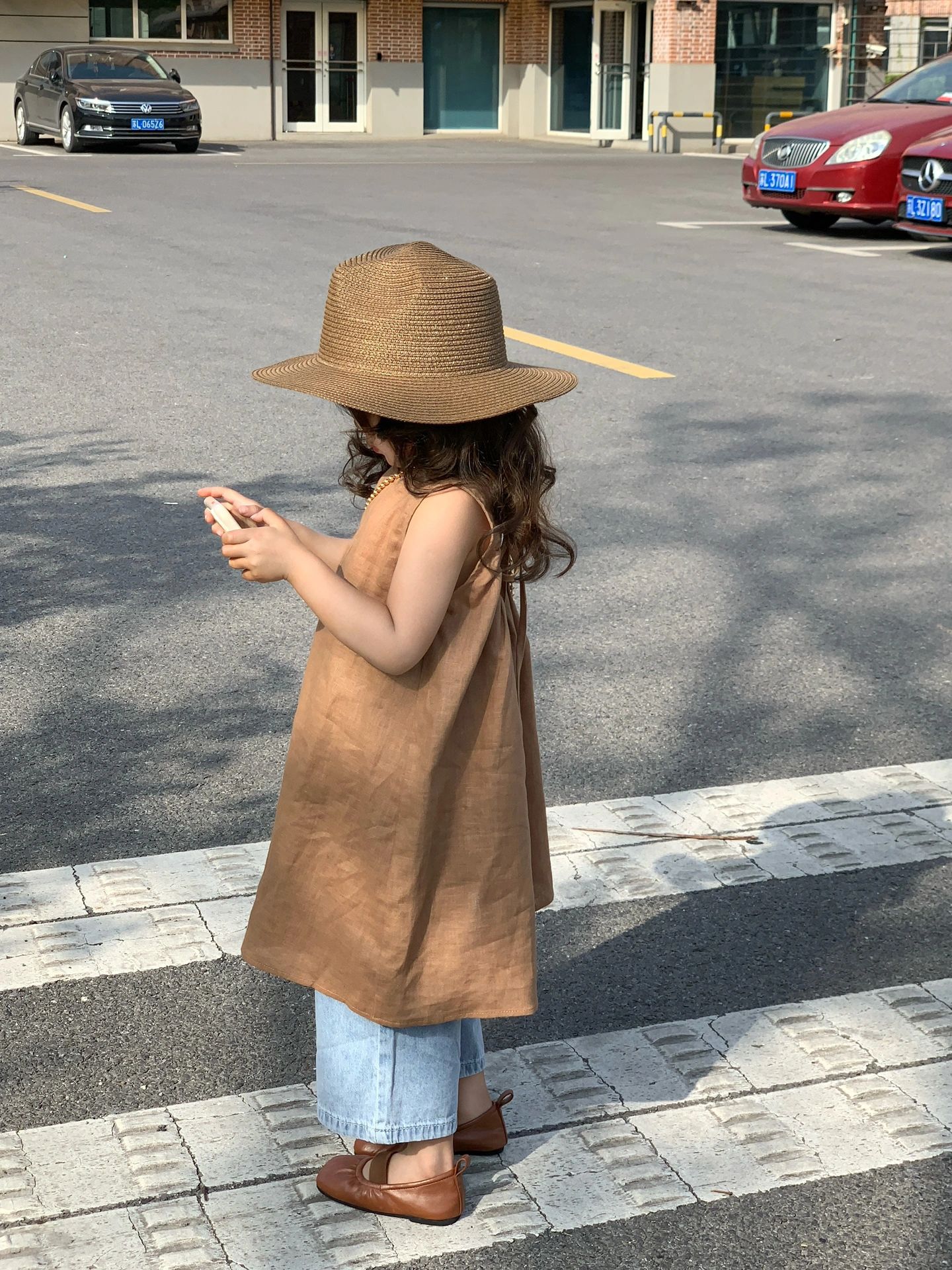 소녀의 여름 우아한 검열없는 백리스 린넨 원피스 느슨한 스트랩 원피스 하나의 버튼 청바지
