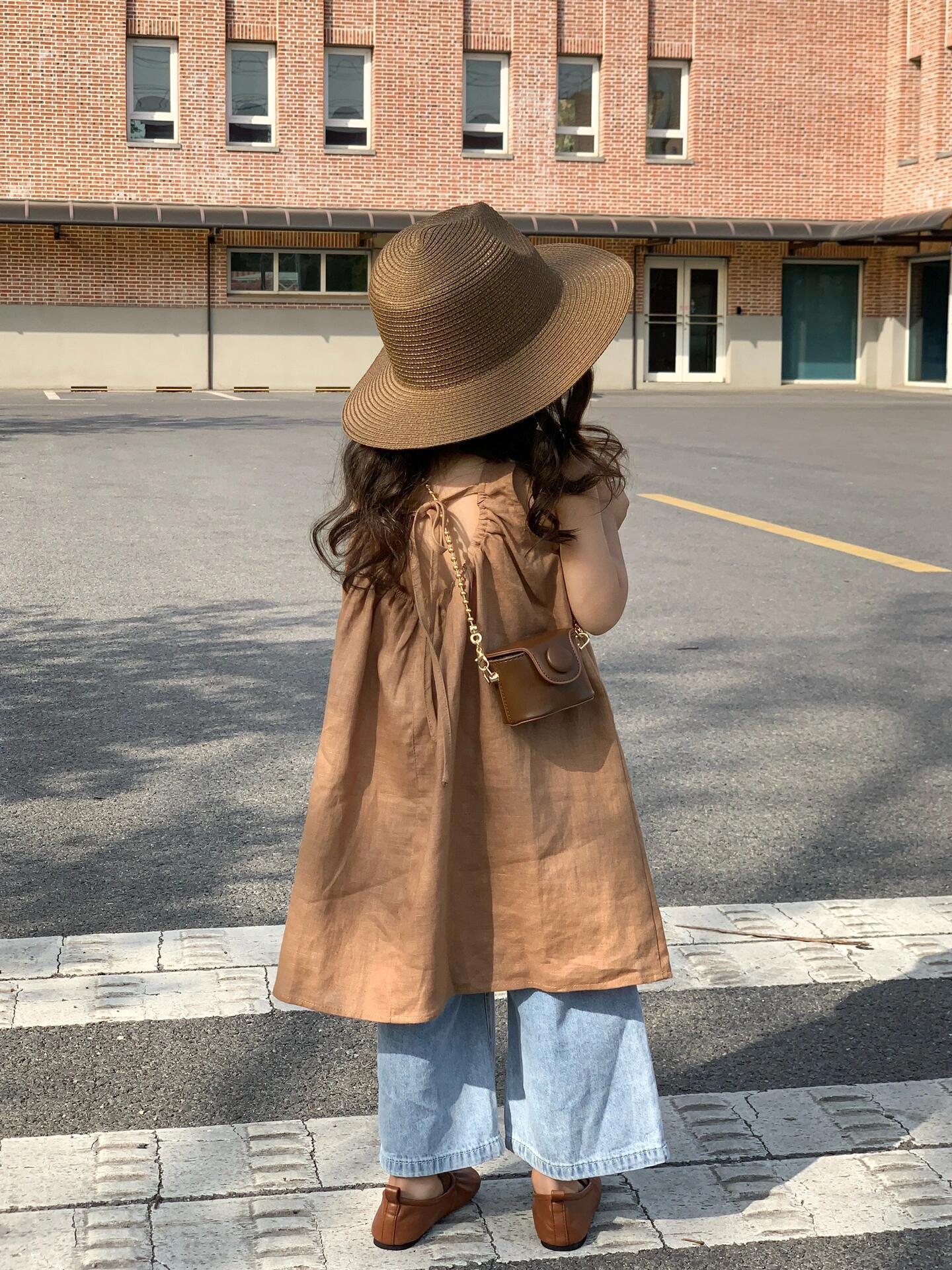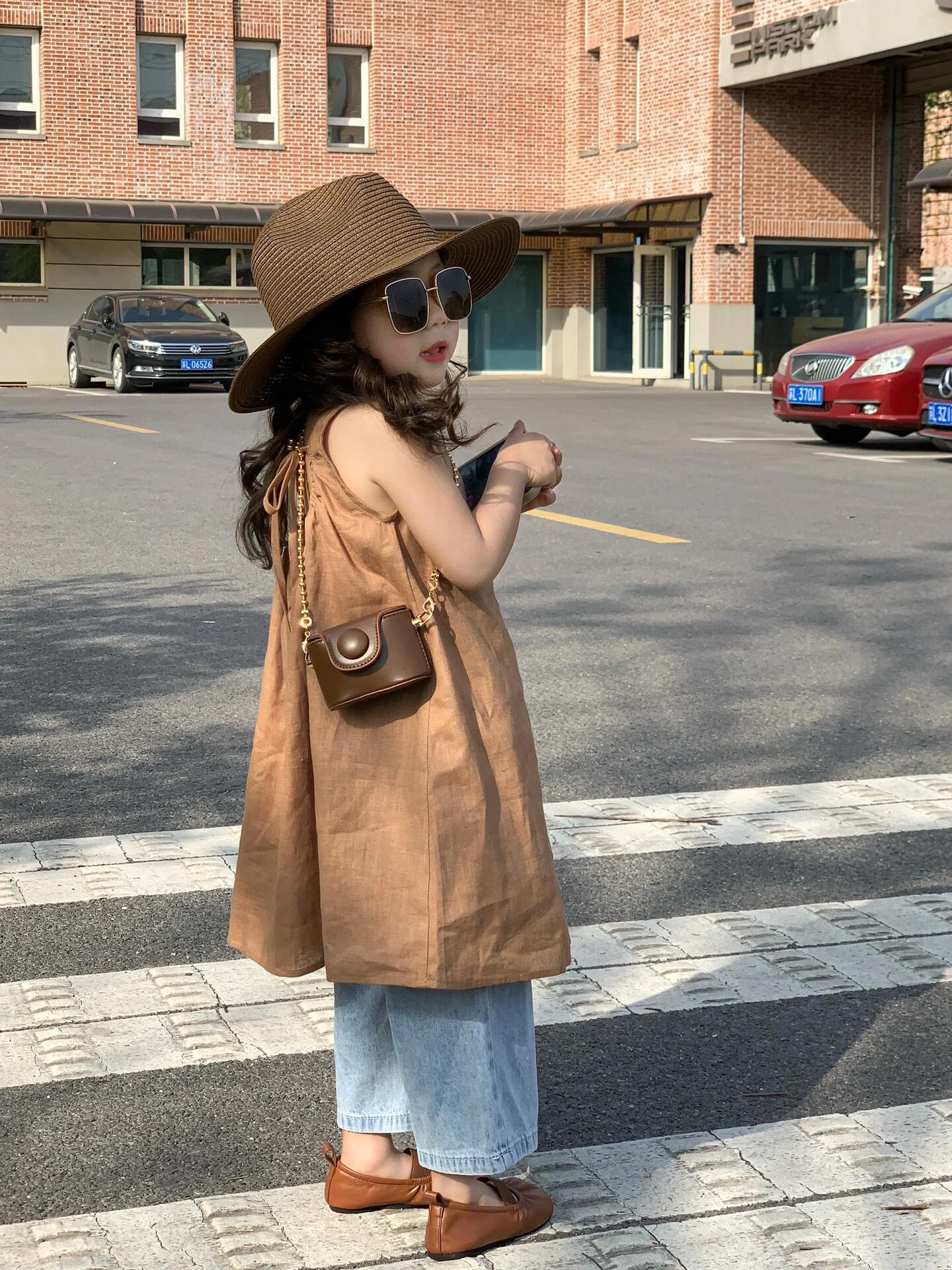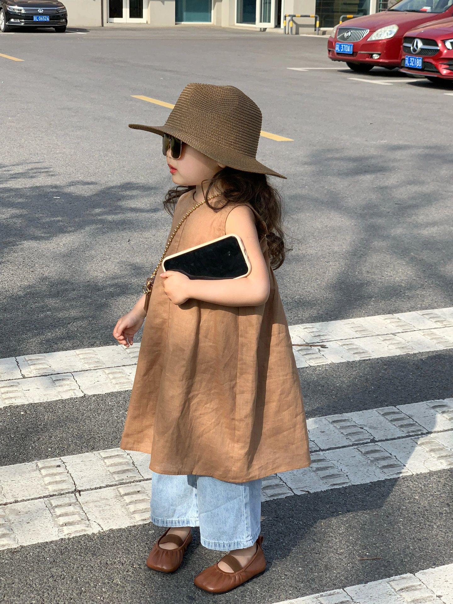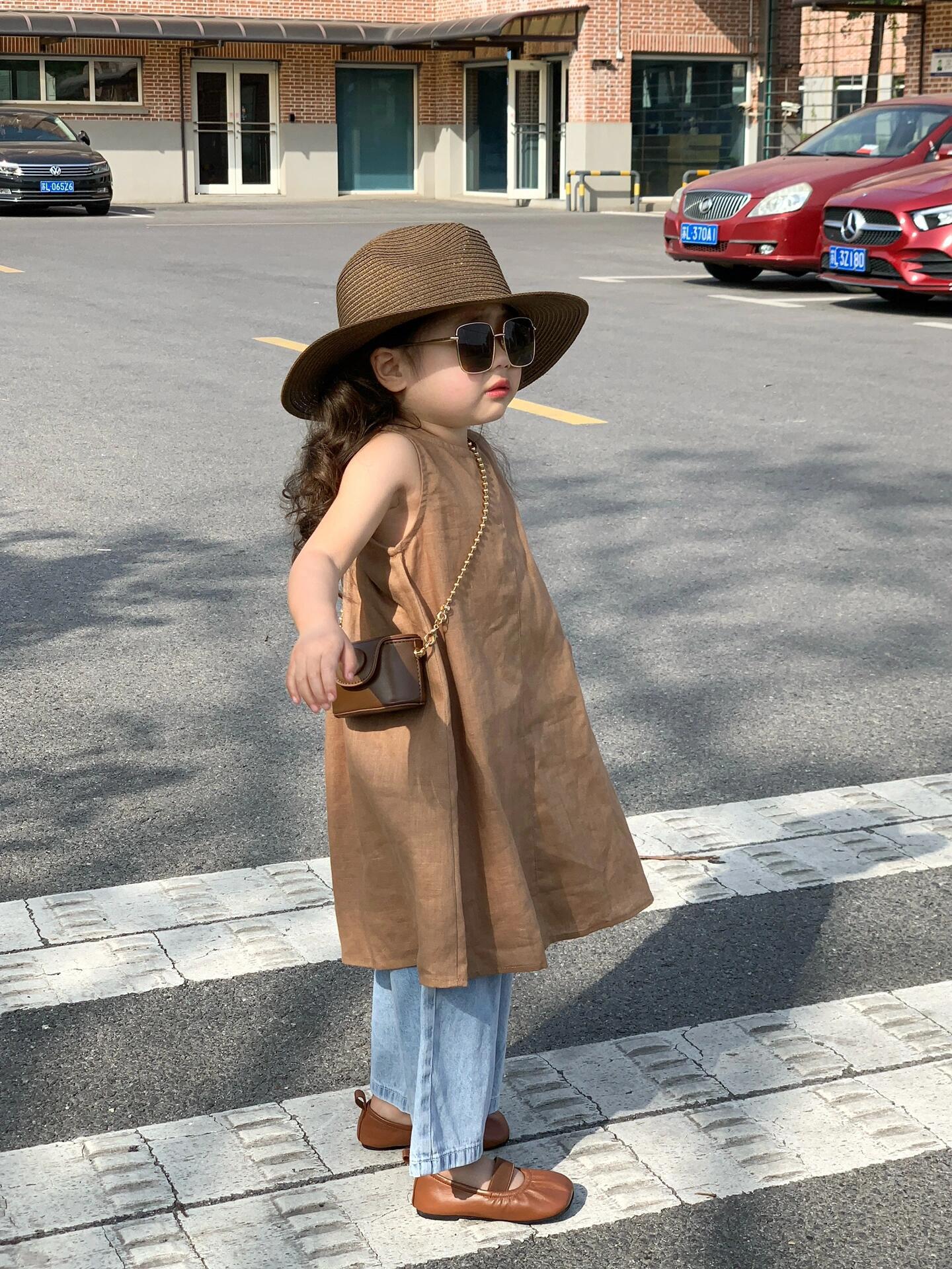 소녀의 여름 우아한 검열없는 백리스 린넨 원피스 느슨한 스트랩 원피스 하나의 버튼 청바지