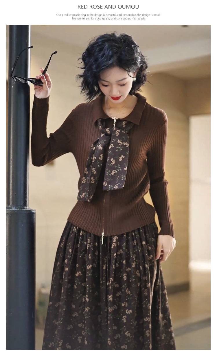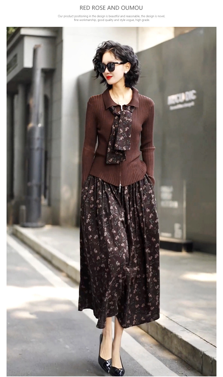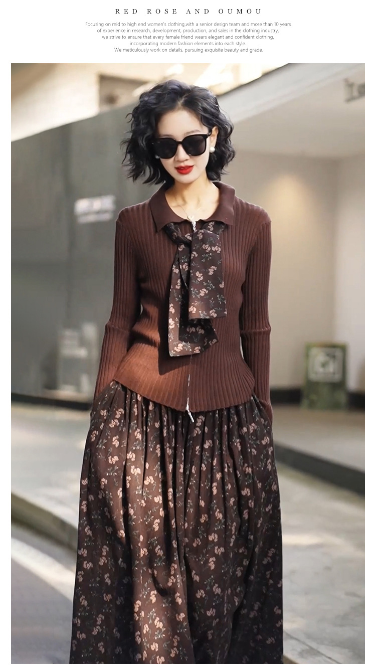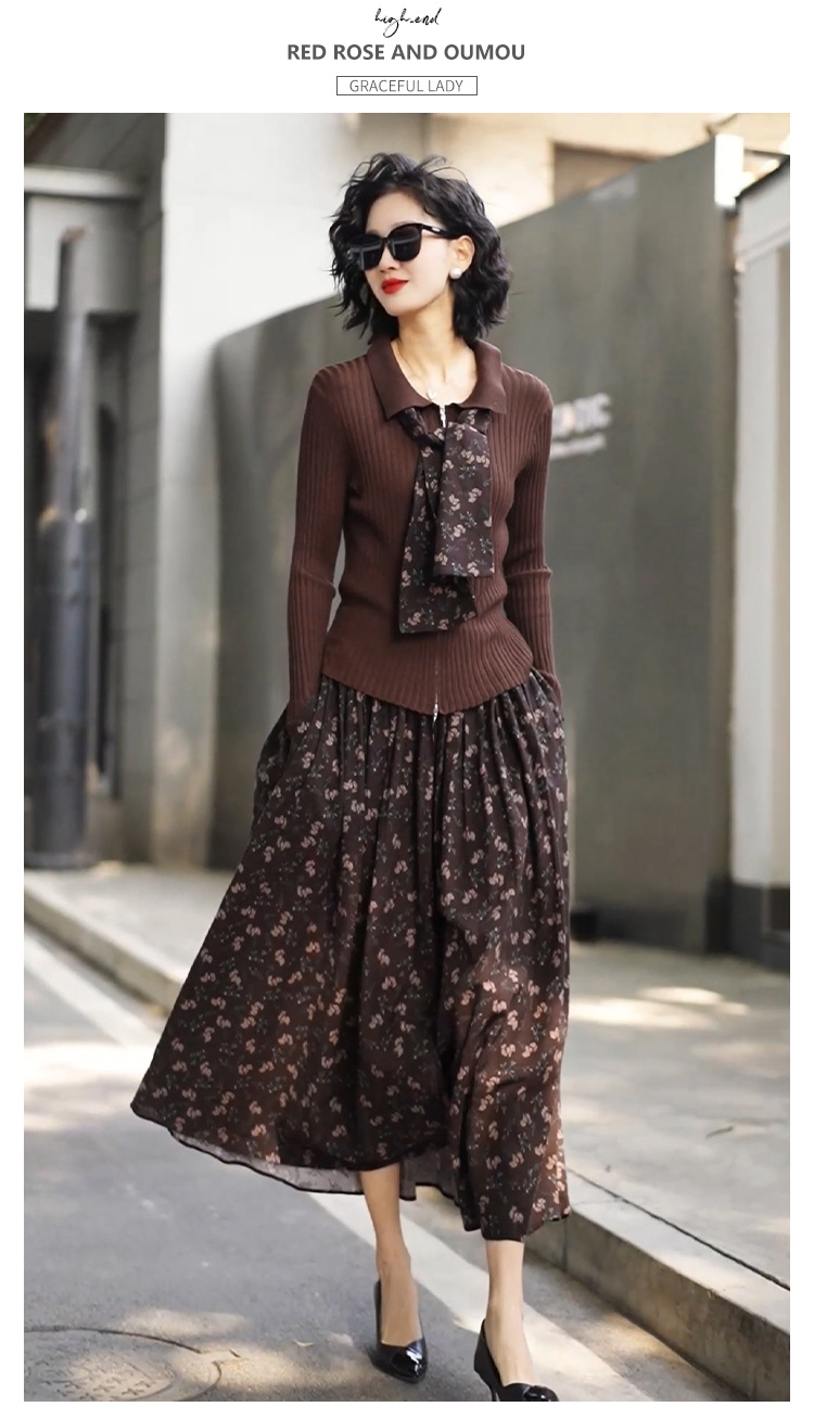 • 2333 커피탑 + K129 꽃무늬 스커트 (같은 스타일의 스카프 포함)