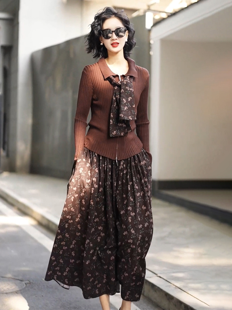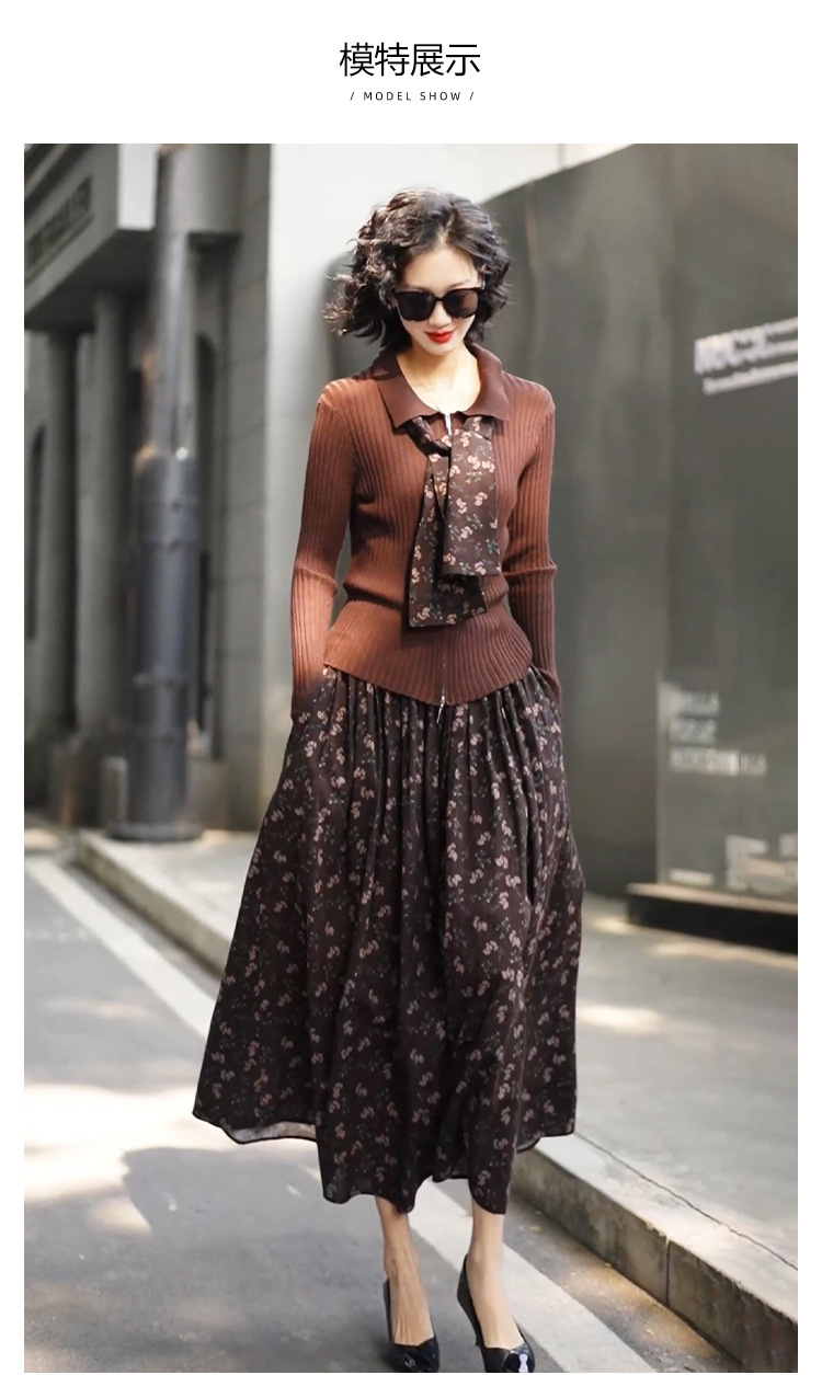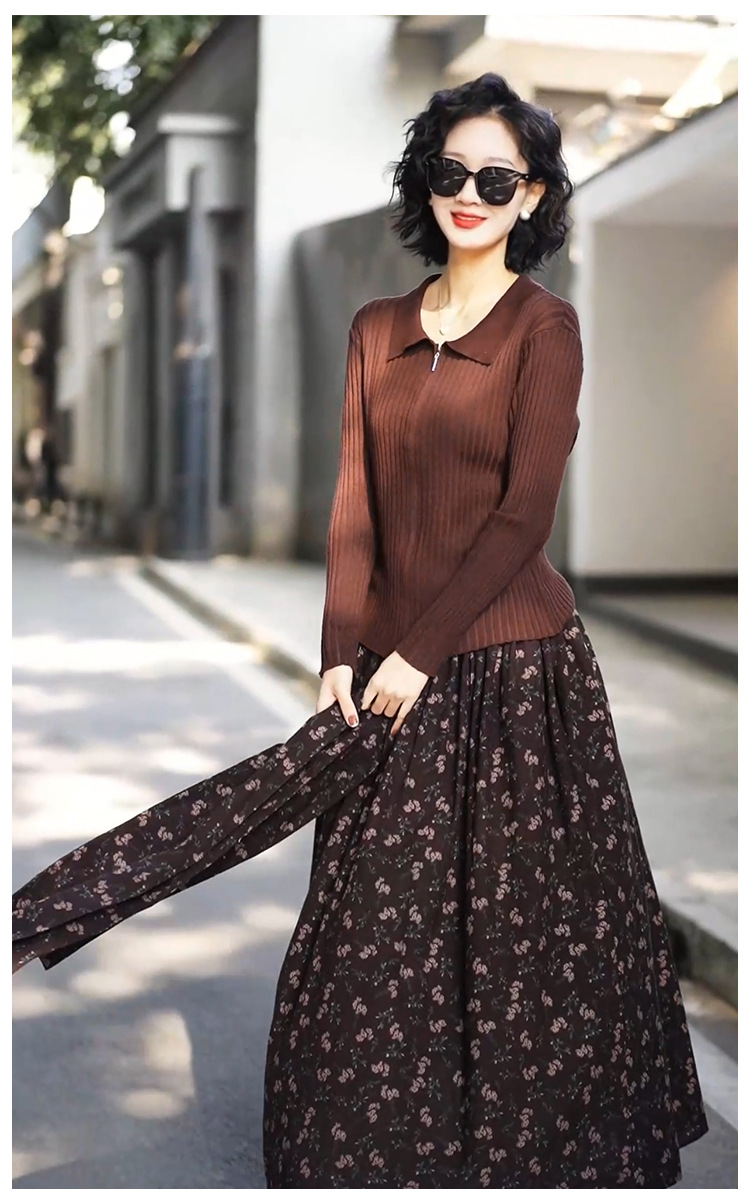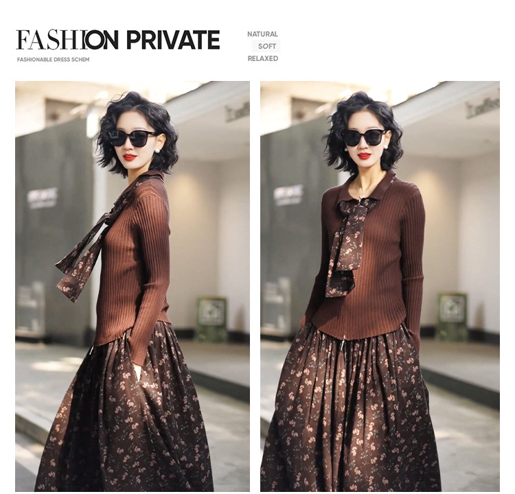 • 2333 커피탑 + K129 꽃무늬 스커트 (같은 스타일의 스카프 포함)