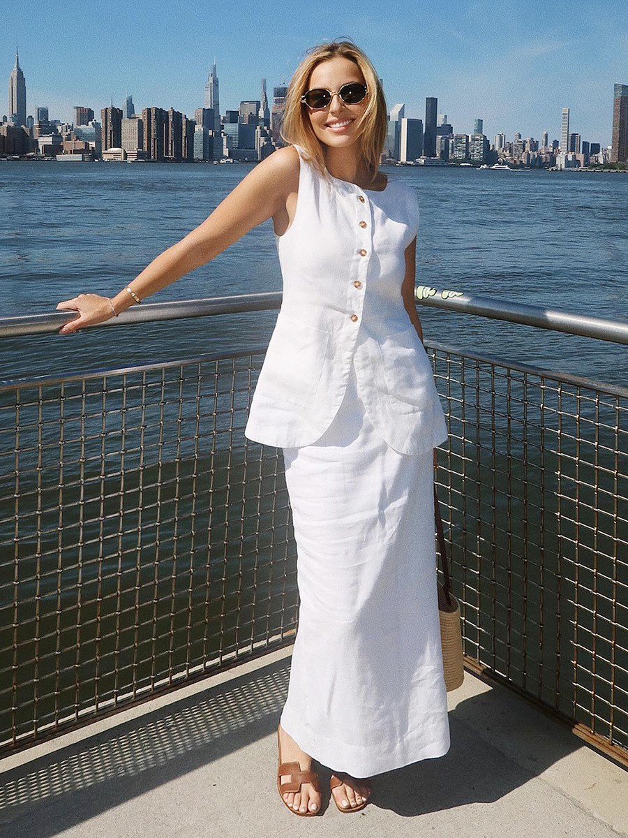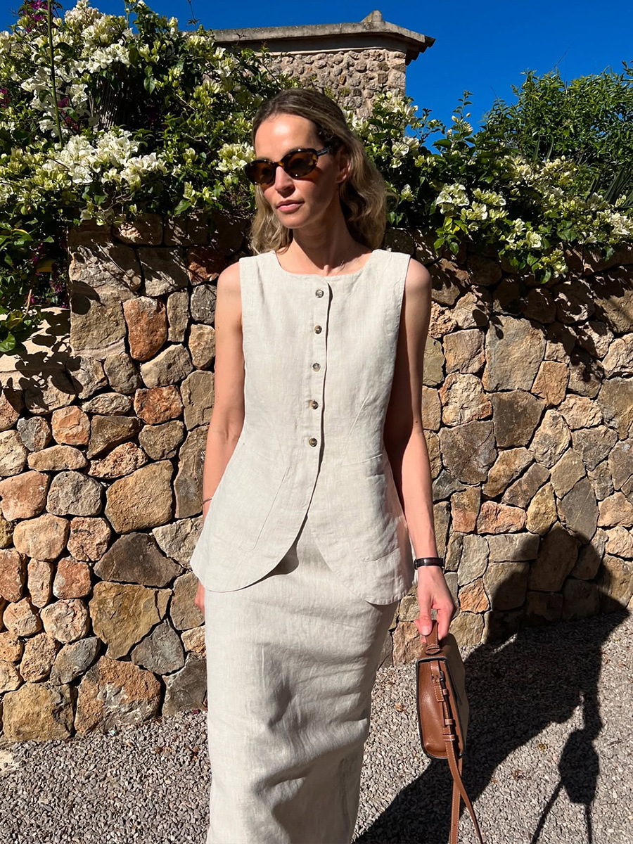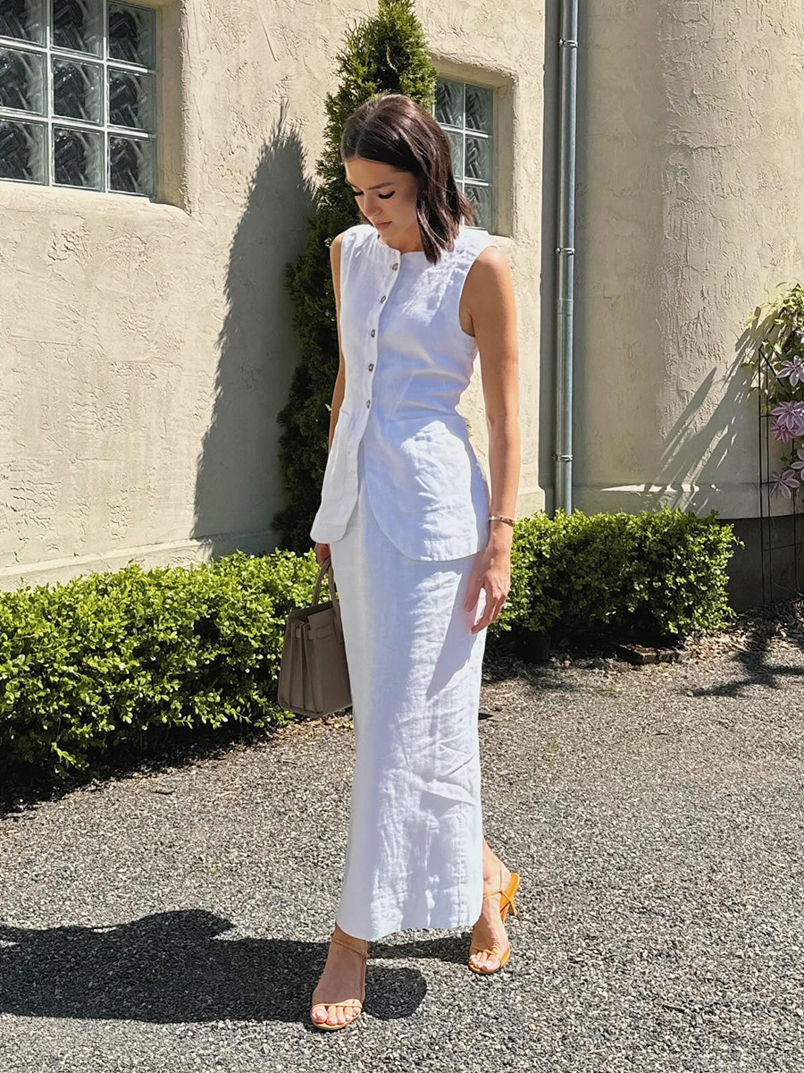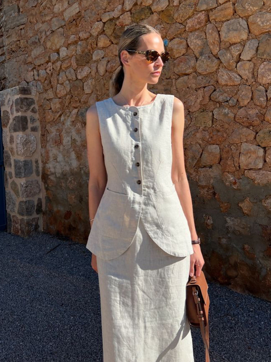 유럽과 미국 세트 국경 간 간단한 민소매 조끼 높은 허리 치마 2025 봄과 여름 새로운 린넨 캐주얼 세트 여성스토어 가기