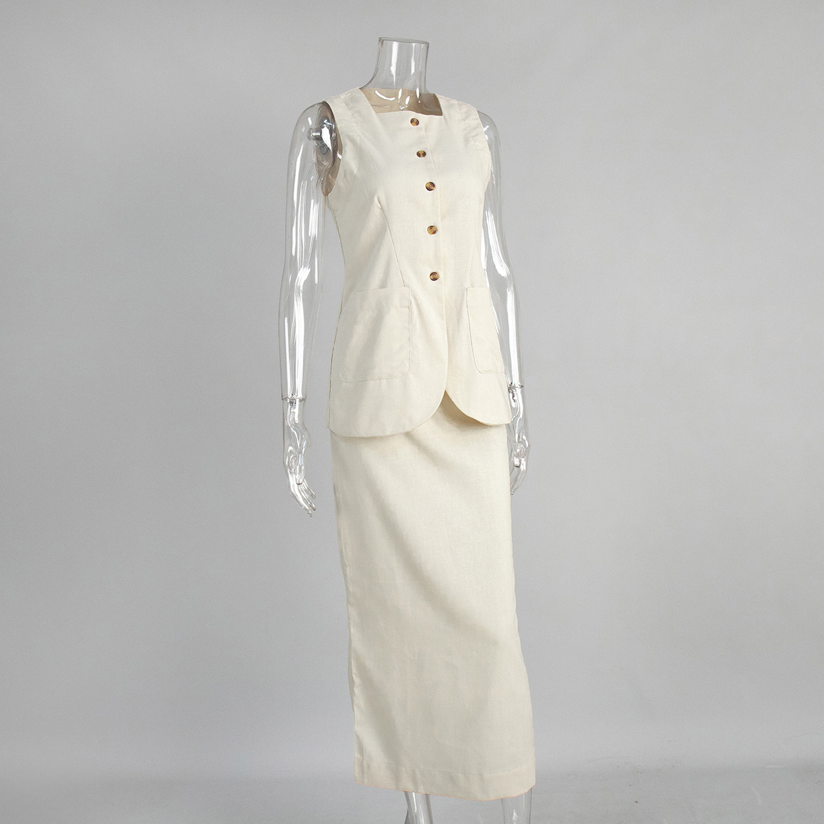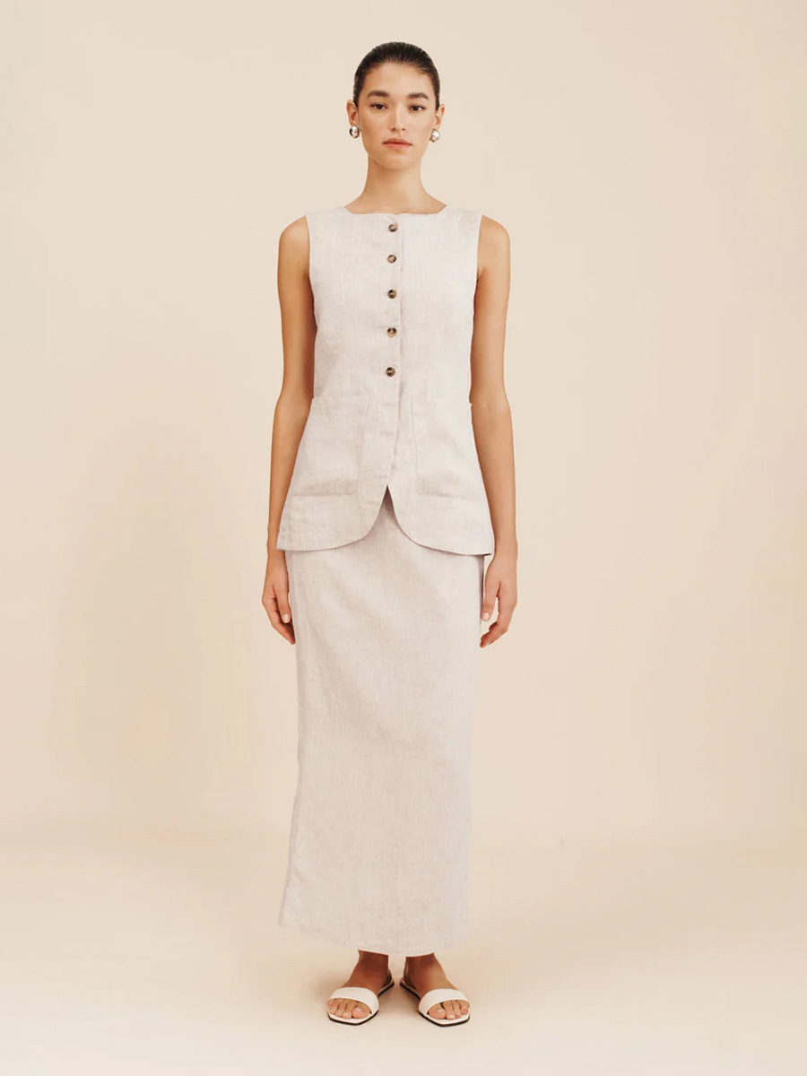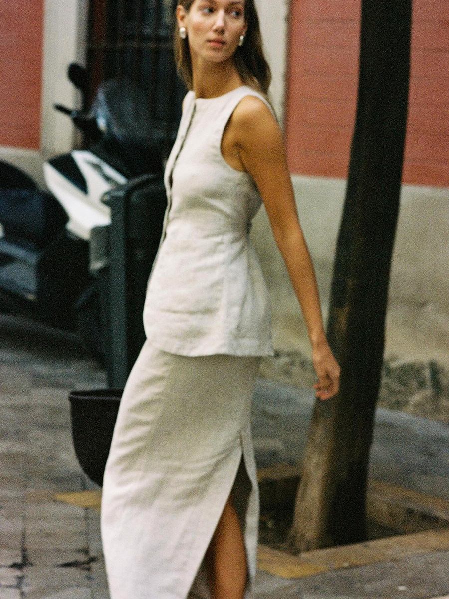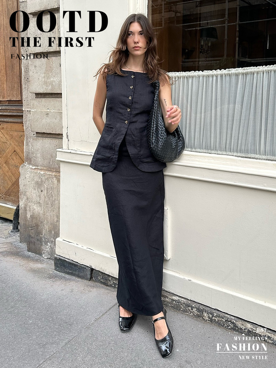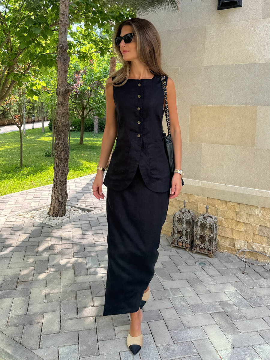 유럽과 미국 세트 국경 간 간단한 민소매 조끼 높은 허리 치마 2025 봄과 여름 새로운 린넨 캐주얼 세트 여성