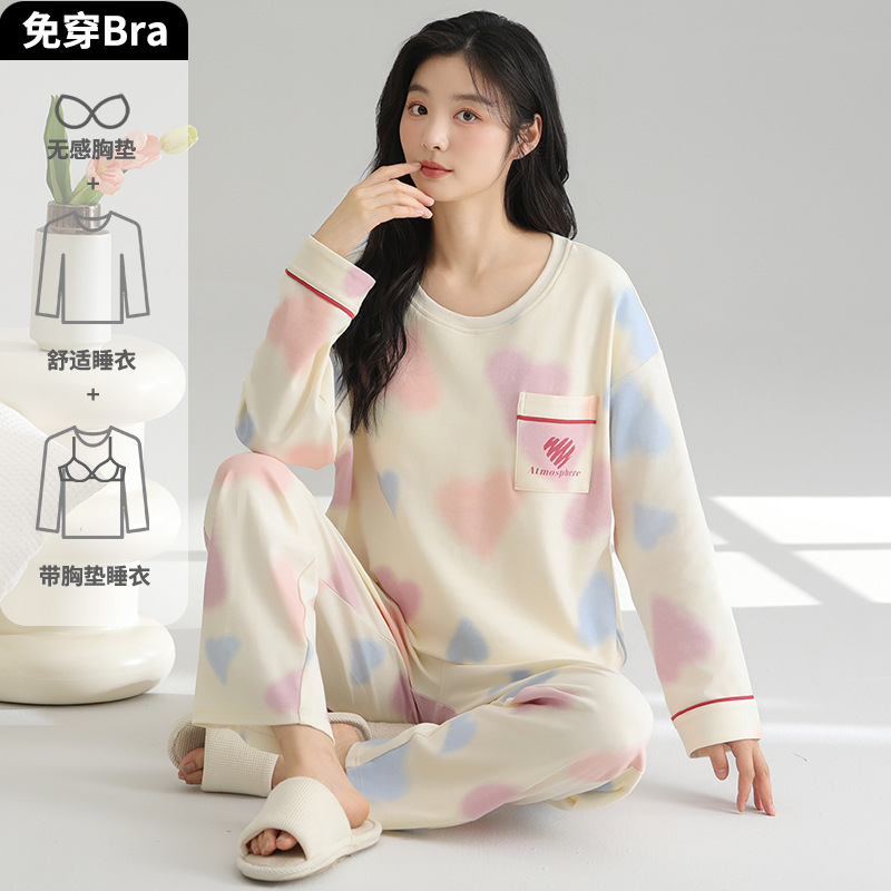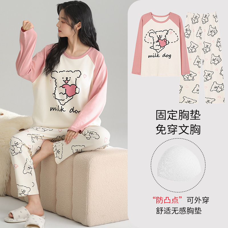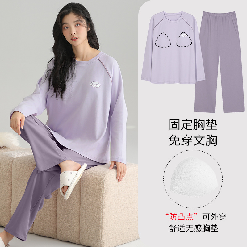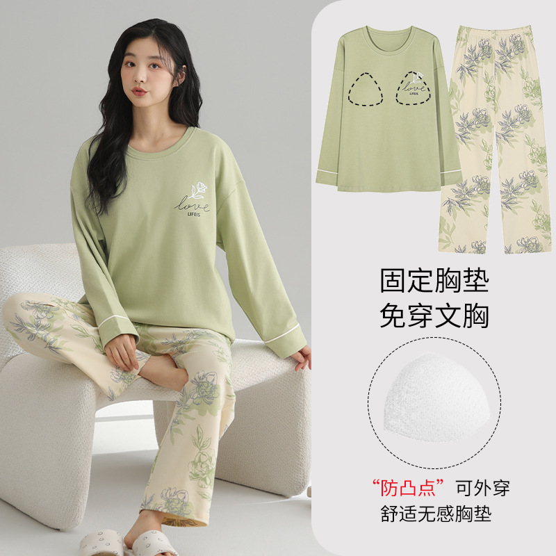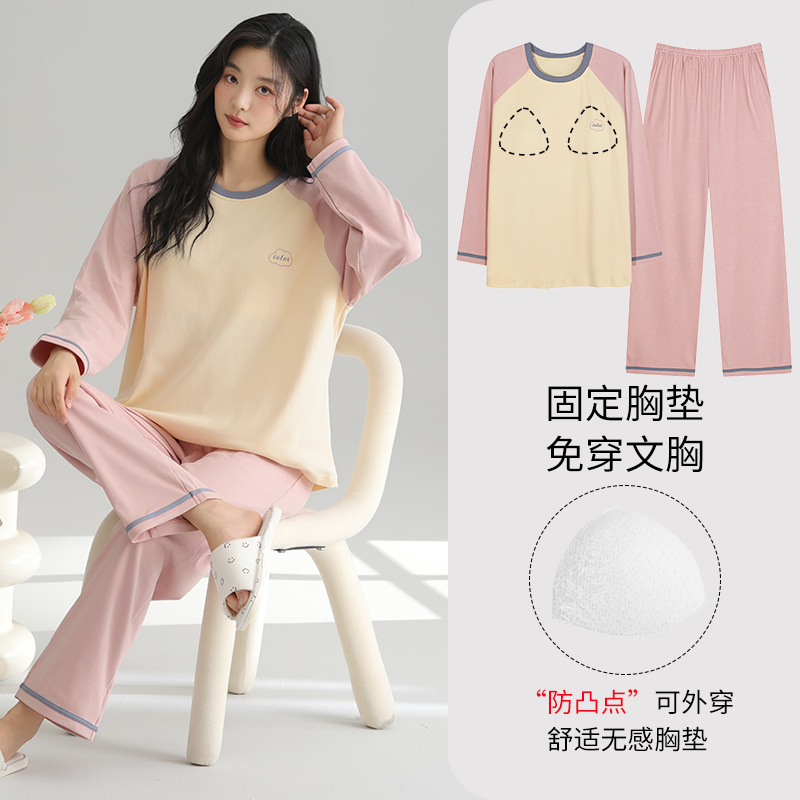 2025 새로운 잠옷 여성의 봄과 가을 긴 소매 바지 세트 겨울 1 대 1 홈 옷을 입고 가슴 패드 외부와 면화