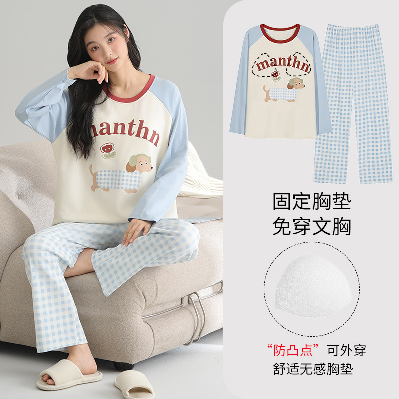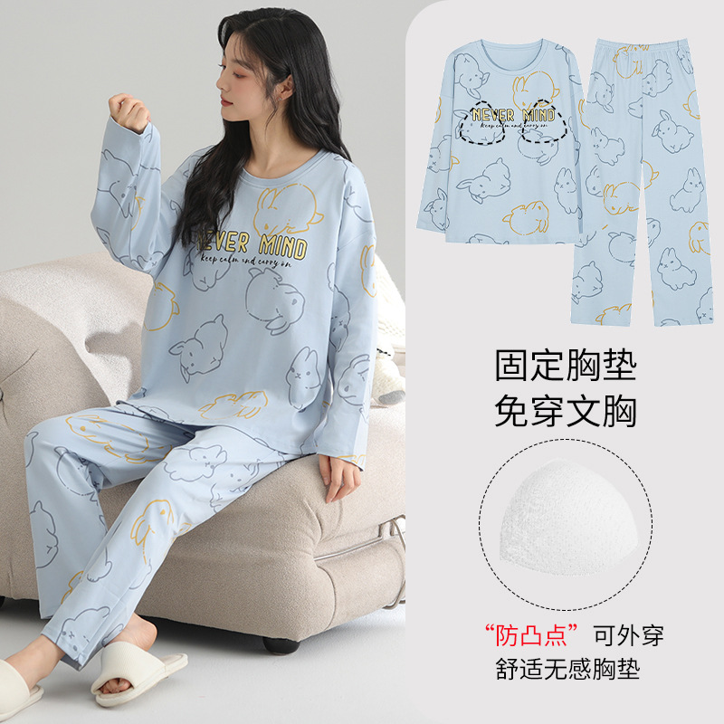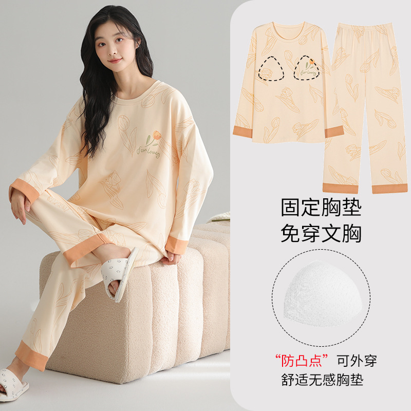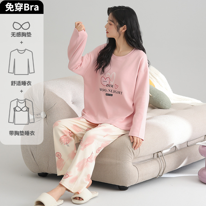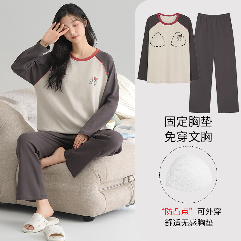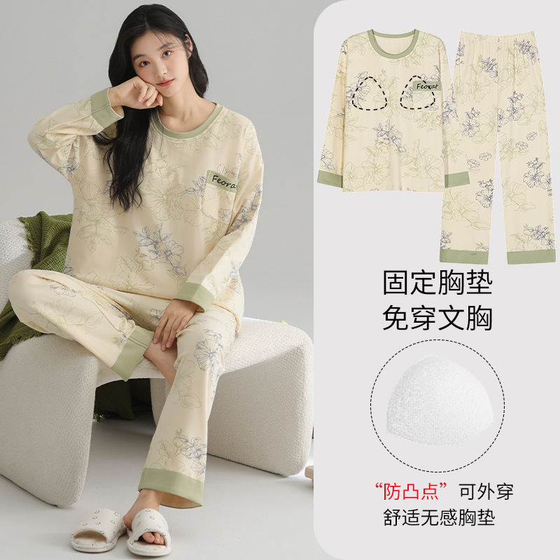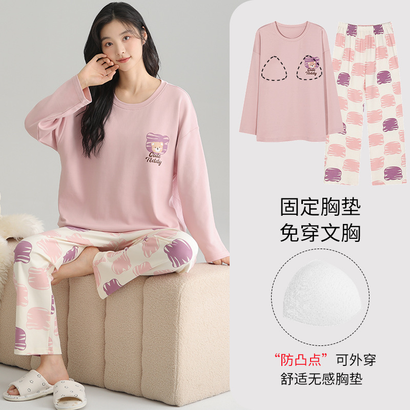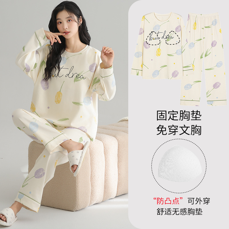 2025 새로운 잠옷 여성의 봄과 가을 긴 소매 바지 세트 겨울 1 대 1 홈 옷을 입고 가슴 패드 외부와 면화스토어 가기