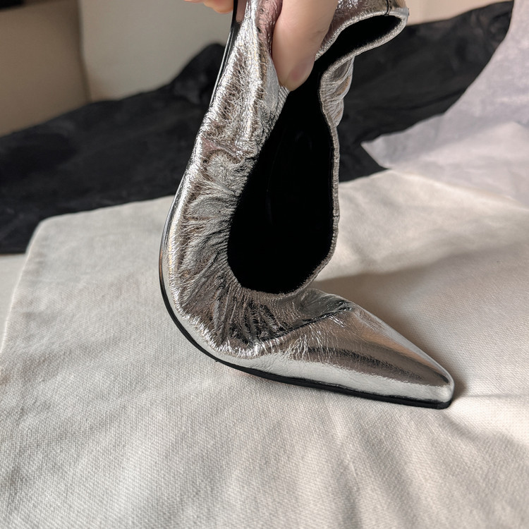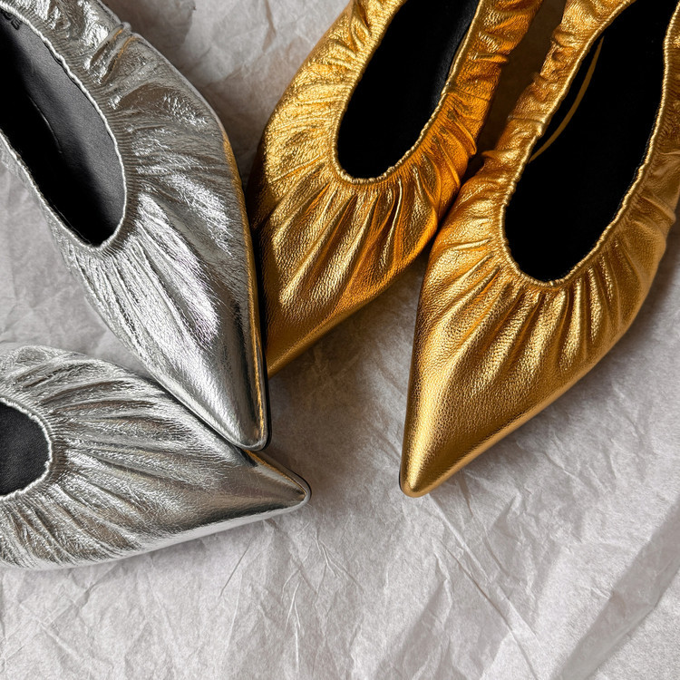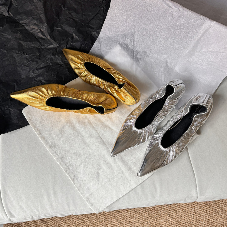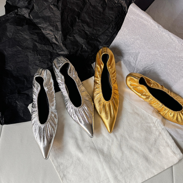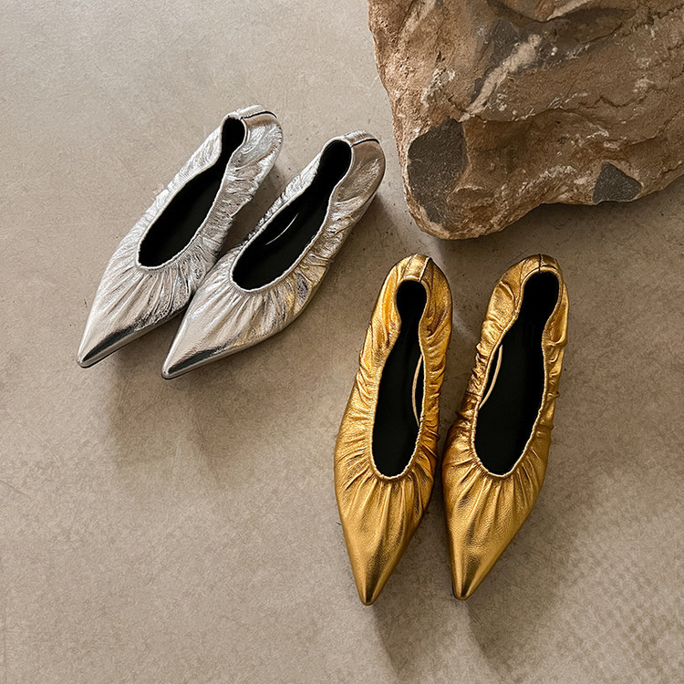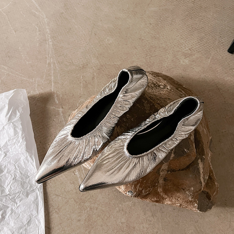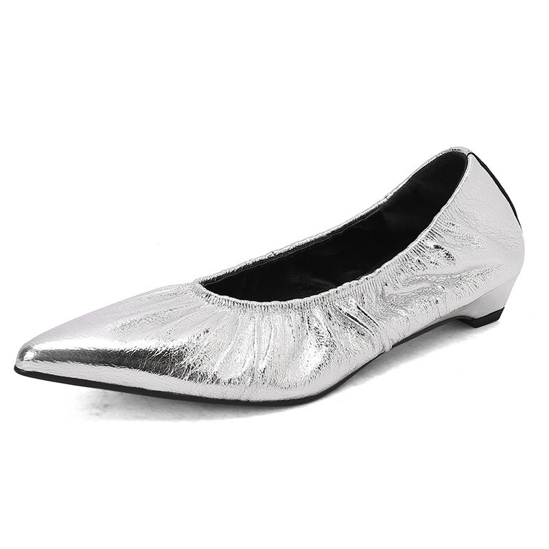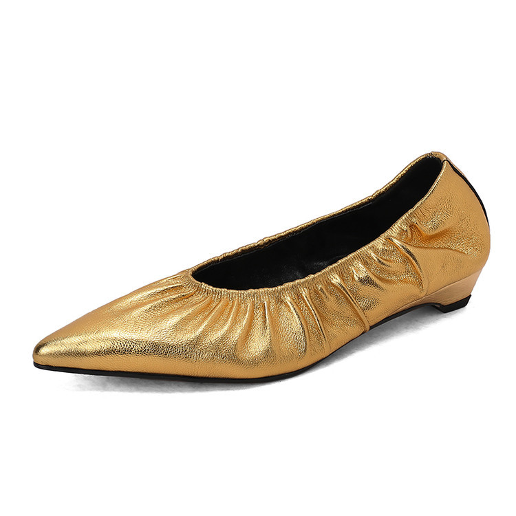 한국식 양가죽 스몰 골드 신발 뾰족한 발가락 로우 탑 싱글 레이어 신발 이른 봄 새 도착 풀 가죽 주름 로우 힐 실버 여성 싱글 레이어 신발