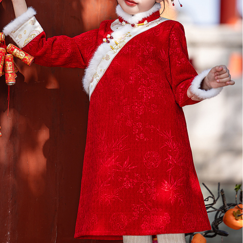 여자 중국 스타일 중국 치파오 겨울 Hanfu 빨간 드레스 어린이 공주 플러스 벨벳